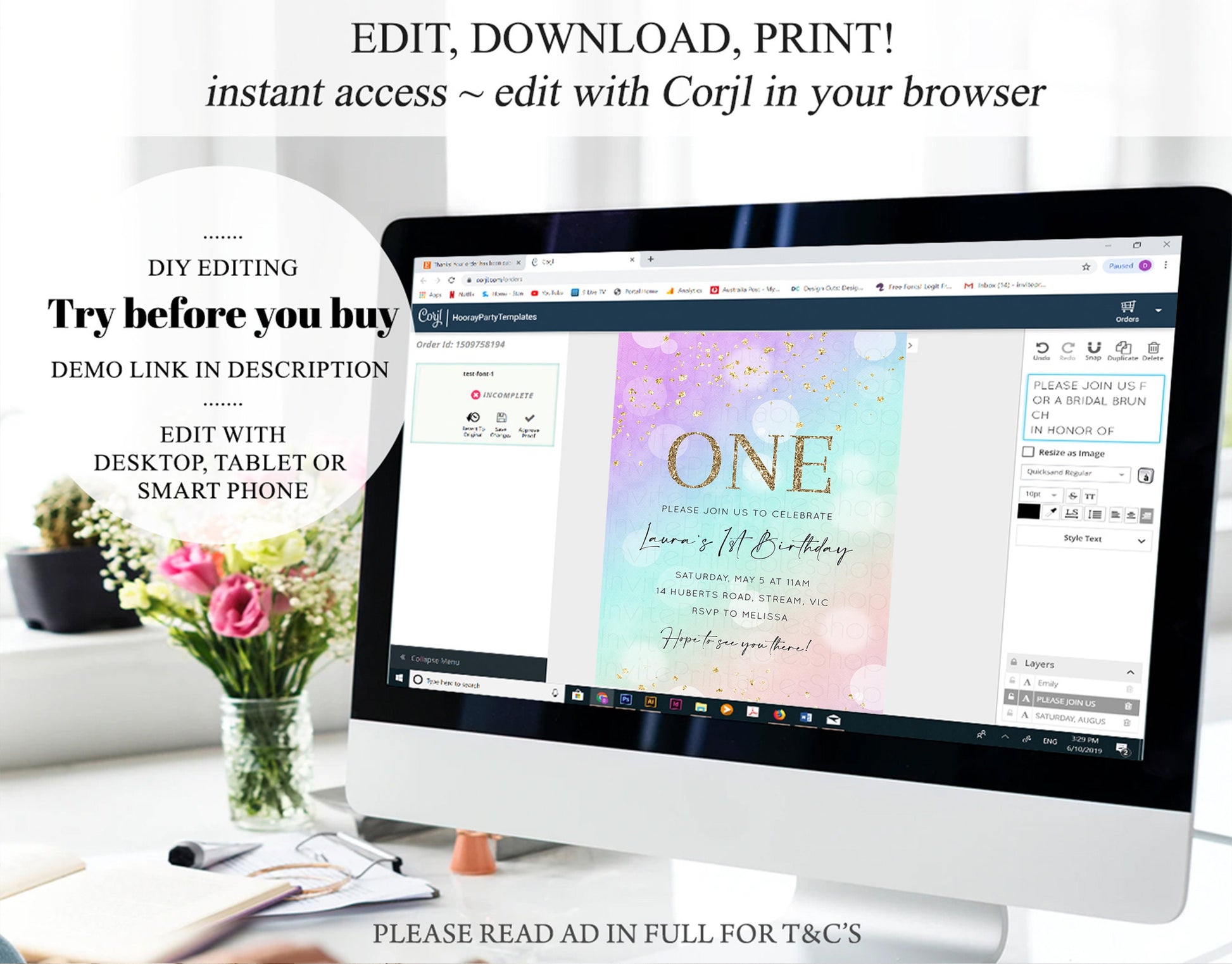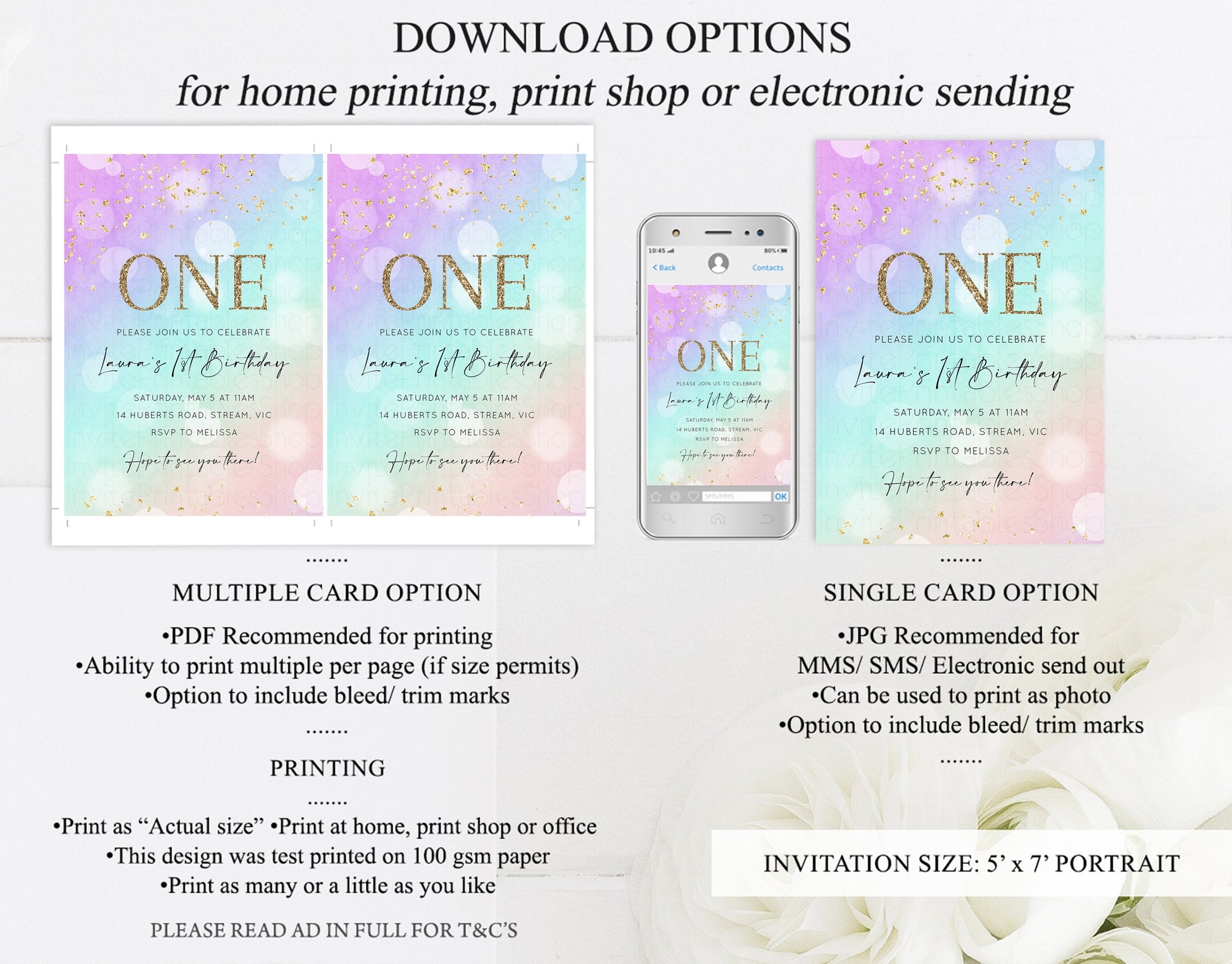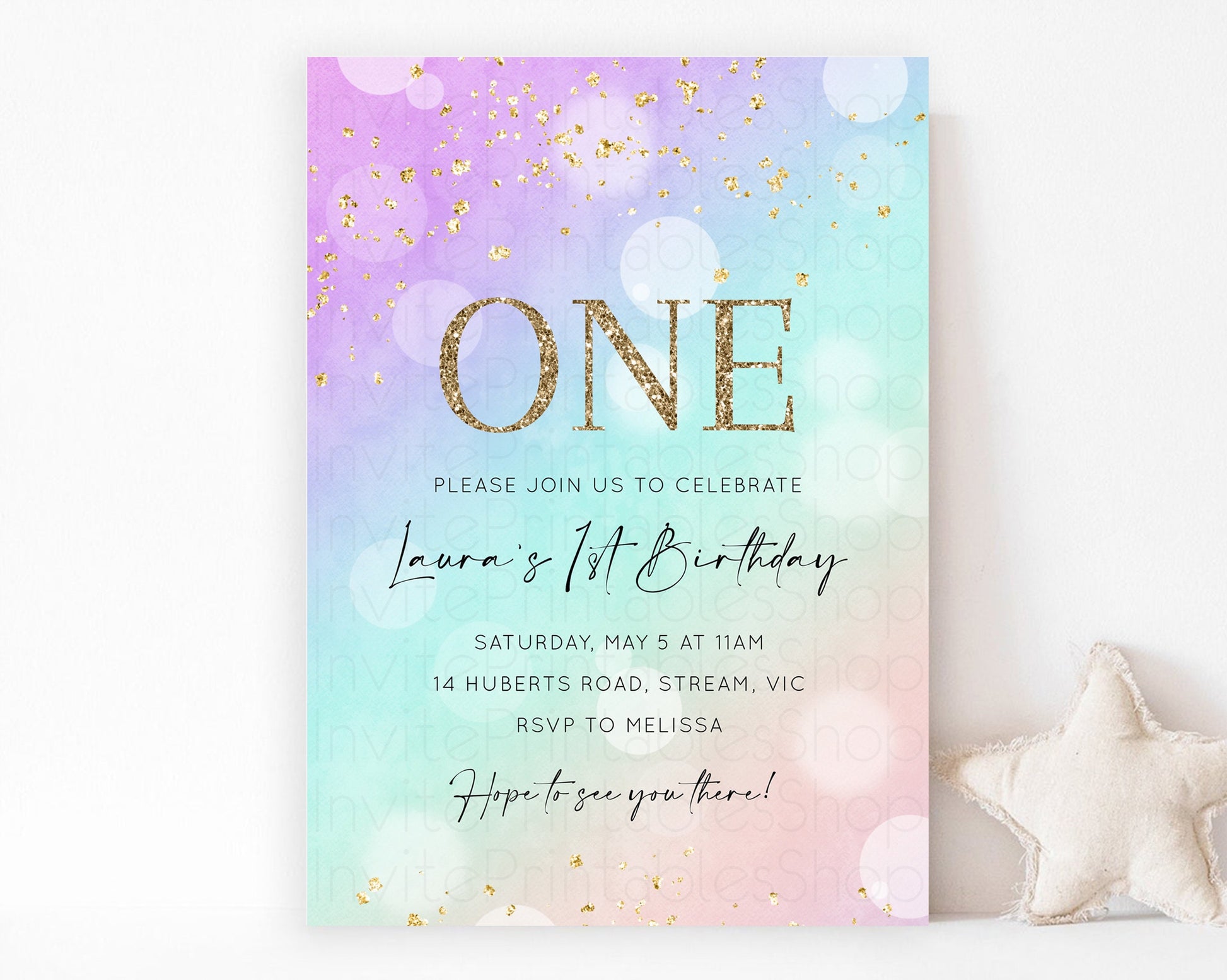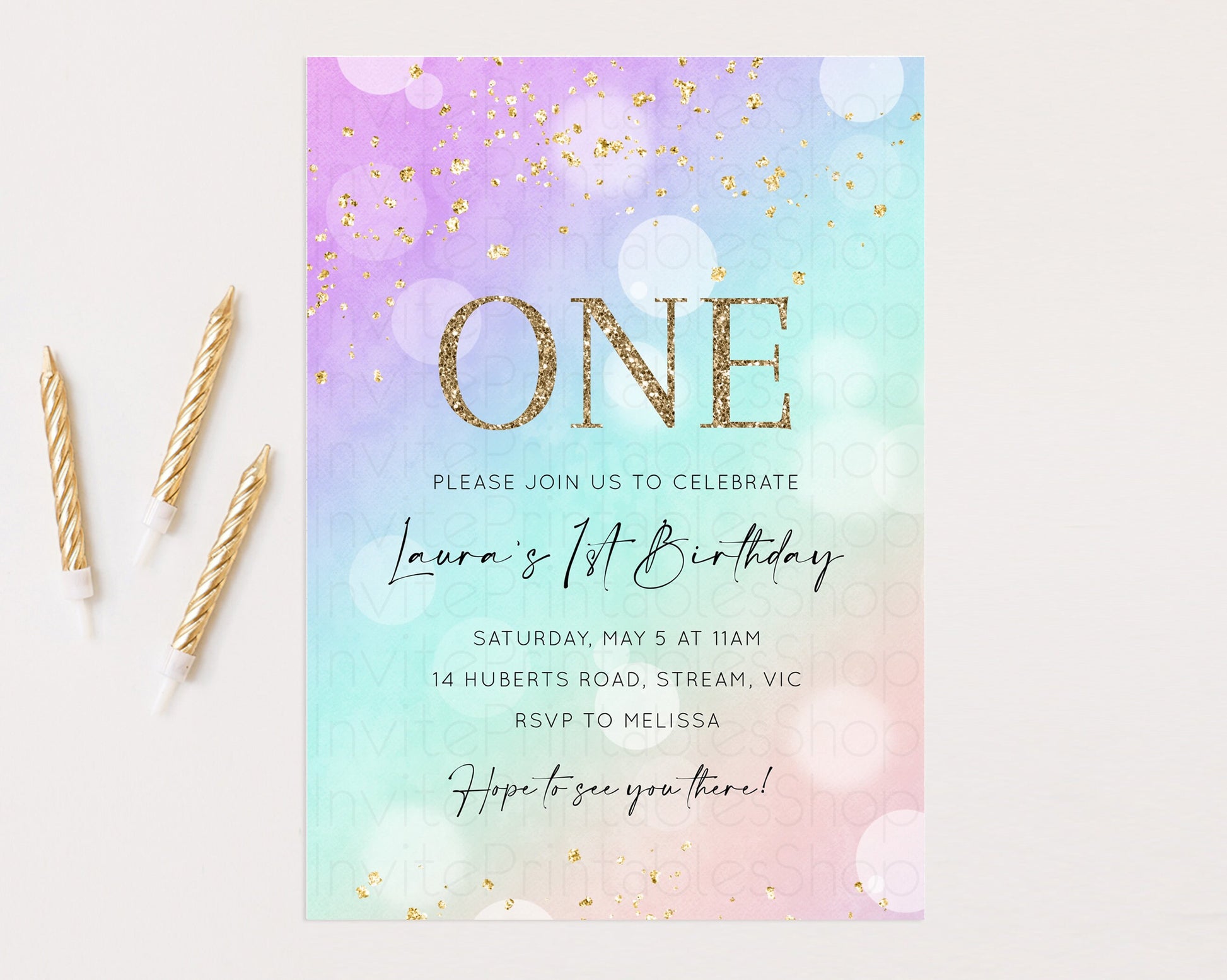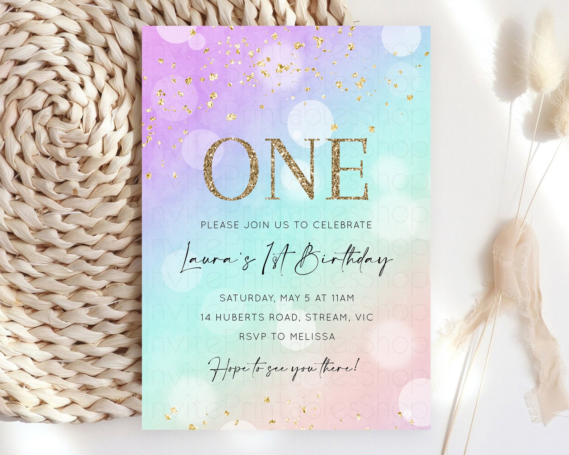 Rainbow Birthday Invitation Pastel Birthday Invite Ombre Watercolor Invite Enchanted Theme Colorful Splash Glitter Sprinkles 1st 2nd 3rd