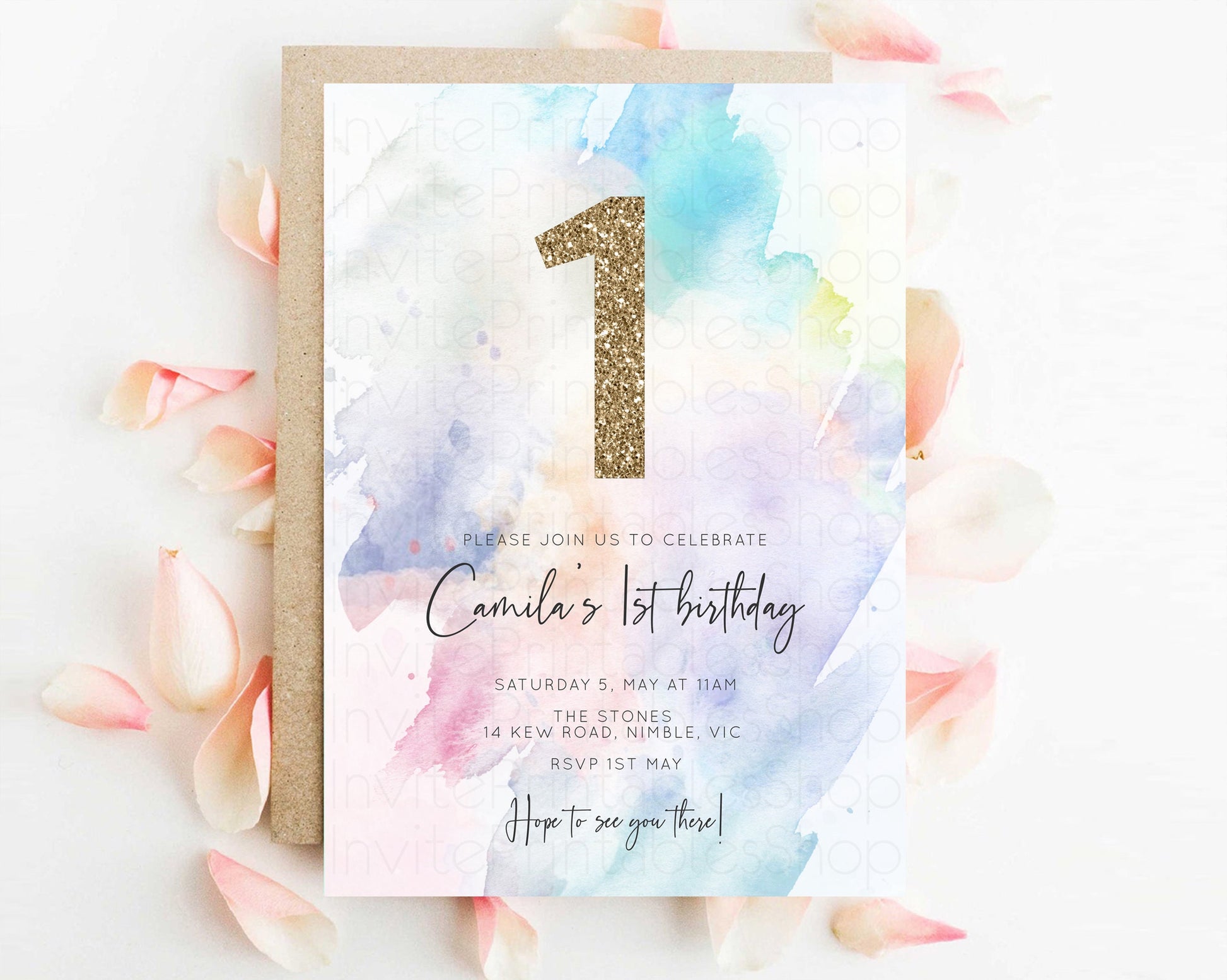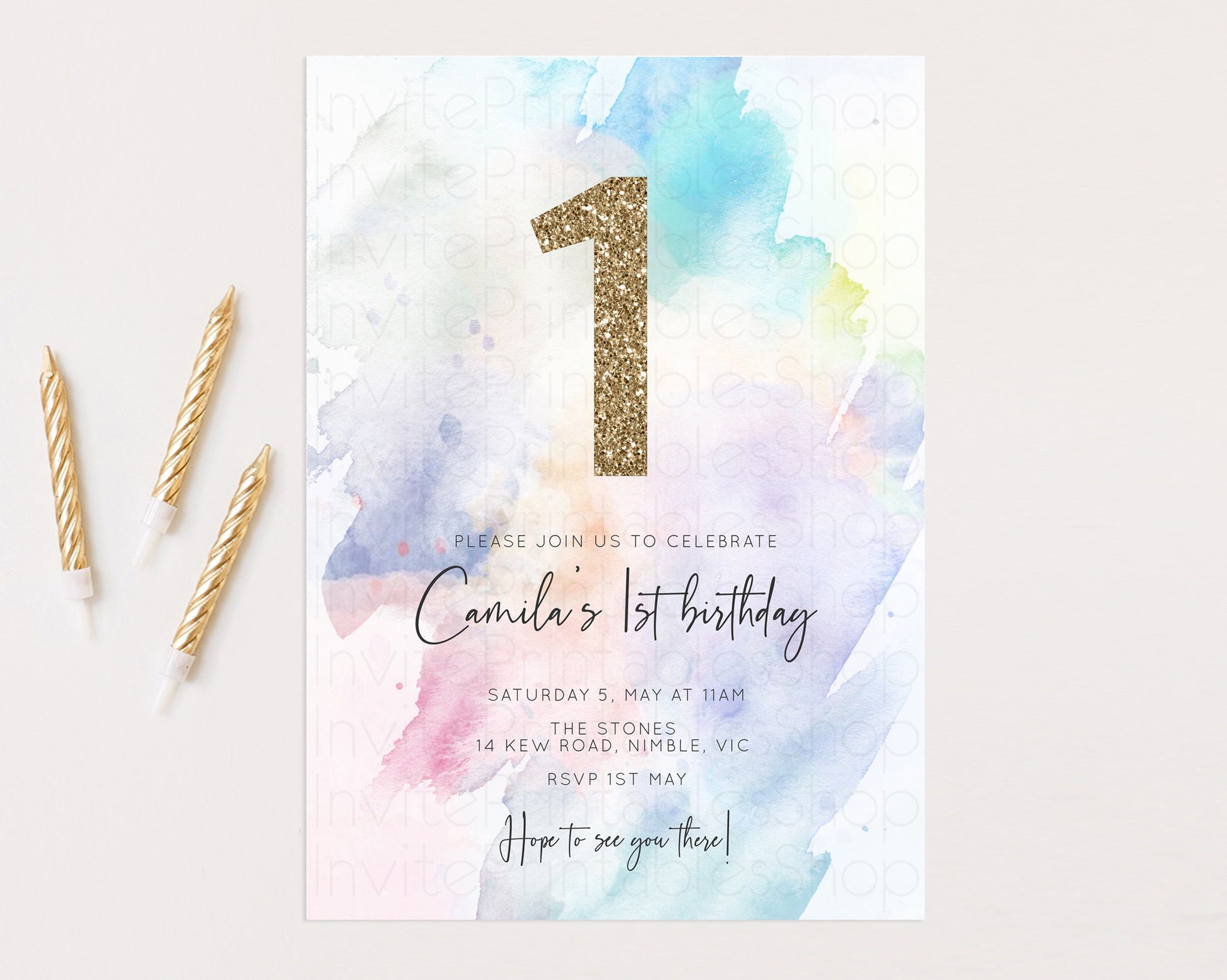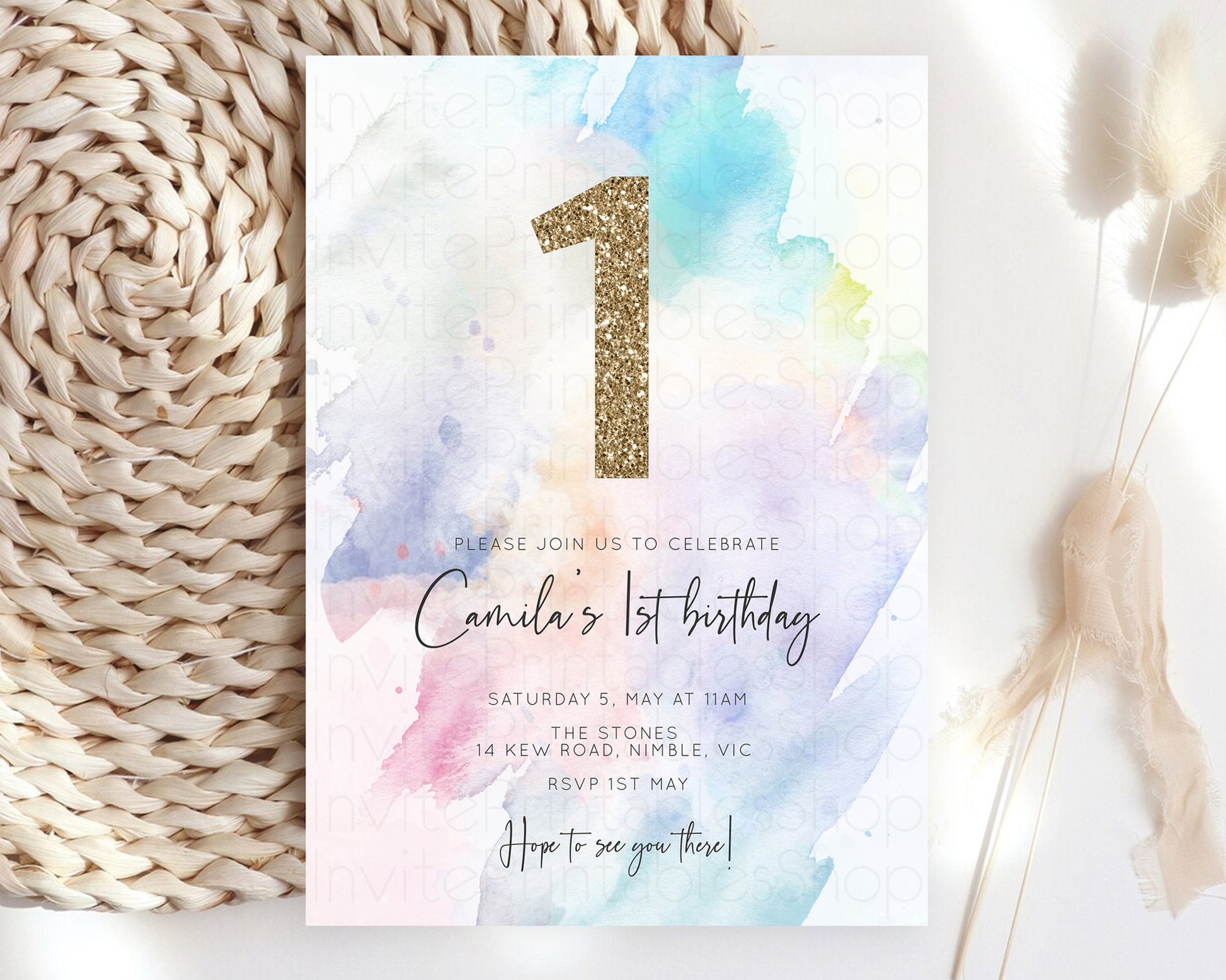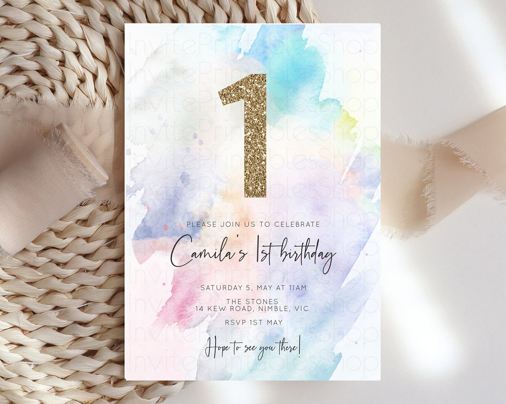 Rainbow Birthday Invitation Pastel Birthday Invite Ombre Watercolor Invite Enchanted Theme Colorful Splash Glitter Sprinkles 1st 2nd 3rd