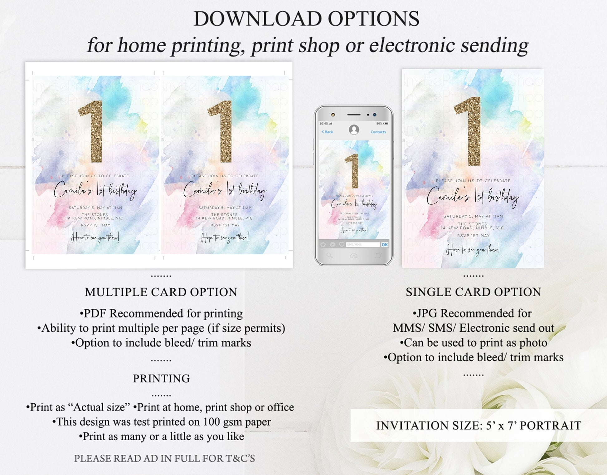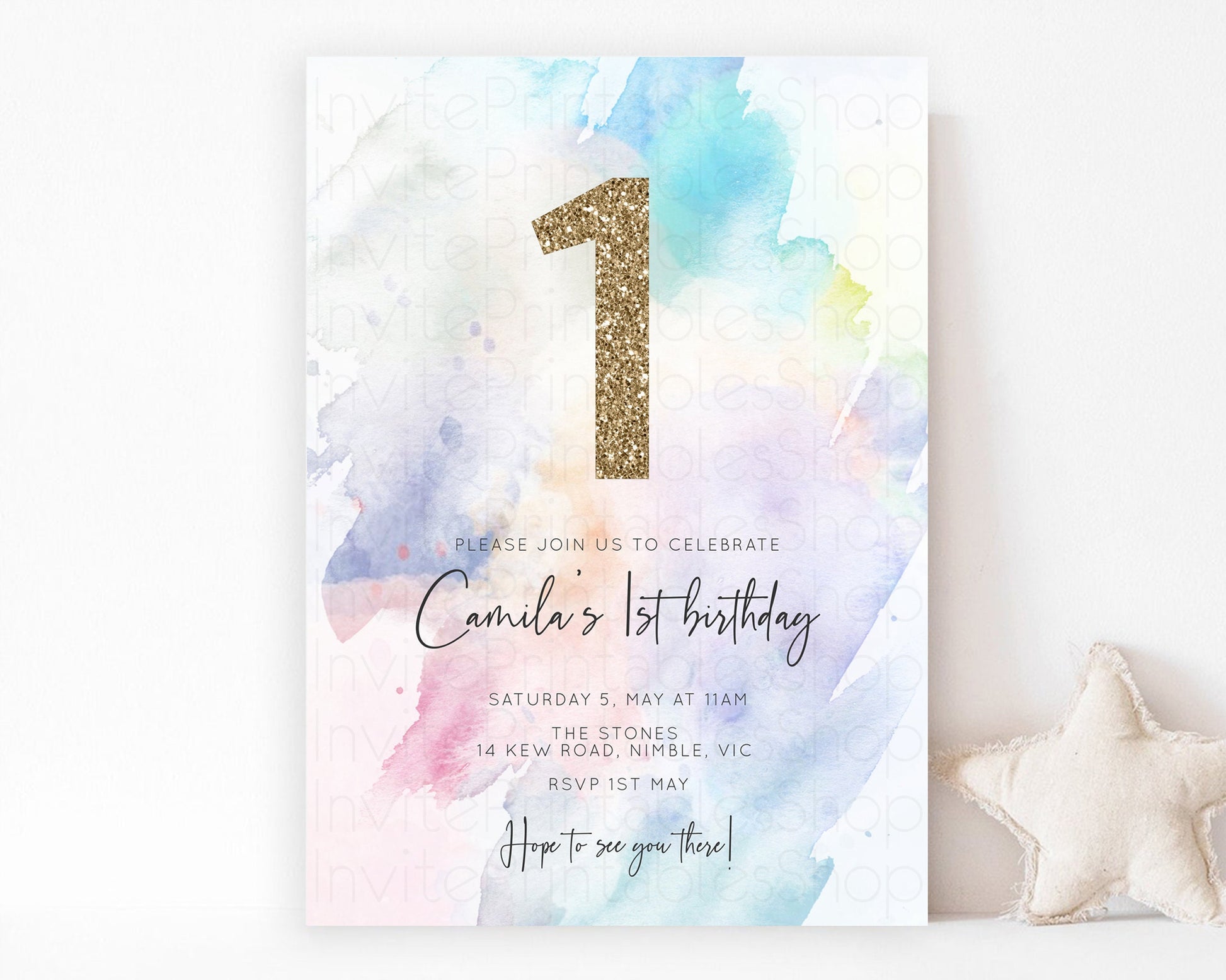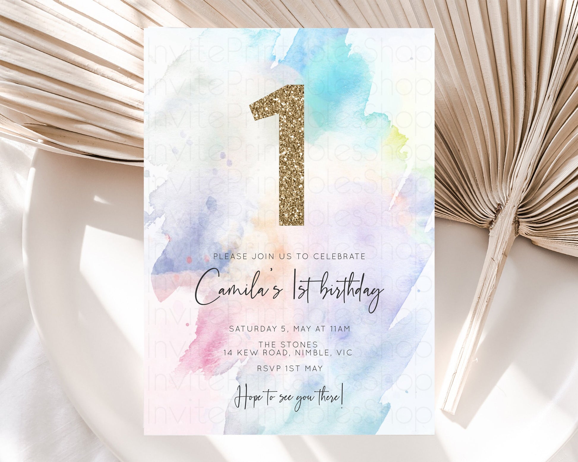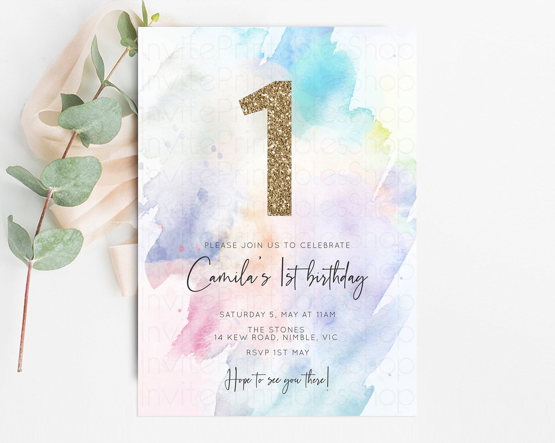 Rainbow Birthday Invitation Pastel Birthday Invite Ombre Watercolor Invite Enchanted Theme Colorful Splash Glitter Sprinkles 1st 2nd 3rd