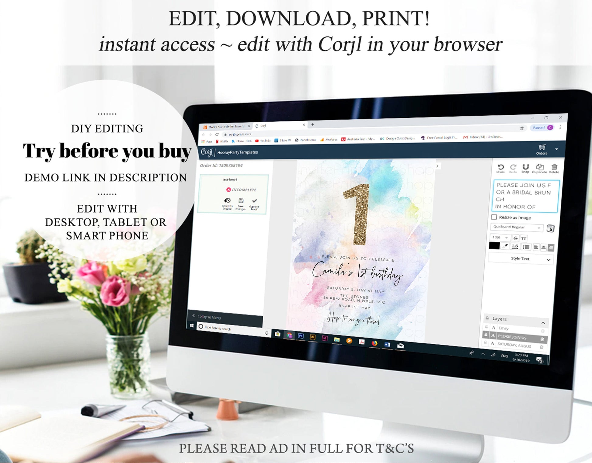 •Try before you buy! • DEMO LINK- https://www.corjl.com/d/GE1K8 PLEASE READ AD IN FULL!! •Digital file. No physical item will be shipped •Do it yourself Editing. Edit online with Corjl or Edit with your mobile ITEM DETAILS Invitation size: 5’x7’ File type: PDF, JPEG Resolution: 300DPI PDF FILE OPTIONS: •Recommended for printing •Ability to print multiple per page (if size permits) •Option to include bleed/ trim marks JPG FILE OPTIONS: •Recommended for MMS/ SMS/ Electronic send out •Can be used to print as photo •Option to include bleed/ trim marks EDITING • Do it yourself editing • Mobile editing is available • Google chrome is the recommend browser for Corjl. Please download here for FREE: https://www.google.com/chrome/ • Using other browsers may not show all of Corjl's editing features • Editing on a desktop/ laptop computer is recommended to access all of Corjl features • Mobile editing is available, please use a desktop/ laptop computer to access all of Corjl features DOWNLOADS & EXPIRY •Maximum 3 downloads on the same edit •Link expires 30 days after purchase DOWNLOAD NOTICE •Once you have reached your download limits &/ “approve proof” in Corjl. You will not be able to request further downloads on your design. Further download requests are not permitted WHAT IS EDITABLE •Text - colours, fonts, size, move, delete & rotation. •Please see demo link for what you can and can’t do WHAT YOU CAN’T EDIT •Template size •Template orientation •Graphics CAN NOT BE deleted, moved, or changed in colour •Please see demo link for what you can and can’t do HOW TO 1. Choose design template & checkout on Etsy. 2. Email will be sent from Corjl. Follow link to access template 3. Edit, save & print INSTRUCTIONS •Instructions on how to edit your design have been written by Corjl and will be available with your purchase. PRINTING •Colours can vary depending on the monitor, printer & cardstock •Can be printed at home •Home printing will require you to select the high quality print settings, select appropriate paper thickness & click "Actual size" prior to you printing •This design was test printed on 100 gsm paper •Can be printed at local print shop. Please check printing requirements & any printing restrictions prior to purchase PERSONAL USE ONLY. This item cannot be shared, re-sold, or used commercially for profit. REFUND POLICY •We are unable to provide a refund/ exchange on commenced & completed work, instant downloads or self-editing link templates. Please use the demo link to work out if this product is right for you. Copyright © 2018 by InvitePrintablesShop PTY LTD All rights reserved. This file or any portion thereof may not be reproduced or resold without the express written permission of the publisher (including edits to the design). Our files are provided as high-resolution PDFs – the end result is dependent upon the printer and paper used. If using a professional printing company, InvitePrintablesShop are not responsible for their specific printing requirements, paper or colour quality. Any changes required to the template are not included with your purchase – the files come as described in the listing only and cannot be changed. Thank you for visiting Invite Printables Shop:)