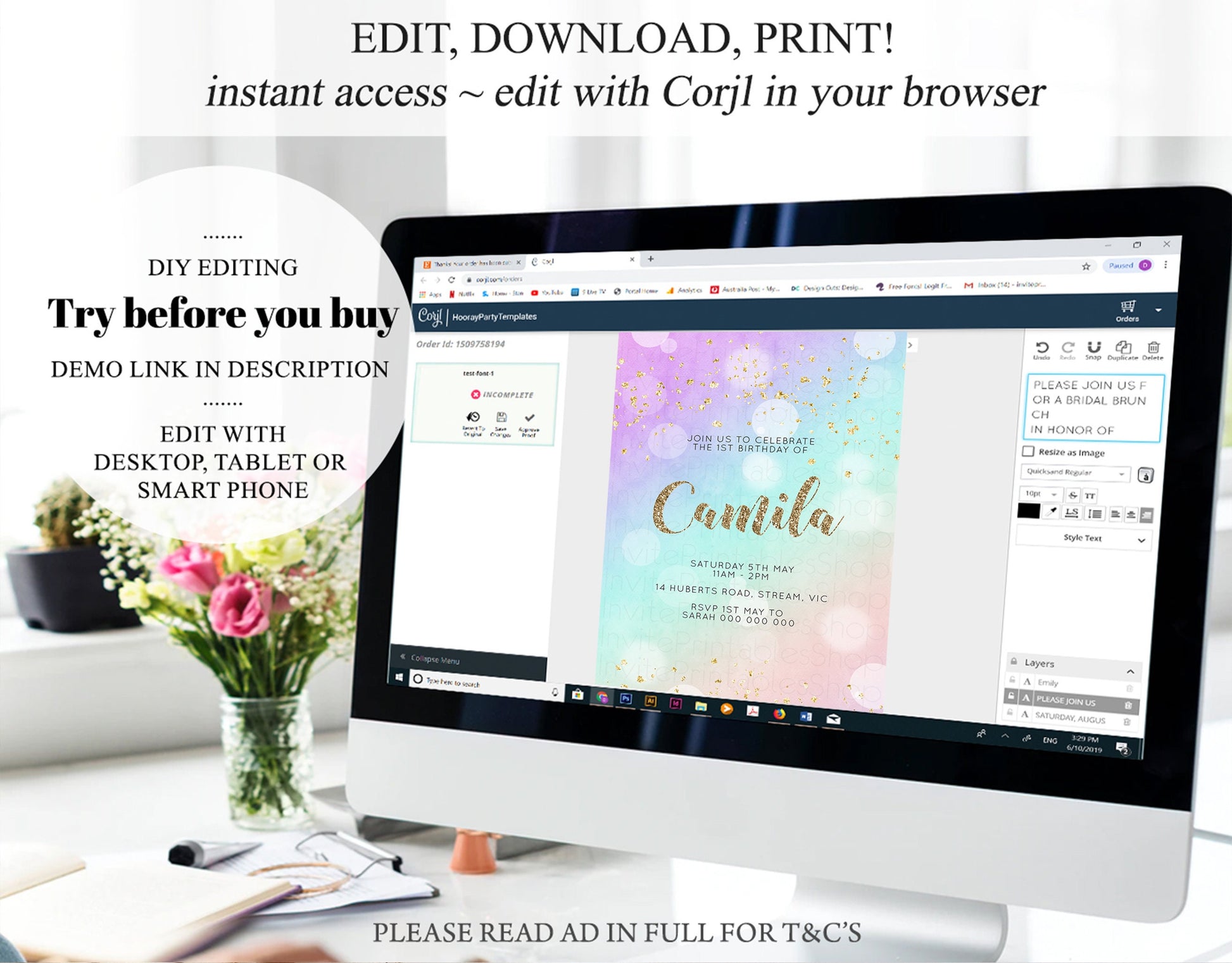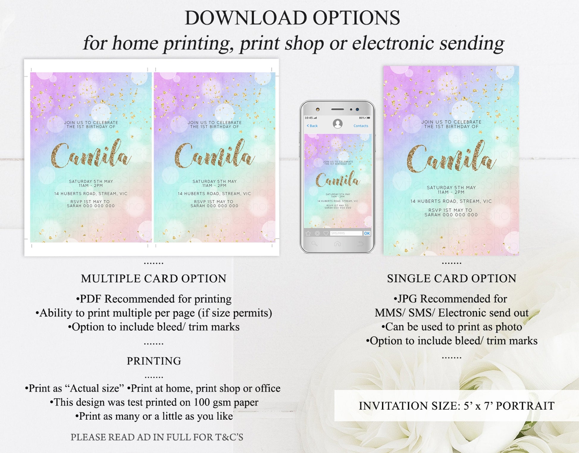 •Try before you buy! • DEMO LINK- https://www.corjl.com/d/7909L PLEASE READ AD IN FULL!! •Digital file. No physical item will be shipped •Do it yourself Editing. Edit online with Corjl or Edit with your mobile ITEM DETAILS Invitation size: 5’x7’ File type: PDF, JPEG Resolution: 300DPI PDF FILE OPTIONS: •Recommended for printing •Ability to print multiple per page (if size permits) •Option to include bleed/ trim marks JPG FILE OPTIONS: •Recommended for MMS/ SMS/ Electronic send out •Can be used to print as photo •Option to include bleed/ trim marks EDITING • Do it yourself editing • Mobile editing is available • Google chrome is the recommend browser for Corjl. Please download here for FREE: https://www.google.com/chrome/ • Using other browsers may not show all of Corjl's editing features • Editing on a desktop/ laptop computer is recommended to access all of Corjl features • Mobile editing is available, please use a desktop/ laptop computer to access all of Corjl features DOWNLOADS & EXPIRY •Maximum 3 downloads on the same edit •Link expires 30 days after purchase DOWNLOAD NOTICE •Once you have reached your download limits &/ “approve proof” in Corjl. You will not be able to request further downloads on your design. Further download requests are not permitted WHAT IS EDITABLE •Text - colours, fonts, size, move, delete & rotation. •Please see demo link for what you can and can’t do WHAT YOU CAN’T EDIT •Template size •Template orientation •Graphics CAN NOT BE deleted, moved, or changed in colour •Please see demo link for what you can and can’t do HOW TO 1. Choose design template & checkout on Etsy. 2. Email will be sent from Corjl. Follow link to access template 3. Edit, save & print INSTRUCTIONS •Instructions on how to edit your design have been written by Corjl and will be available with your purchase. PRINTING •Colours can vary depending on the monitor, printer & cardstock •Can be printed at home •Home printing will require you to select the high quality print settings, select appropriate paper thickness & click "Actual size" prior to you printing •This design was test printed on 100 gsm paper •Can be printed at local print shop. Please check printing requirements & any printing restrictions prior to purchase PERSONAL USE ONLY. This item cannot be shared, re-sold, or used commercially for profit. REFUND POLICY •We are unable to provide a refund/ exchange on commenced & completed work, instant downloads or self-editing link templates. Please use the demo link to work out if this product is right for you. Copyright © 2018 by InvitePrintablesShop PTY LTD All rights reserved. This file or any portion thereof may not be reproduced or resold without the express written permission of the publisher (including edits to the design). Our files are provided as high-resolution PDFs – the end result is dependent upon the printer and paper used. If using a professional printing company, InvitePrintablesShop are not responsible for their specific printing requirements, paper or colour quality. Any changes required to the template are not included with your purchase – the files come as described in the listing only and cannot be changed. Thank you for visiting Invite Printables Shop:)