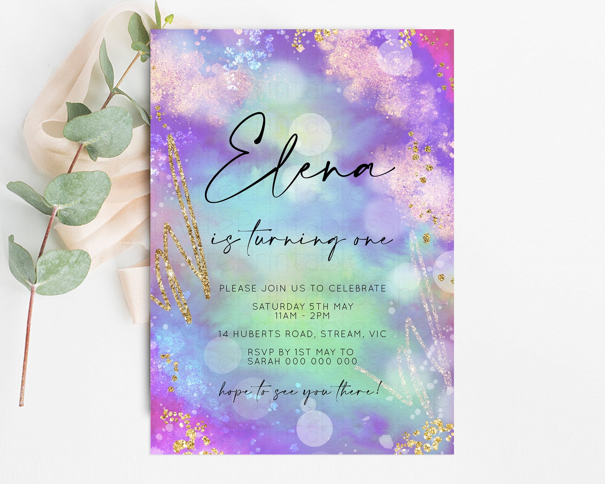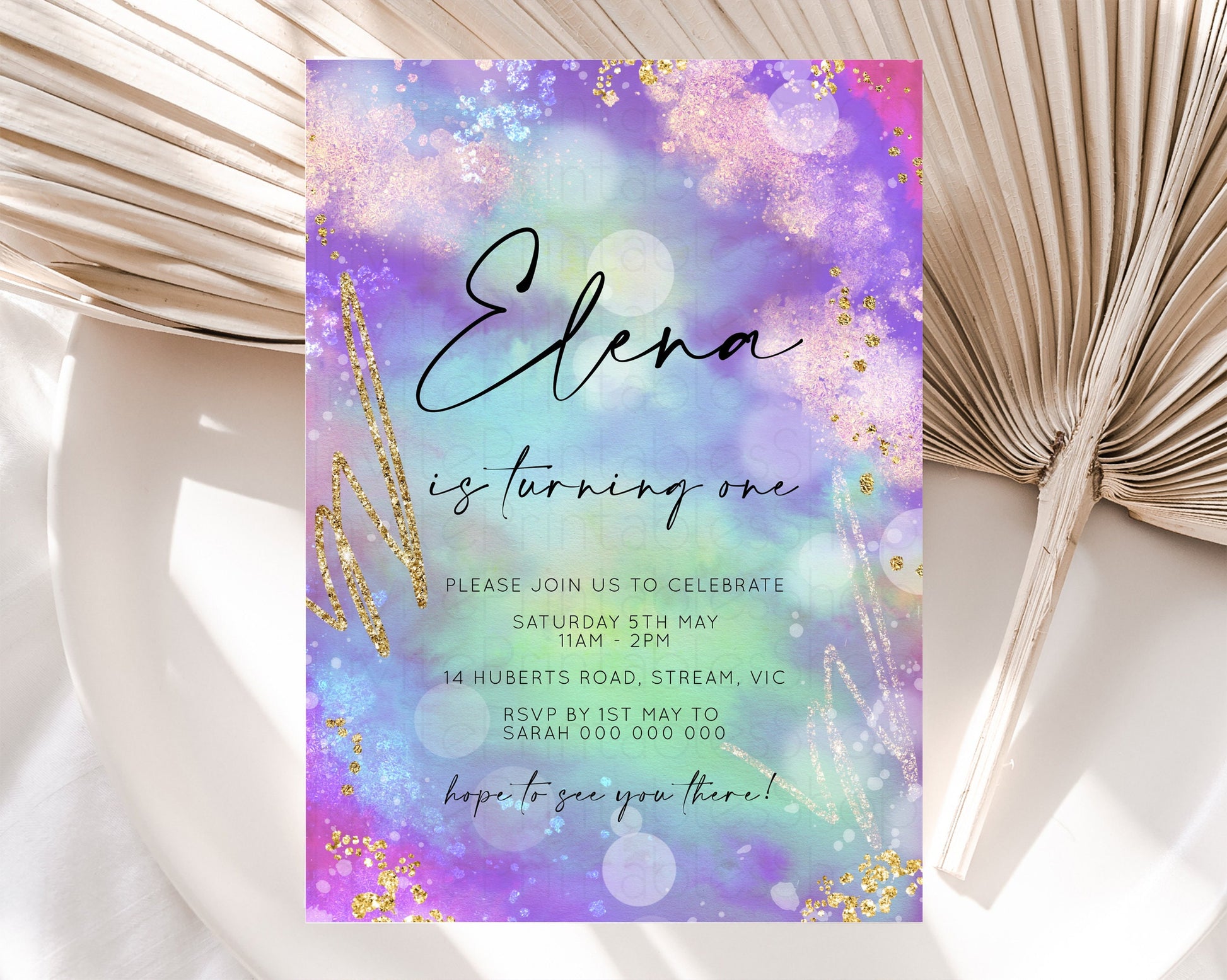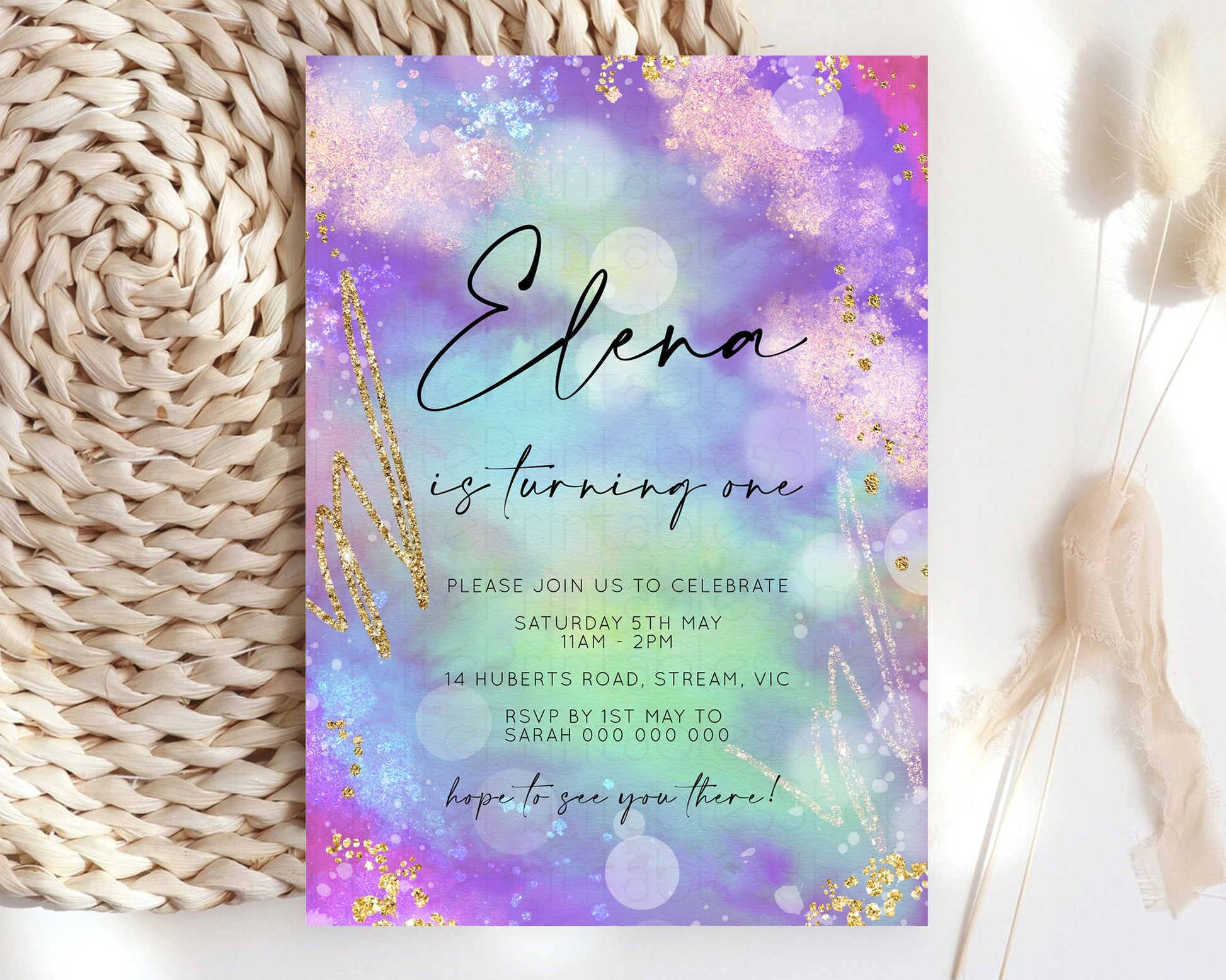 Rainbow Birthday Invitation Pastel Birthday Invite Ombre Watercolor Invite Enchanted Theme Colorful Splash Glitter Sprinkles 1st 2nd 3rd