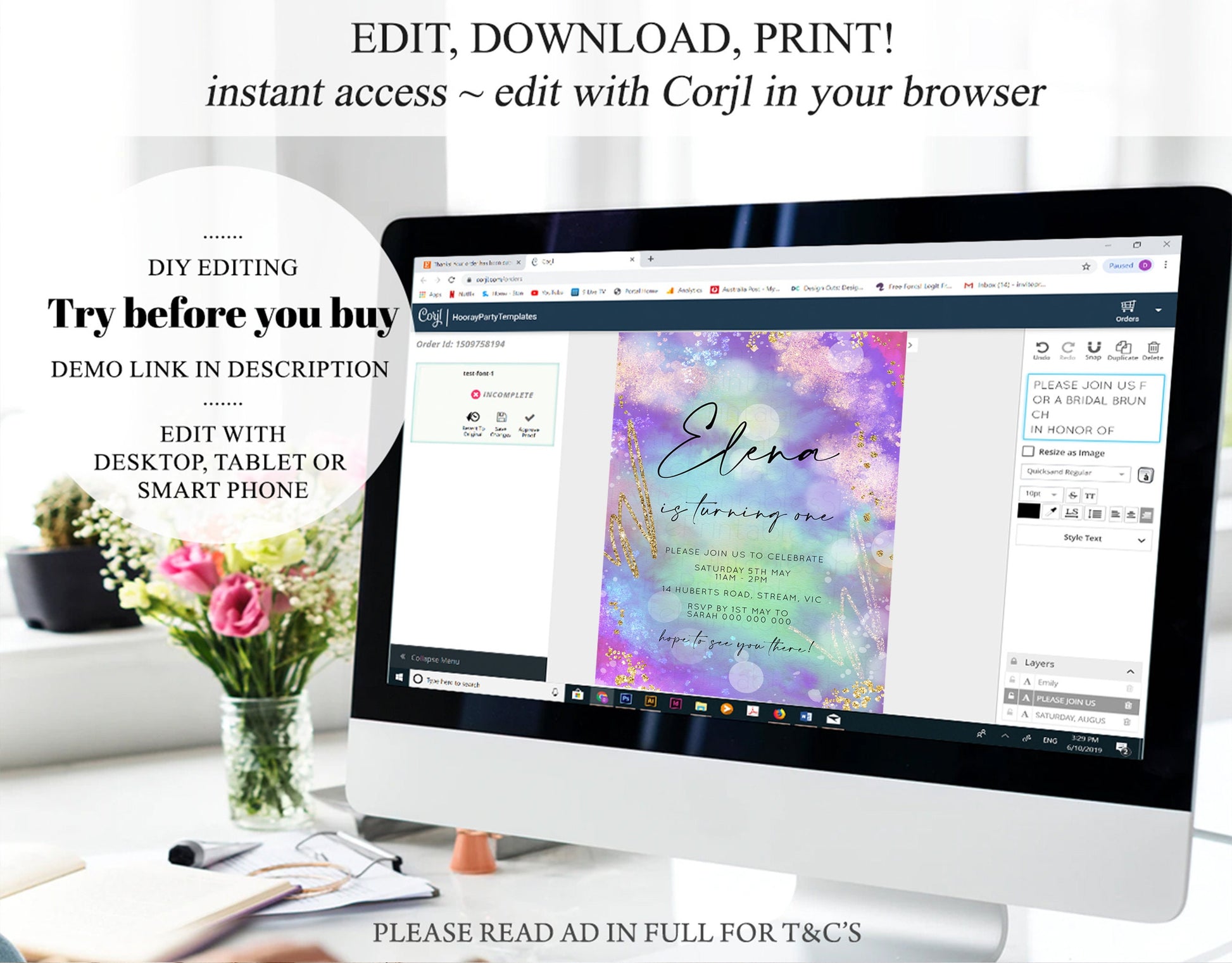 •Try before you buy! • DEMO LINK- https://www.corjl.com/d/520DE3 PLEASE READ AD IN FULL!! •Digital file. No physical item will be shipped •Do it yourself Editing. Edit online with Corjl or Edit with your mobile ITEM DETAILS Invitation size: 5’x7’ File type: PDF, JPEG Resolution: 300DPI PDF FILE OPTIONS: •Recommended for printing •Ability to print multiple per page (if size permits) •Option to include bleed/ trim marks JPG FILE OPTIONS: •Recommended for MMS/ SMS/ Electronic send out •Can be used to print as photo •Option to include bleed/ trim marks EDITING • Do it yourself editing • Mobile editing is available • Google chrome is the recommend browser for Corjl. Please download here for FREE: https://www.google.com/chrome/ • Using other browsers may not show all of Corjl's editing features • Editing on a desktop/ laptop computer is recommended to access all of Corjl features • Mobile editing is available, please use a desktop/ laptop computer to access all of Corjl features DOWNLOADS & EXPIRY •Maximum 3 downloads on the same edit •Link expires 30 days after purchase DOWNLOAD NOTICE •Once you have reached your download limits &/ “approve proof” in Corjl. You will not be able to request further downloads on your design. Further download requests are not permitted WHAT IS EDITABLE •Text - colours, fonts, size, move, delete & rotation. •Please see demo link for what you can and can’t do WHAT YOU CAN’T EDIT •Template size •Template orientation •Graphics CAN NOT BE deleted, moved, or changed in colour •Please see demo link for what you can and can’t do HOW TO 1. Choose design template & checkout on Etsy. 2. Email will be sent from Corjl. Follow link to access template 3. Edit, save & print INSTRUCTIONS •Instructions on how to edit your design have been written by Corjl and will be available with your purchase. PRINTING •Colours can vary depending on the monitor, printer & cardstock •Can be printed at home •Home printing will require you to select the high quality print settings, select appropriate paper thickness & click "Actual size" prior to you printing •This design was test printed on 100 gsm paper •Can be printed at local print shop. Please check printing requirements & any printing restrictions prior to purchase PERSONAL USE ONLY. This item cannot be shared, re-sold, or used commercially for profit. REFUND POLICY •We are unable to provide a refund/ exchange on commenced & completed work, instant downloads or self-editing link templates. Please use the demo link to work out if this product is right for you. Copyright © 2018 by InvitePrintablesShop PTY LTD All rights reserved. This file or any portion thereof may not be reproduced or resold without the express written permission of the publisher (including edits to the design). Our files are provided as high-resolution PDFs – the end result is dependent upon the printer and paper used. If using a professional printing company, InvitePrintablesShop are not responsible for their specific printing requirements, paper or colour quality. Any changes required to the template are not included with your purchase – the files come as described in the listing only and cannot be changed. Thank you for visiting Invite Printables Shop:)