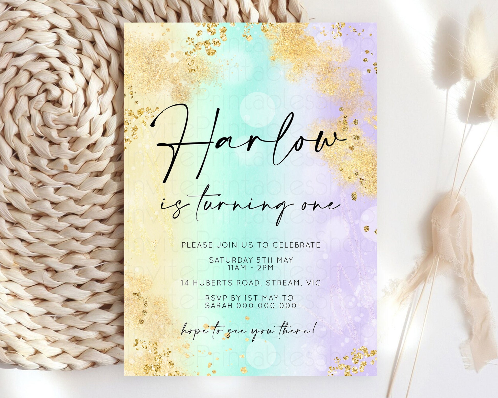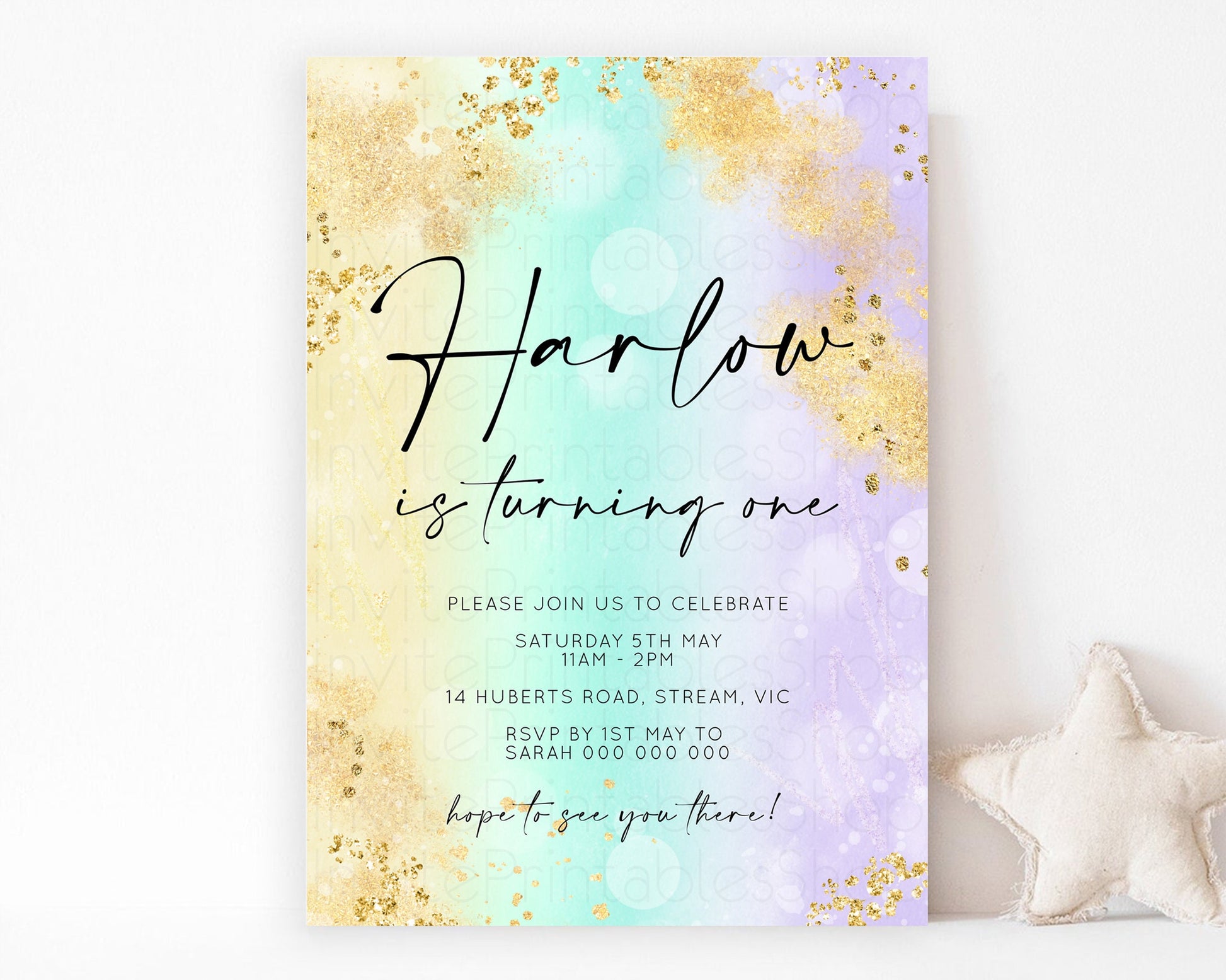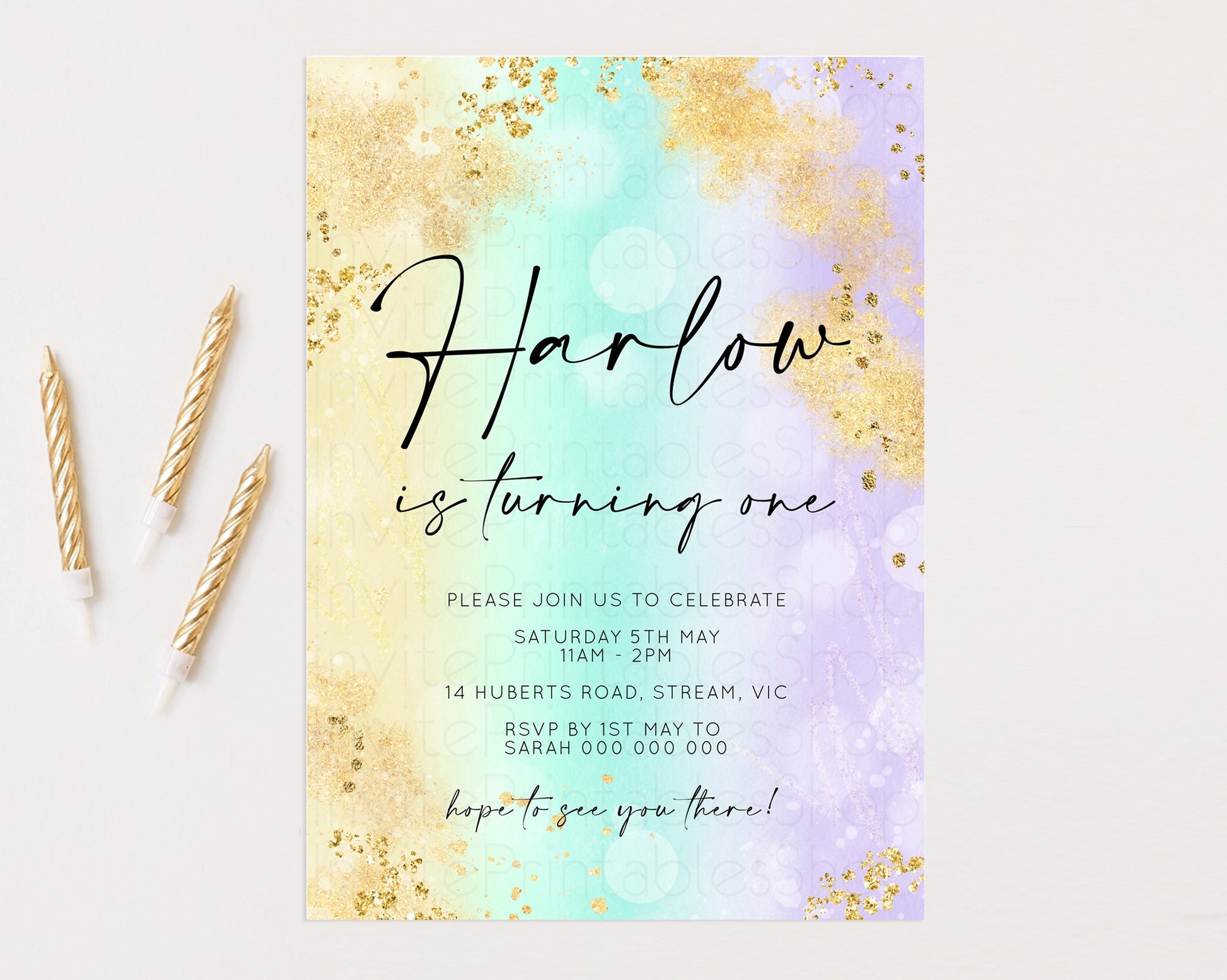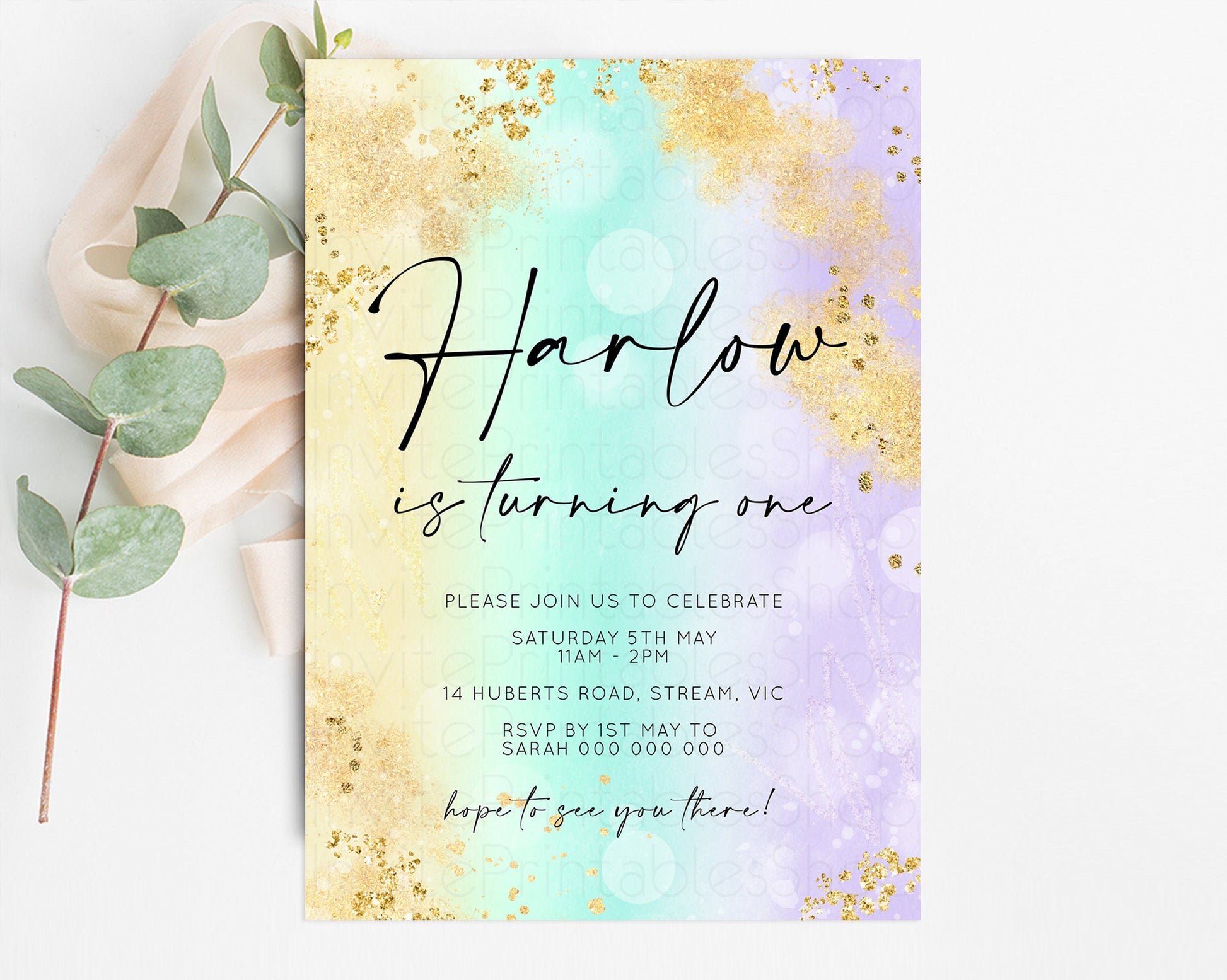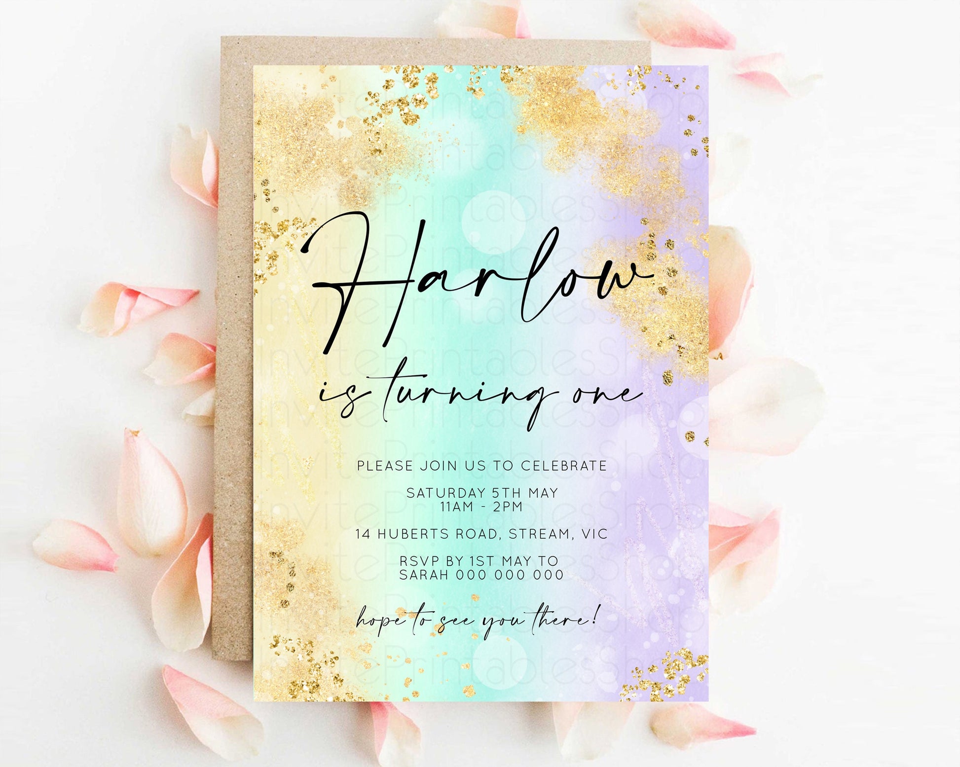 Rainbow Birthday Invitation Pastel Birthday Invite Ombre Watercolor Invite Enchanted Theme Colorful Splash Glitter Sprinkles 1st 2nd 3rd