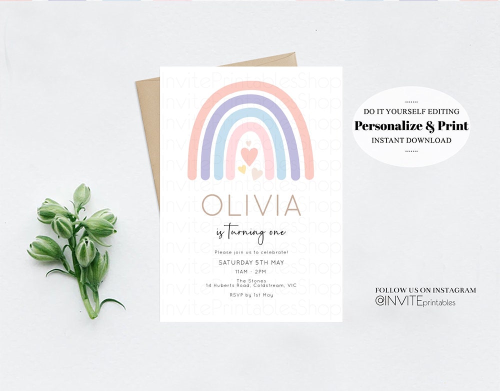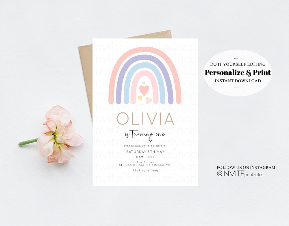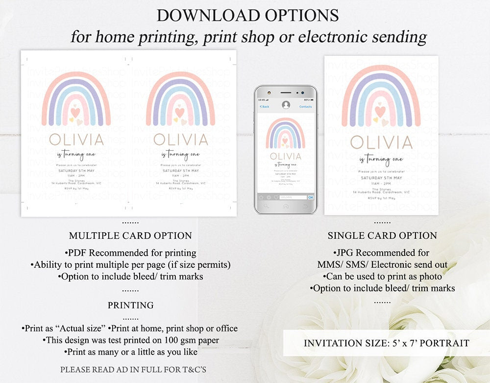 •Try before you buy! • DEMO LINK- https://www.corjl.com/d/54N7JG PLEASE READ AD IN FULL!! •Digital file. No physical item will be shipped •Do it yourself Editing. Edit online with Corjl or Edit with your mobile ITEM DETAILS Invitation size: 5’x7’ File type: PDF, JPEG Resolution: 300DPI PDF FILE OPTIONS: •Recommended for printing •Ability to print multiple per page (if size permits) •Option to include bleed/ trim marks JPG FILE OPTIONS: •Recommended for MMS/ SMS/ Electronic send out •Can be used to print as photo •Option to include bleed/ trim marks EDITING • Do it yourself editing • Mobile editing is available • Google chrome is the recommend browser for Corjl. Please download here for FREE: https://www.google.com/chrome/ • Using other browsers may not show all of Corjl's editing features • Editing on a desktop/ laptop computer is recommended to access all of Corjl features • Mobile editing is available, please use a desktop/ laptop computer to access all of Corjl features DOWNLOADS & EXPIRY •Maximum 3 downloads on the same edit •Link expires 30 days after purchase DOWNLOAD NOTICE •Once you have reached your download limits &/ “approve proof” in Corjl. You will not be able to request further downloads on your design. Further download requests are not permitted WHAT IS EDITABLE •Text - colours, fonts, size, move, delete & rotation. •Please see demo link for what you can and can’t do WHAT YOU CAN’T EDIT •Template size •Template orientation •Graphics CAN NOT BE deleted, moved, or changed in colour •Please see demo link for what you can and can’t do HOW TO 1. Choose design template & checkout on Etsy. 2. Email will be sent from Corjl. Follow link to access template 3. Edit, save & print INSTRUCTIONS •Instructions on how to edit your design have been written by Corjl and will be available with your purchase. PRINTING •Colours can vary depending on the monitor, printer & cardstock •Can be printed at home •Home printing will require you to select the high quality print settings, select appropriate paper thickness & click "Actual size" prior to you printing •This design was test printed on 100 gsm paper •Can be printed at local print shop. Please check printing requirements & any printing restrictions prior to purchase PERSONAL USE ONLY. This item cannot be shared, re-sold, or used commercially for profit. REFUND POLICY •We are unable to provide a refund/ exchange on commenced & completed work, instant downloads or self-editing link templates. Please use the demo link to work out if this product is right for you. Copyright © 2018 by InvitePrintablesShop PTY LTD All rights reserved. This file or any portion thereof may not be reproduced or resold without the express written permission of the publisher (including edits to the design). Our files are provided as high-resolution PDFs – the end result is dependent upon the printer and paper used. If using a professional printing company, InvitePrintablesShop are not responsible for their specific printing requirements, paper or colour quality. Any changes required to the template are not included with your purchase – the files come as described in the listing only and cannot be changed. Thank you for visiting Invite Printables Shop:)