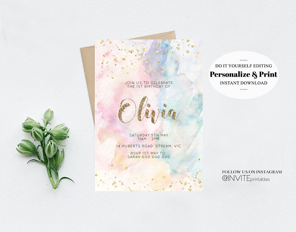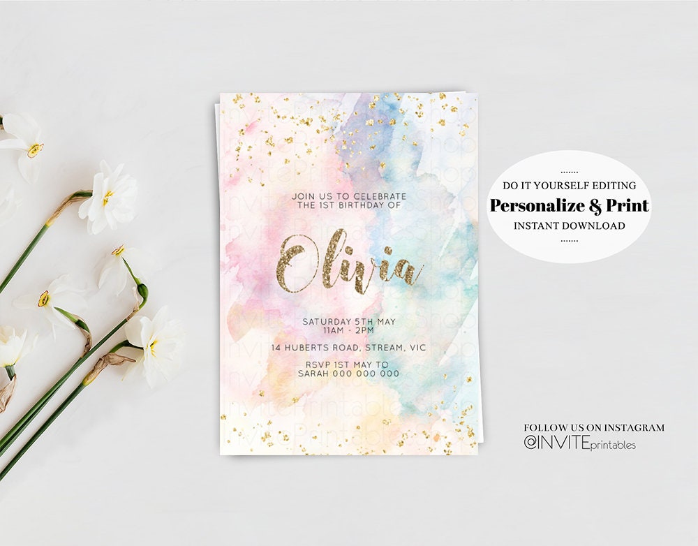 Rainbow Birthday Invitation Pastel Invitation Colorful Watercolor Gold Splatter Glitter Sprinkles Ombre 1st 2nd 3rd Editable Invite 276