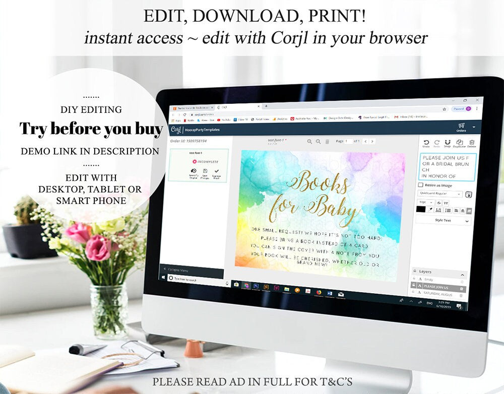 •Try before you buy! • DEMO LINK- https://www.corjl.com/d/5I4834 PLEASE READ AD IN FULL!! •Digital file. No physical item will be shipped •Do it yourself Editing. Edit online with Corjl or Edit with your mobile ITEM DETAILS Book request cards Invitation size: 5’x3.5’ File type: PDF, JPEG Resolution: 300DPI PDF FILE OPTIONS: •Recommended for printing •Ability to print multiple per page (if size permits) •Option to include bleed/ trim marks JPG FILE OPTIONS: •Recommended for MMS/ SMS/ Electronic send out •Can be used to print as photo •Option to include bleed/ trim marks EDITING • Do it yourself editing • Mobile editing is available • Google chrome is the recommend browser for Corjl. Please download here for FREE: https://www.google.com/chrome/ • Using other browsers may not show all of Corjl's editing features • Editing on a desktop/ laptop computer is recommended to access all of Corjl features • Mobile editing is available, please use a desktop/ laptop computer to access all of Corjl features DOWNLOADS & EXPIRY •Maximum 3 downloads on the same edit •Link expires 30 days after purchase DOWNLOAD NOTICE •Once you have reached your download limits &/ “approve proof” in Corjl. You will not be able to request further downloads on your design. Further download requests are not permitted WHAT IS EDITABLE •Text - colours, fonts, size, move, delete & rotation. •Please see demo link for what you can and can’t do WHAT YOU CAN’T EDIT •Template size •Template orientation •Graphics CAN NOT BE deleted, moved, or changed in colour •Please see demo link for what you can and can’t do HOW TO 1. Choose design template & checkout on Etsy. 2. Email will be sent from Corjl. Follow link to access template 3. Edit, save & print INSTRUCTIONS •Instructions on how to edit your design have been written by Corjl and will be available with your purchase. PRINTING •Colours can vary depending on the monitor, printer & cardstock •Can be printed at home •Home printing will require you to select the high quality print settings, select appropriate paper thickness & click "Actual size" prior to you printing •This design was test printed on 100 gsm paper •Can be printed at local print shop. Please check printing requirements & any printing restrictions prior to purchase PERSONAL USE ONLY. This item cannot be shared, re-sold, or used commercially for profit. REFUND POLICY •We are unable to provide a refund/ exchange on commenced & completed work, instant downloads or self-editing link templates. Please use the demo link to work out if this product is right for you. Copyright © 2018 by InvitePrintablesShop PTY LTD All rights reserved. This file or any portion thereof may not be reproduced or resold without the express written permission of the publisher (including edits to the design). Our files are provided as high-resolution PDFs – the end result is dependent upon the printer and paper used. If using a professional printing company, InvitePrintablesShop are not responsible for their specific printing requirements, paper or colour quality. Any changes required to the template are not included with your purchase – the files come as described in the listing only and cannot be changed.