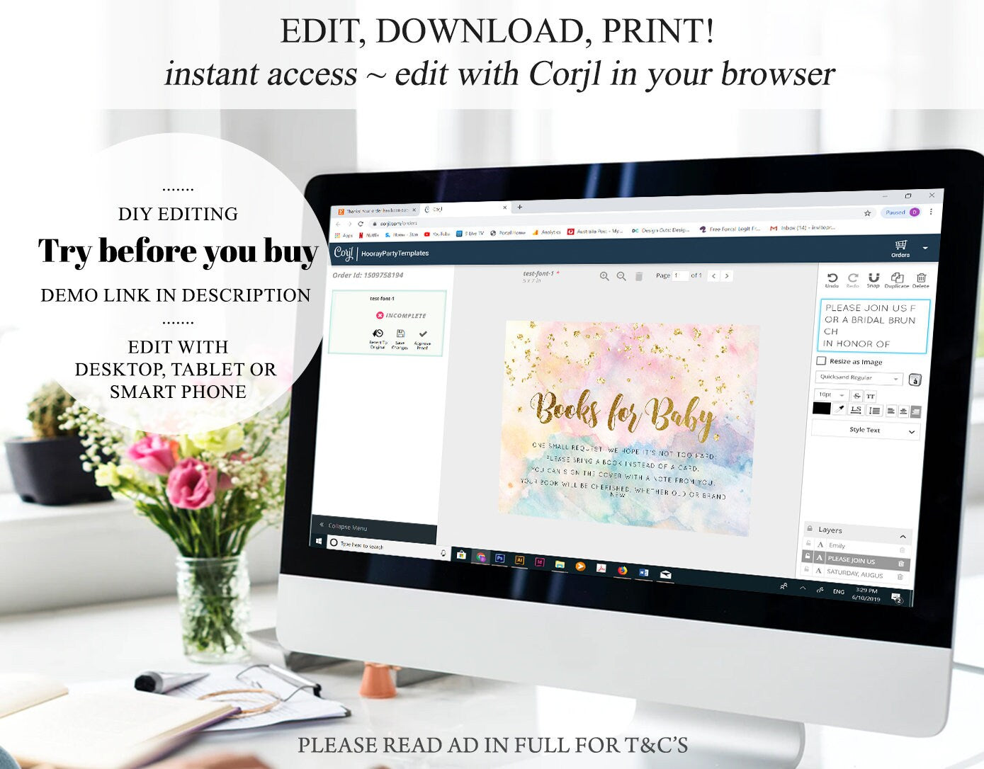 •Try before you buy! • DEMO LINK- https://www.corjl.com/d/LH4LP MATCHING ITEMS: https://etsy.me/3llNMkz PLEASE READ AD IN FULL!! •Digital file. No physical item will be shipped •Do it yourself Editing. Edit online with Corjl or Edit with your mobile ITEM DETAILS Book request cards Invitation size: 5’x3.5’ File type: PDF, JPEG Resolution: 300DPI PDF FILE OPTIONS: •Recommended for printing •Ability to print multiple per page (if size permits) •Option to include bleed/ trim marks JPG FILE OPTIONS: •Recommended for MMS/ SMS/ Electronic send out •Can be used to print as photo •Option to include bleed/ trim marks EDITING • Do it yourself editing • Mobile editing is available • Google chrome is the recommend browser for Corjl. Please download here for FREE: https://www.google.com/chrome/ • Using other browsers may not show all of Corjl's editing features • Editing on a desktop/ laptop computer is recommended to access all of Corjl features • Mobile editing is available, please use a desktop/ laptop computer to access all of Corjl features DOWNLOADS & EXPIRY •Maximum 3 downloads on the same edit •Link expires 30 days after purchase DOWNLOAD NOTICE •Once you have reached your download limits &/ “approve proof” in Corjl. You will not be able to request further downloads on your design. Further download requests are not permitted WHAT IS EDITABLE •Text - colours, fonts, size, move, delete & rotation. •Please see demo link for what you can and can’t do WHAT YOU CAN’T EDIT •Template size •Template orientation •Graphics CAN NOT BE deleted, moved, or changed in colour •Please see demo link for what you can and can’t do HOW TO 1. Choose design template & checkout on Etsy. 2. Email will be sent from Corjl. Follow link to access template 3. Edit, save & print INSTRUCTIONS •Instructions on how to edit your design have been written by Corjl and will be available with your purchase. PRINTING •Colours can vary depending on the monitor, printer & cardstock •Can be printed at home •Home printing will require you to select the high quality print settings, select appropriate paper thickness & click "Actual size" prior to you printing •This design was test printed on 100 gsm paper •Can be printed at local print shop. Please check printing requirements & any printing restrictions prior to purchase PERSONAL USE ONLY. This item cannot be shared, re-sold, or used commercially for profit. REFUND POLICY •We are unable to provide a refund/ exchange on commenced & completed work, instant downloads or self-editing link templates. Please use the demo link to work out if this product is right for you. Copyright © 2018 by InvitePrintablesShop PTY LTD All rights reserved. This file or any portion thereof may not be reproduced or resold without the express written permission of the publisher (including edits to the design). Our files are provided as high-resolution PDFs – the end result is dependent upon the printer and paper used. If using a professional printing company, InvitePrintablesShop are not responsible for their specific printing requirements, paper or colour quality. Any changes required to the template are not included with your purchase – the files come as described in the listing only and cannot be changed. Thank you for visiting Invite Printables Shop:)
