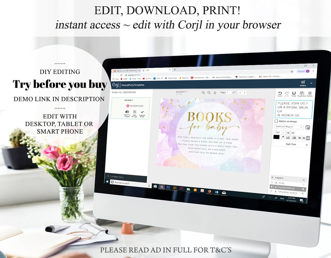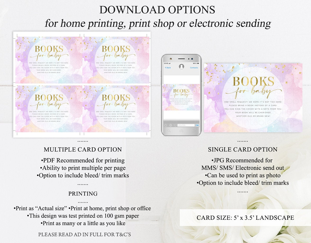 •Try before you buy! • DEMO LINK- https://www.corjl.com/d/681FB9 Matching items: https://etsy.me/33ouoPf PLEASE READ AD IN FULL!! •Digital file. No physical item will be shipped •Do it yourself Editing. Edit online with Corjl or Edit with your mobile ITEM DETAILS Book request cards Invitation size: 5’x3.5’ File type: PDF, JPEG Resolution: 300DPI PDF FILE OPTIONS: •Recommended for printing •Ability to print multiple per page (if size permits) •Option to include bleed/ trim marks JPG FILE OPTIONS: •Recommended for MMS/ SMS/ Electronic send out •Can be used to print as photo •Option to include bleed/ trim marks EDITING • Do it yourself editing • Mobile editing is available • Google chrome is the recommend browser for Corjl. Please download here for FREE: https://www.google.com/chrome/ • Using other browsers may not show all of Corjl's editing features • Editing on a desktop/ laptop computer is recommended to access all of Corjl features • Mobile editing is available, please use a desktop/ laptop computer to access all of Corjl features DOWNLOADS & EXPIRY •Maximum 3 downloads on the same edit •Link expires 30 days after purchase DOWNLOAD NOTICE •Once you have reached your download limits &/ “approve proof” in Corjl. You will not be able to request further downloads on your design. Further download requests are not permitted WHAT IS EDITABLE •Text - colours, fonts, size, move, delete & rotation. •Please see demo link for what you can and can’t do WHAT YOU CAN’T EDIT •Template size •Template orientation •Graphics CAN NOT BE deleted, moved, or changed in colour •Please see demo link for what you can and can’t do HOW TO 1. Choose design template & checkout on Etsy. 2. Email will be sent from Corjl. Follow link to access template 3. Edit, save & print INSTRUCTIONS •Instructions on how to edit your design have been written by Corjl and will be available with your purchase. PRINTING •Colours can vary depending on the monitor, printer & cardstock •Can be printed at home •Home printing will require you to select the high quality print settings, select appropriate paper thickness & click "Actual size" prior to you printing •This design was test printed on 100 gsm paper •Can be printed at local print shop. Please check printing requirements & any printing restrictions prior to purchase PERSONAL USE ONLY. This item cannot be shared, re-sold, or used commercially for profit. REFUND POLICY •We are unable to provide a refund/ exchange on commenced & completed work, instant downloads or self-editing link templates. Please use the demo link to work out if this product is right for you. Copyright © 2018 by InvitePrintablesShop PTY LTD All rights reserved. This file or any portion thereof may not be reproduced or resold without the express written permission of the publisher (including edits to the design). Our files are provided as high-resolution PDFs – the end result is dependent upon the printer and paper used. If using a professional printing company, InvitePrintablesShop are not responsible for their specific printing requirements, paper or colour quality. Any changes required to the template are not included with your purchase – the files come as described in the listing only and cannot be changed. Thank you for visiting Invite Printables Shop:)