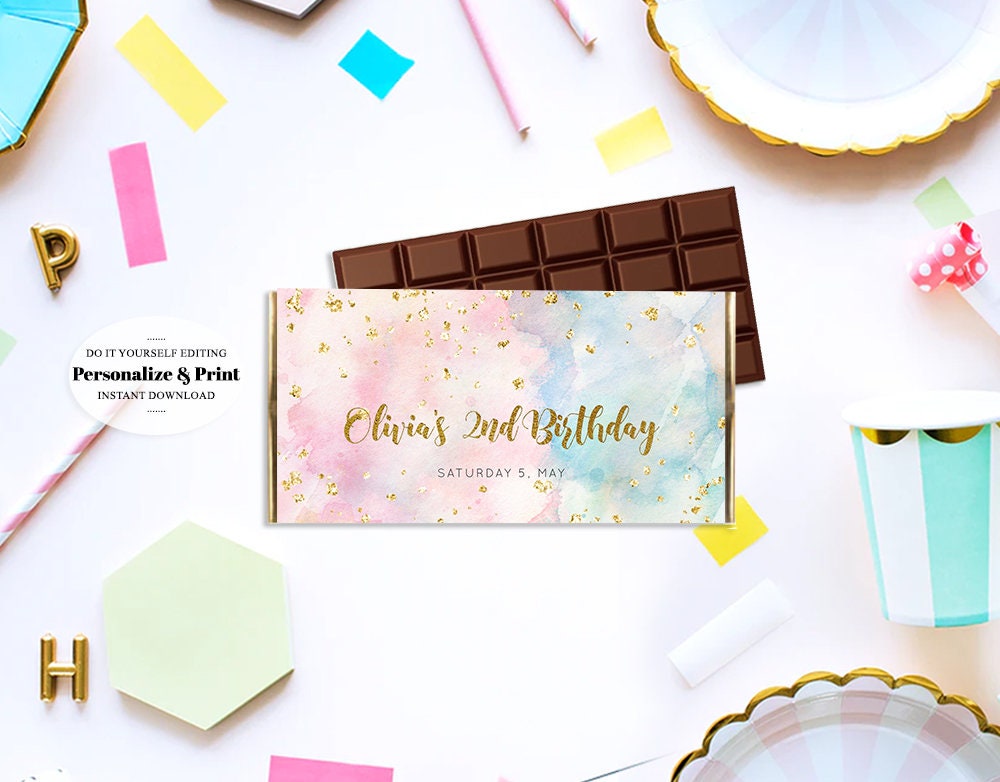 Rainbow Chocolate Wrapper Pastel Watercolor Candy Wrapper Lolly Wrapper Gold Foil Glitter Colorful Paint Kids Birthday Baby Shower 276