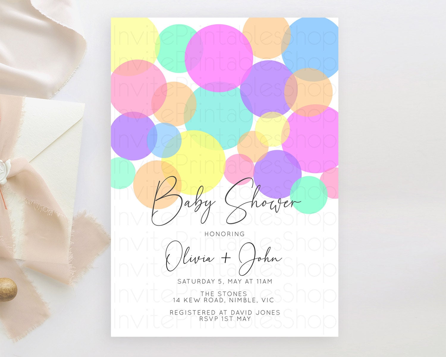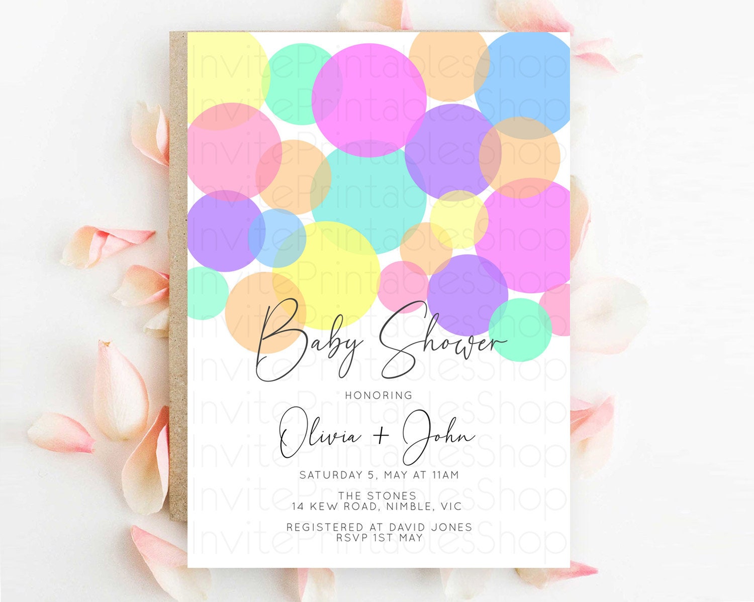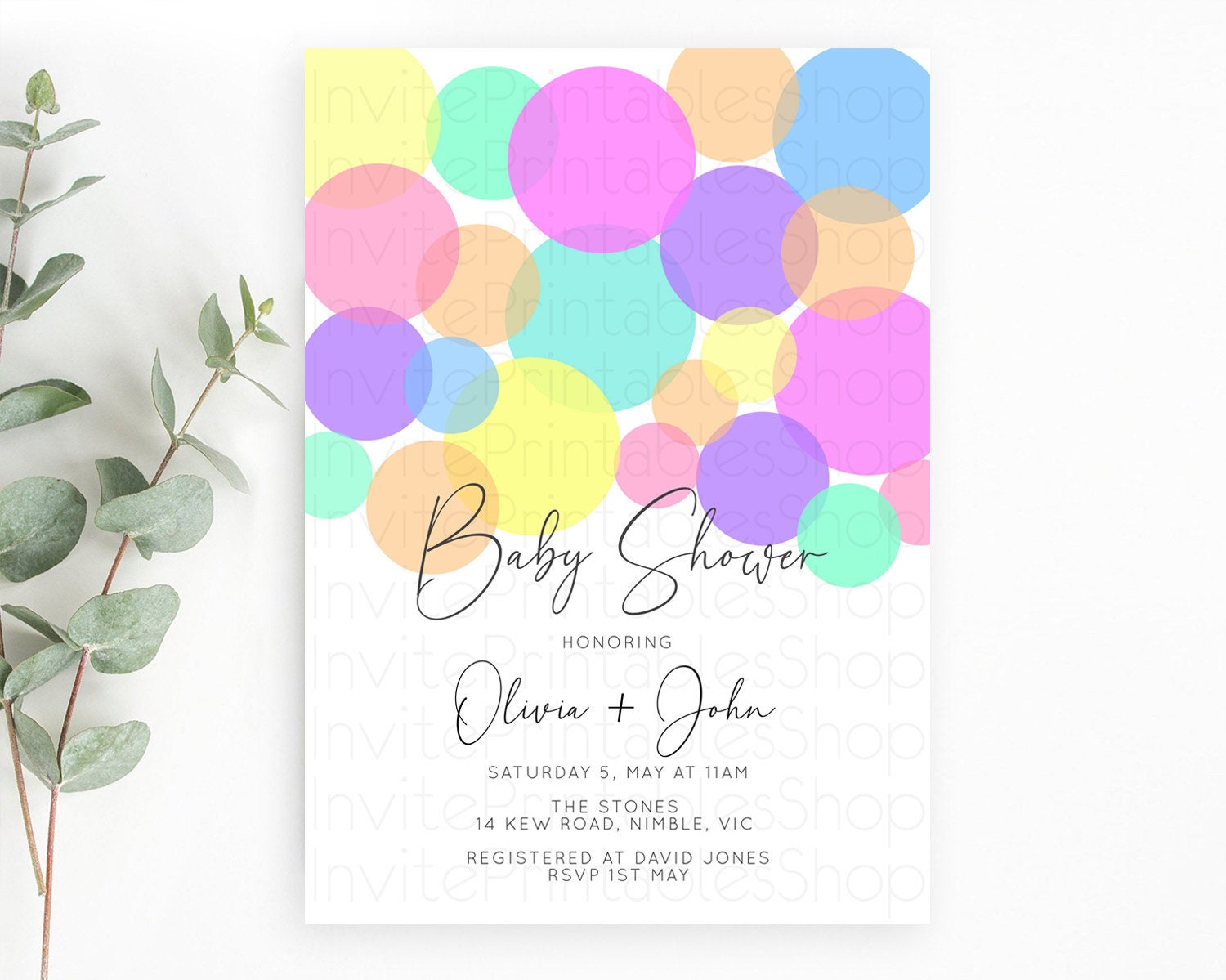 Rainbow Confetti Baby Shower Invitation, Pastel Rainbow Theme Colorful Sprinkles, Bubbles - Purple, Blue, Green, Pink, Orange, Yellow D10888