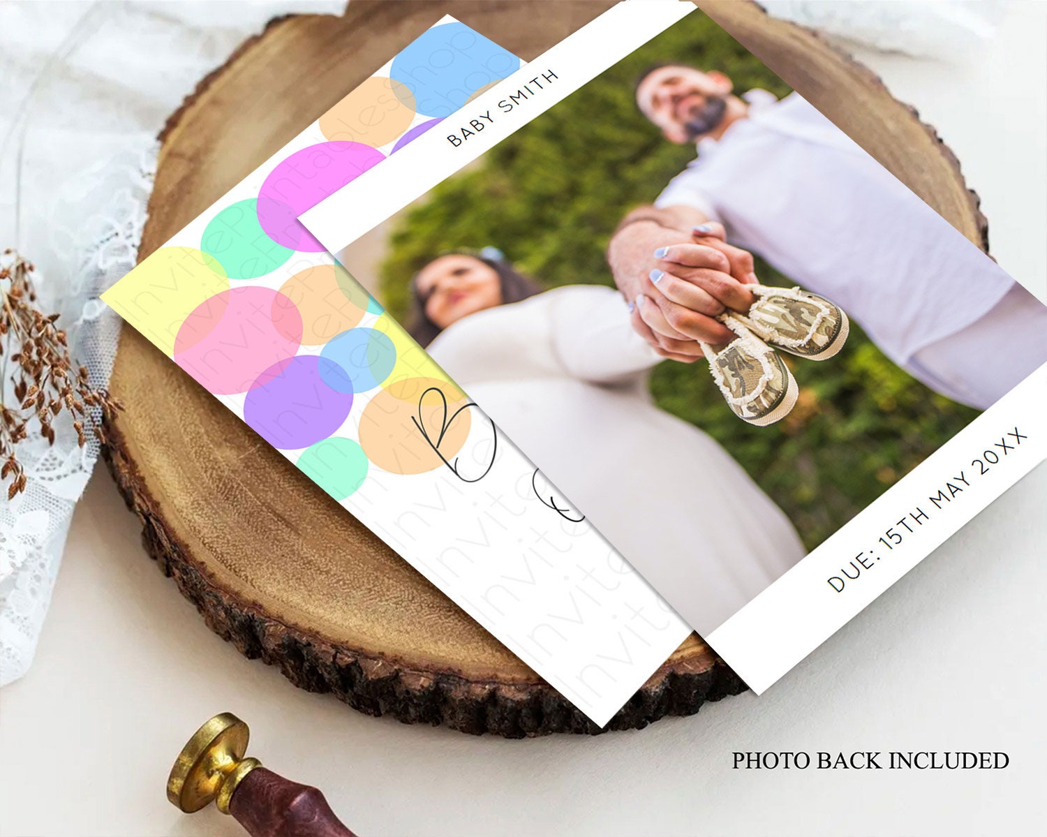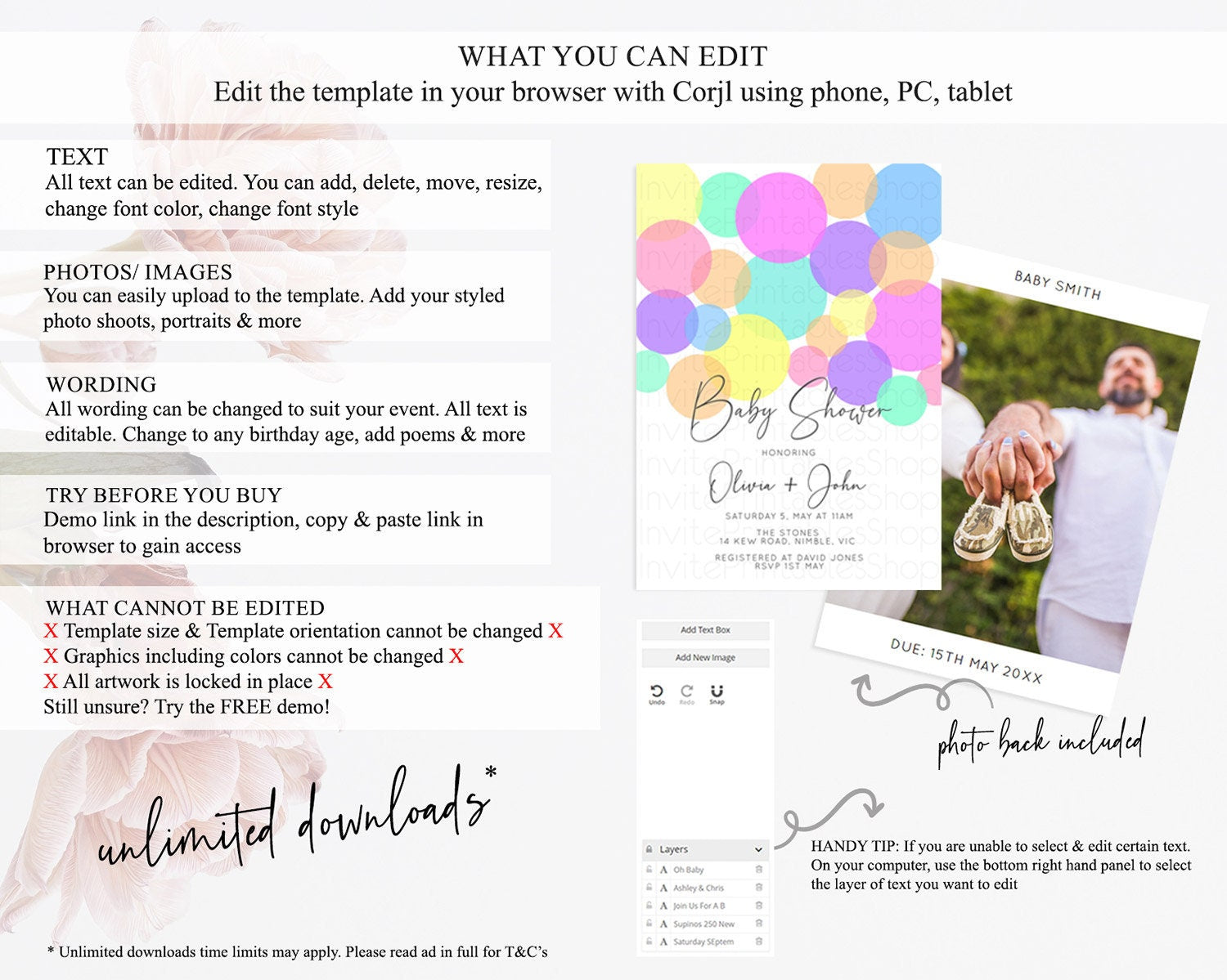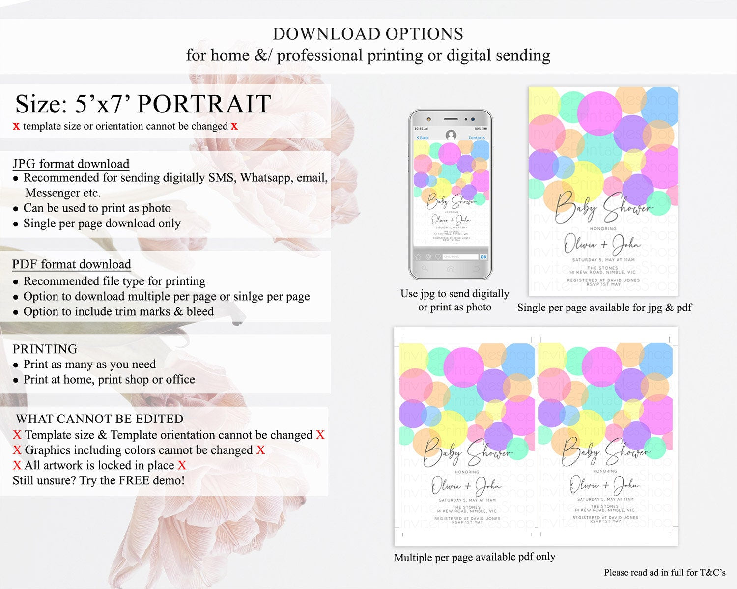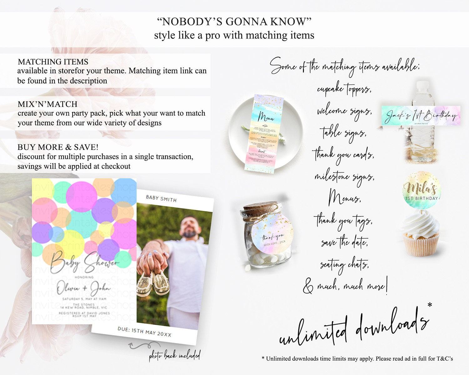 Rainbow Confetti Baby Shower Invitation, Pastel Rainbow Theme Colorful Sprinkles, Bubbles - Purple, Blue, Green, Pink, Orange, Yellow D10888