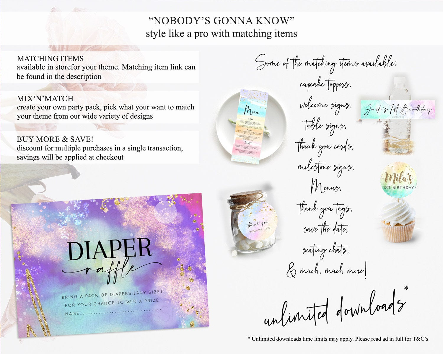 Rainbow Diaper Raffle Card Pastel Diaper Insert Colorful Pastel Watercolor Ombre Diaper Ticket Iridescent Sprinkles Raffle Game D10680