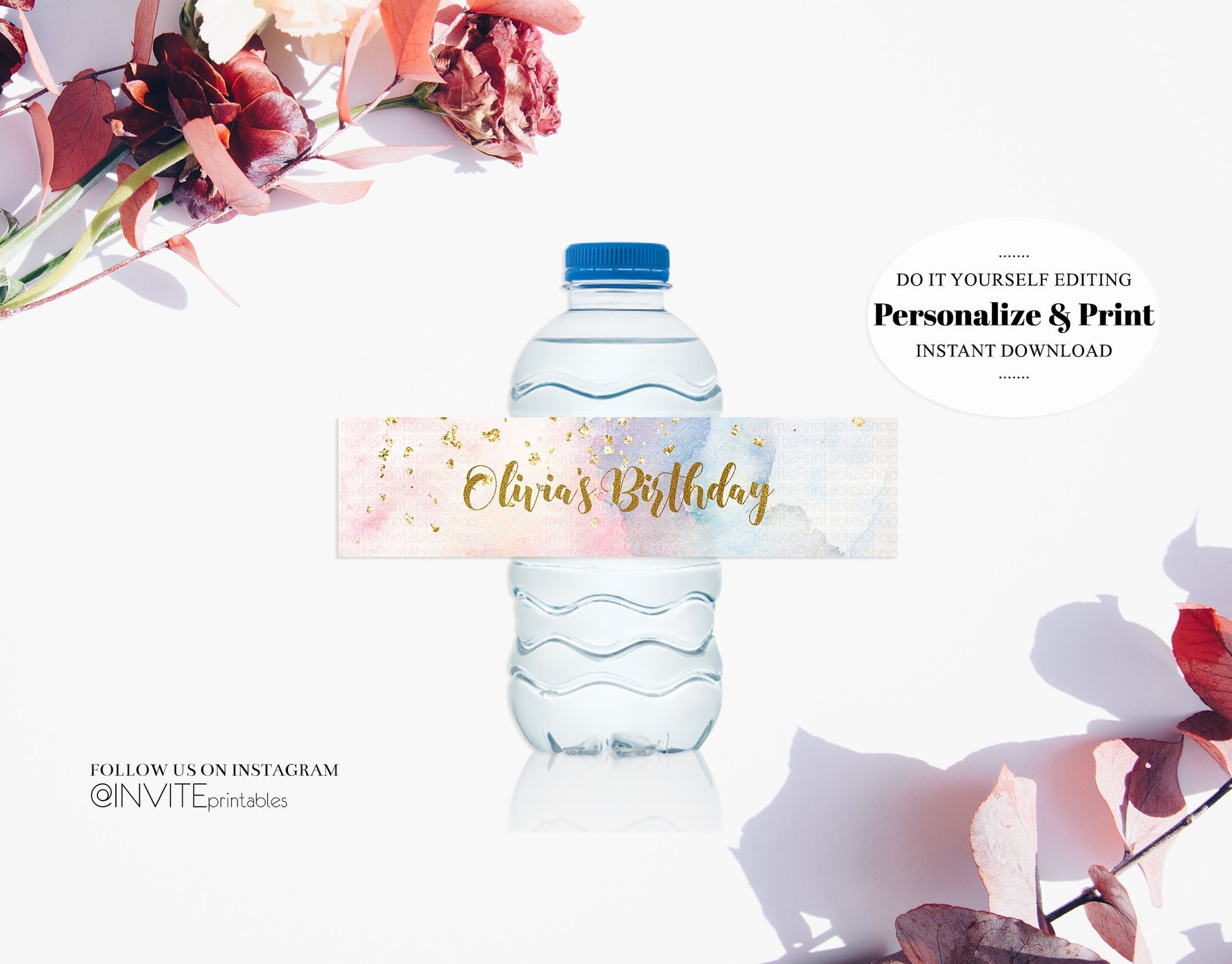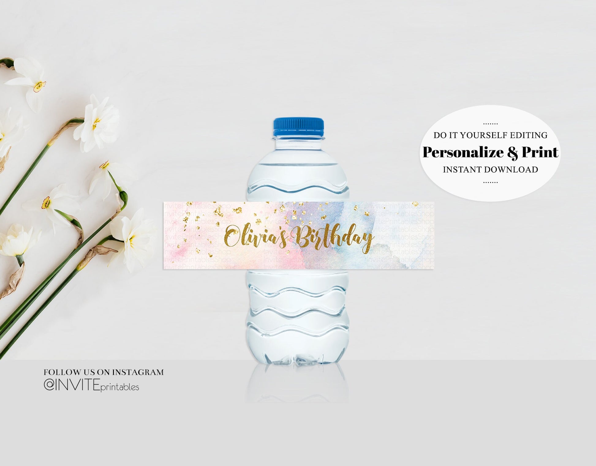 Rainbow Water Bottle Label Pastel Watercolor Drink Label Colorful Paint Kids Gold Foil Splatter Birthday Baby Shower Custom Bottle Label 276