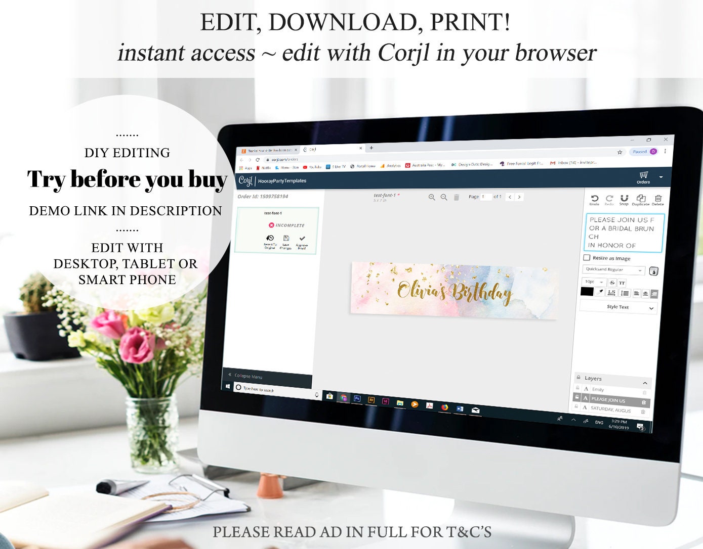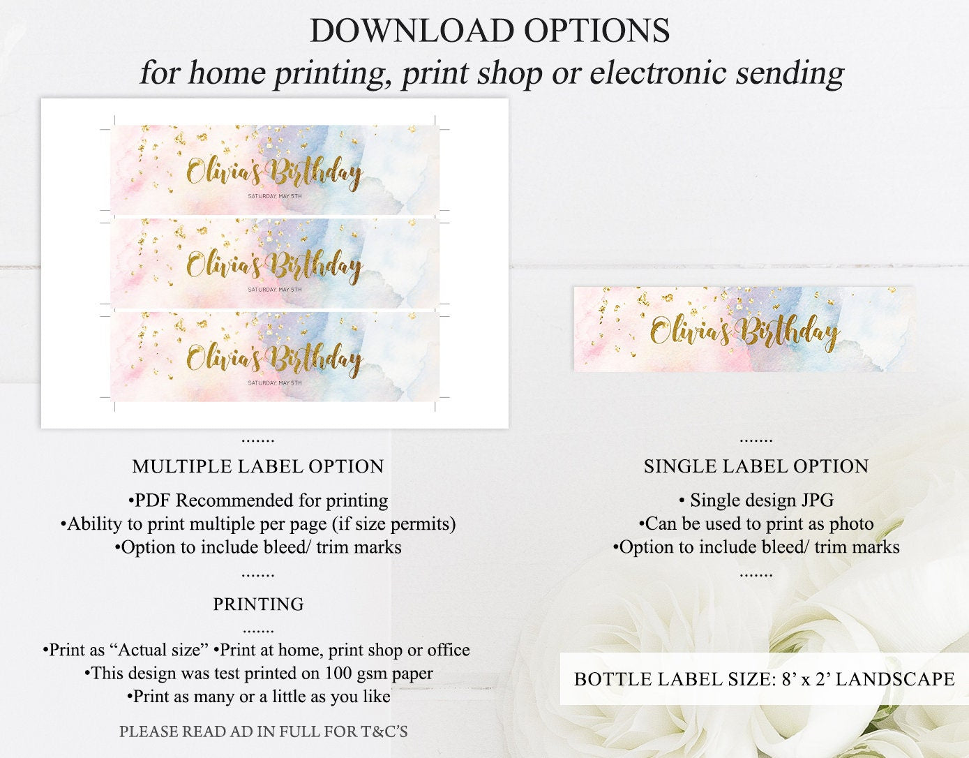 •Try before you buy! • DEMO LINK- https://www.corjl.com/d/3A5N1H MATCHING ITEMS: https://etsy.me/3llNMkz PLEASE READ AD IN FULL!! •Digital file. No physical item will be shipped •Do it yourself Editing. Edit online with Corjl or Edit with your mobile ITEM DETAILS Bottle Label Label size: 8’x2’ File type: PDF, JPEG Resolution: 300DPI PDF FILE OPTIONS: •Recommended for printing •Ability to print multiple per page (if size permits) •Option to include bleed/ trim marks JPG FILE OPTIONS: •Can be used to print as photo •Option to include bleed/ trim marks EDITING • Do it yourself editing • Mobile editing is available • Google chrome is the recommend browser for Corjl. Please download here for FREE: https://www.google.com/chrome/ • Using other browsers may not show all of Corjl's editing features • Editing on a desktop/ laptop computer is recommended to access all of Corjl features • Mobile editing is available, please use a desktop/ laptop computer to access all of Corjl features DOWNLOADS & EXPIRY •Maximum 3 downloads on the same edit •Link expires 30 days after purchase DOWNLOAD NOTICE •Once you have reached your download limits &/ “approve proof” in Corjl. You will not be able to request further downloads on your design. Further download requests are not permitted WHAT IS EDITABLE •Text - colours, fonts, size, move, delete & rotation. •Please see demo link for what you can and can’t do WHAT YOU CAN’T EDIT •Template size •Template orientation •Graphics CAN NOT BE deleted, moved, or changed in colour •Please see demo link for what you can and can’t do HOW TO 1. Choose design template & checkout on Etsy. 2. Email will be sent from Corjl. Follow link to access template 3. Edit, save & print INSTRUCTIONS •Instructions on how to edit your design have been written by Corjl and will be available with your purchase. PRINTING •Colours can vary depending on the monitor, printer & cardstock •Can be printed at home •Home printing will require you to select the high quality print settings, select appropriate paper thickness & click "Actual size" prior to you printing •This design was test printed on 100 gsm paper •Can be printed at local print shop. Please check printing requirements & any printing restrictions prior to purchase PERSONAL USE ONLY. This item cannot be shared, re-sold, or used commercially for profit. REFUND POLICY •We are unable to provide a refund/ exchange on commenced & completed work, instant downloads or self-editing link templates. Please use the demo link to work out if this product is right for you. Copyright © 2018 by InvitePrintablesShop PTY LTD All rights reserved. This file or any portion thereof may not be reproduced or resold without the express written permission of the publisher (including edits to the design). Our files are provided as high-resolution PDFs – the end result is dependent upon the printer and paper used. If using a professional printing company, InvitePrintablesShop are not responsible for their specific printing requirements, paper or colour quality. Any changes required to the template are not included with your purchase – the files come as described in the listing only and cannot be changed. Thank you for visiting Invite Printables Shop:) #abcdef12345