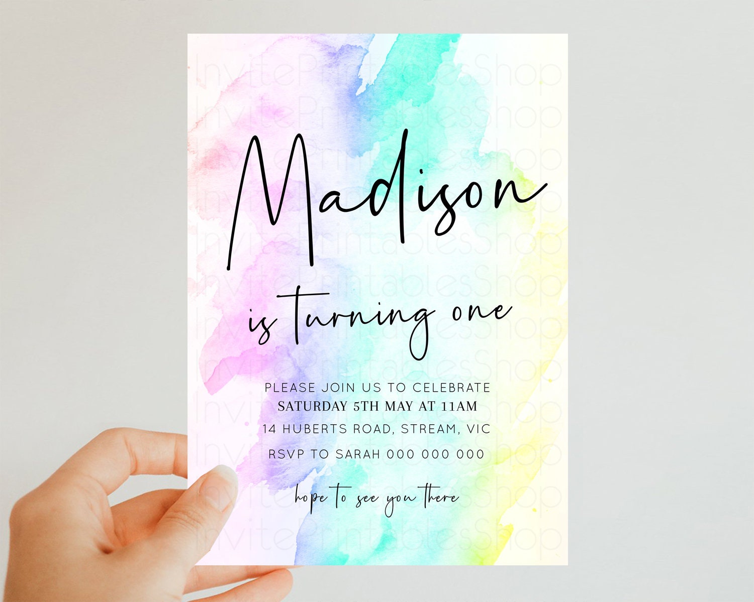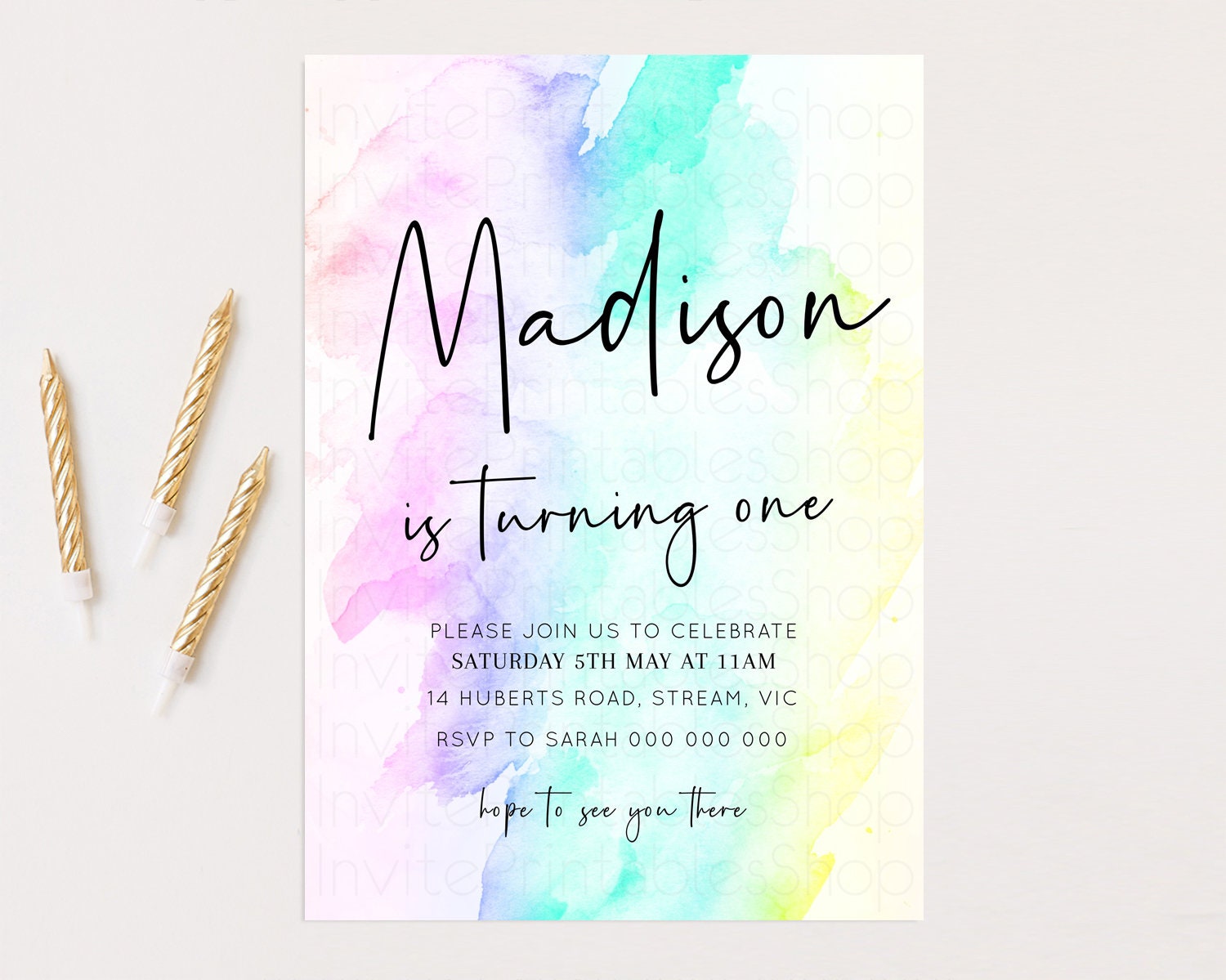 Rainbow Watercolor Birthday Invitation Pastel Rainbow Birthday Invite Ombre Colorful Invite Glitter Art Party Invitation 1st 2nd 3rd F210