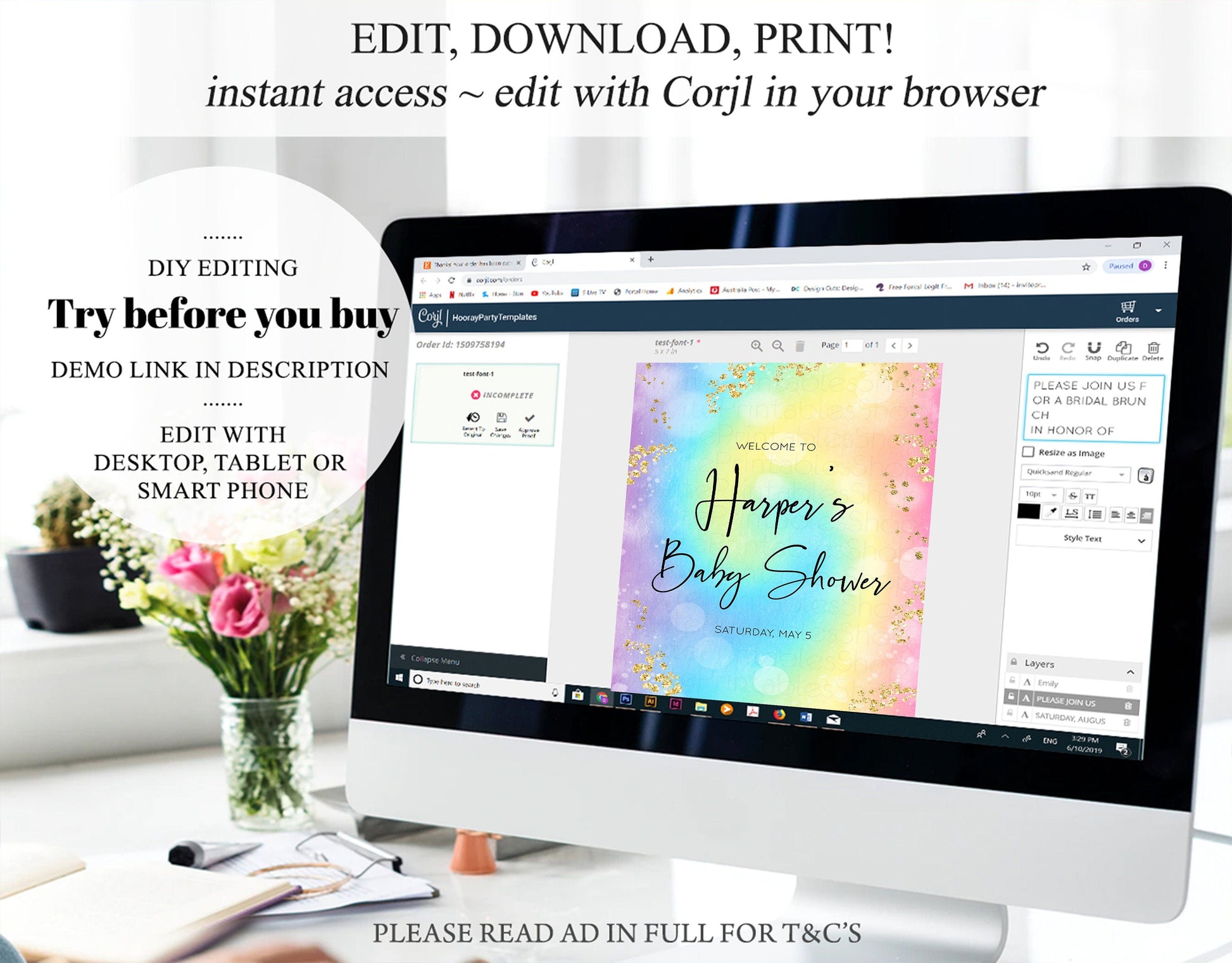 • After purchase, Corjl emails your editing link. Allow up to 15 minutes for delivery.