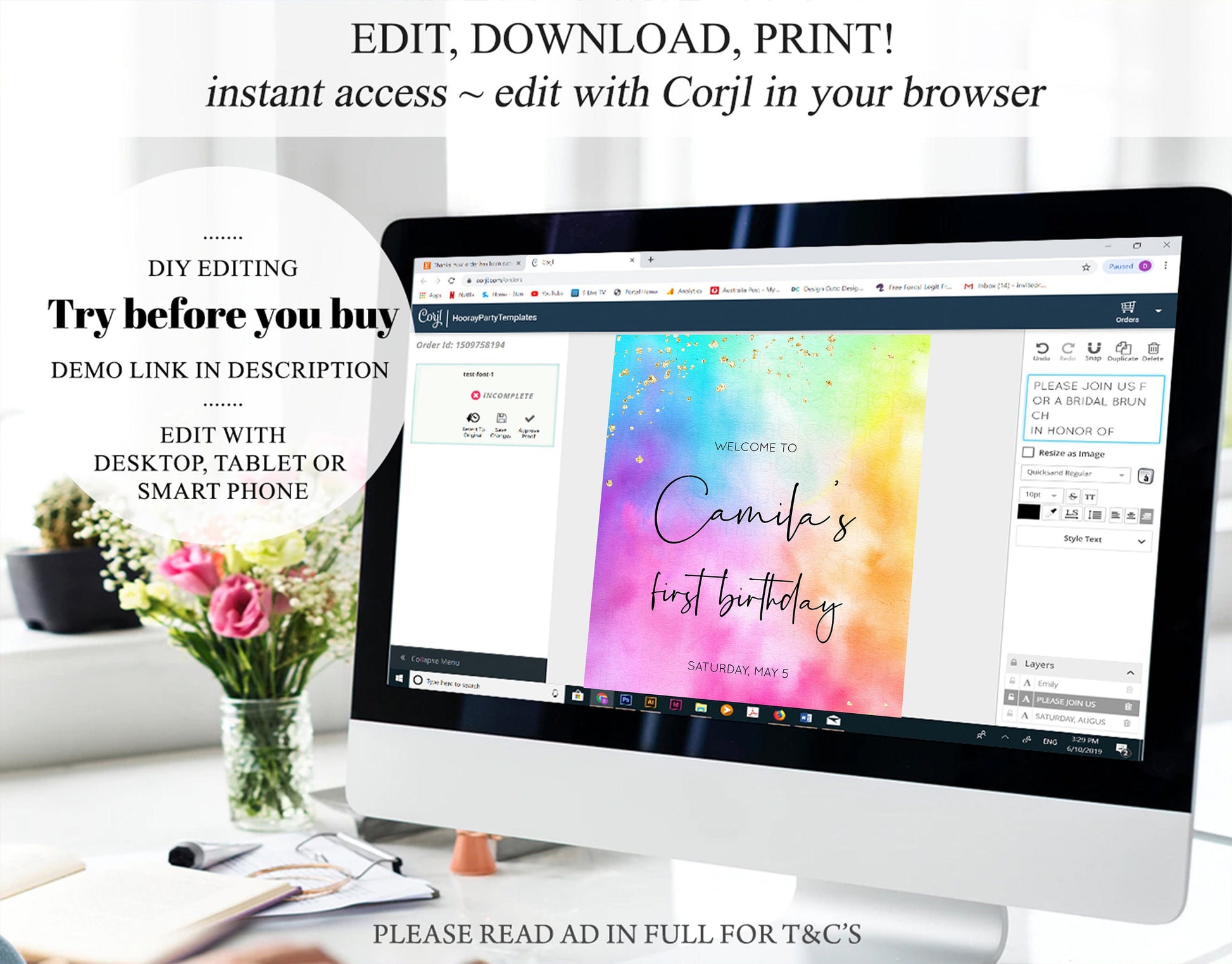 • You edit/ DIY editing. Edit online with Corjl in your browser using your desktop or smartphone