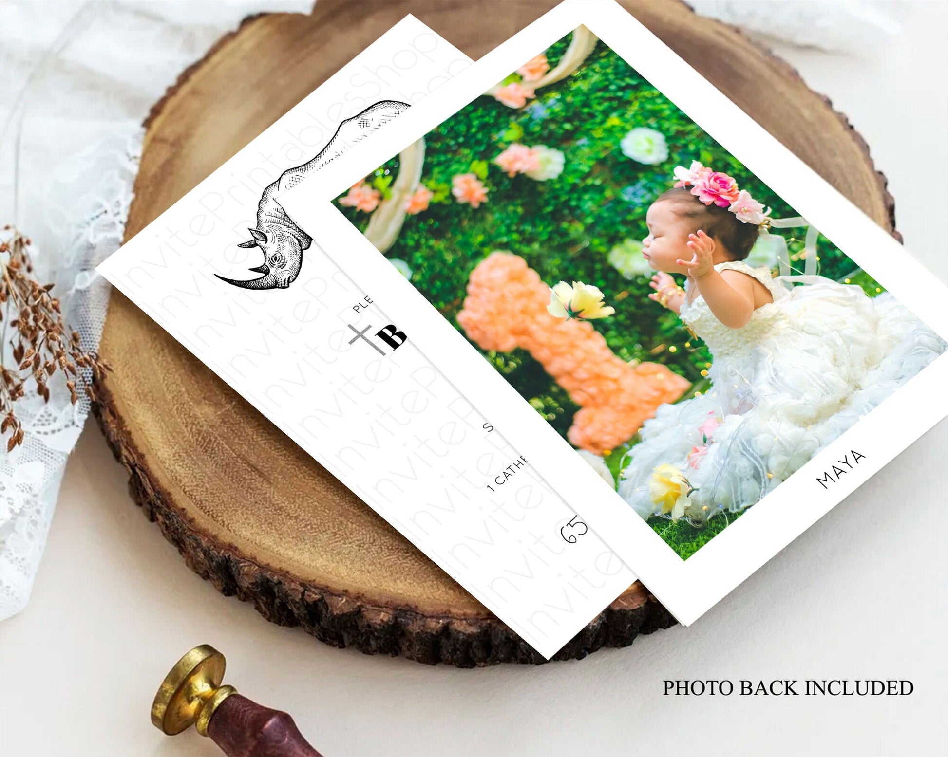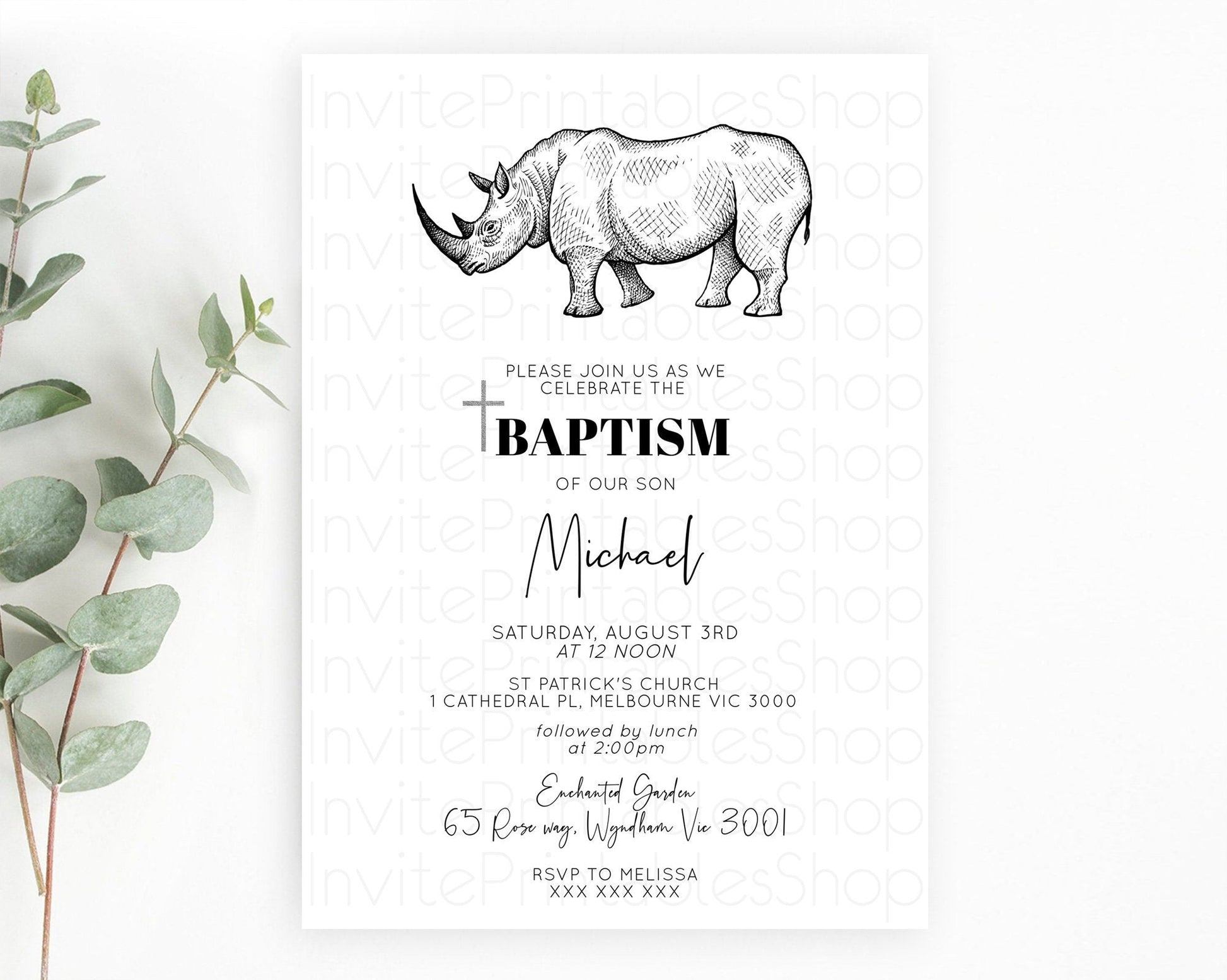 Rhino Baptism Invitation Rhino Baptism 1st Birthday Invitation Rhino Safari Adventure Christening Invitation Palm Leaf Invite Zoo D10253