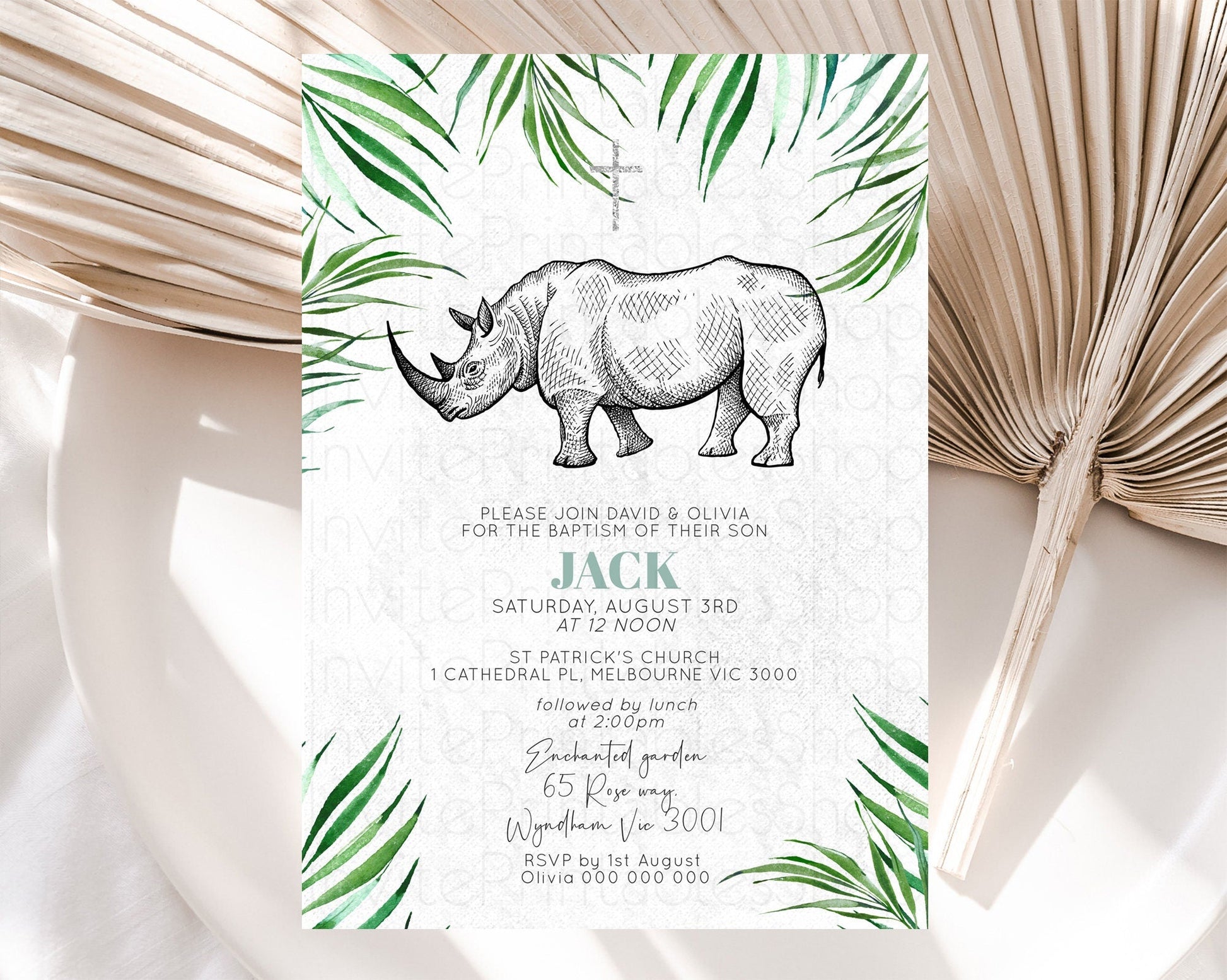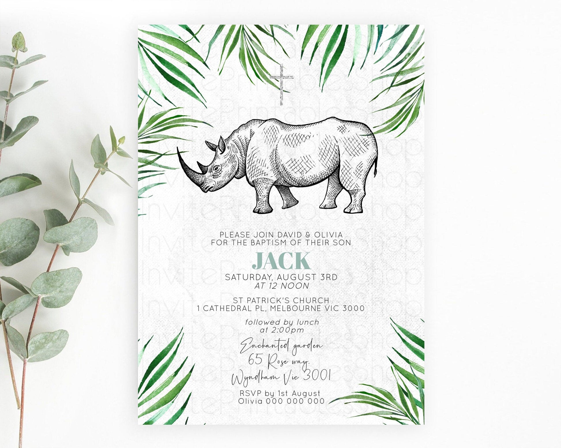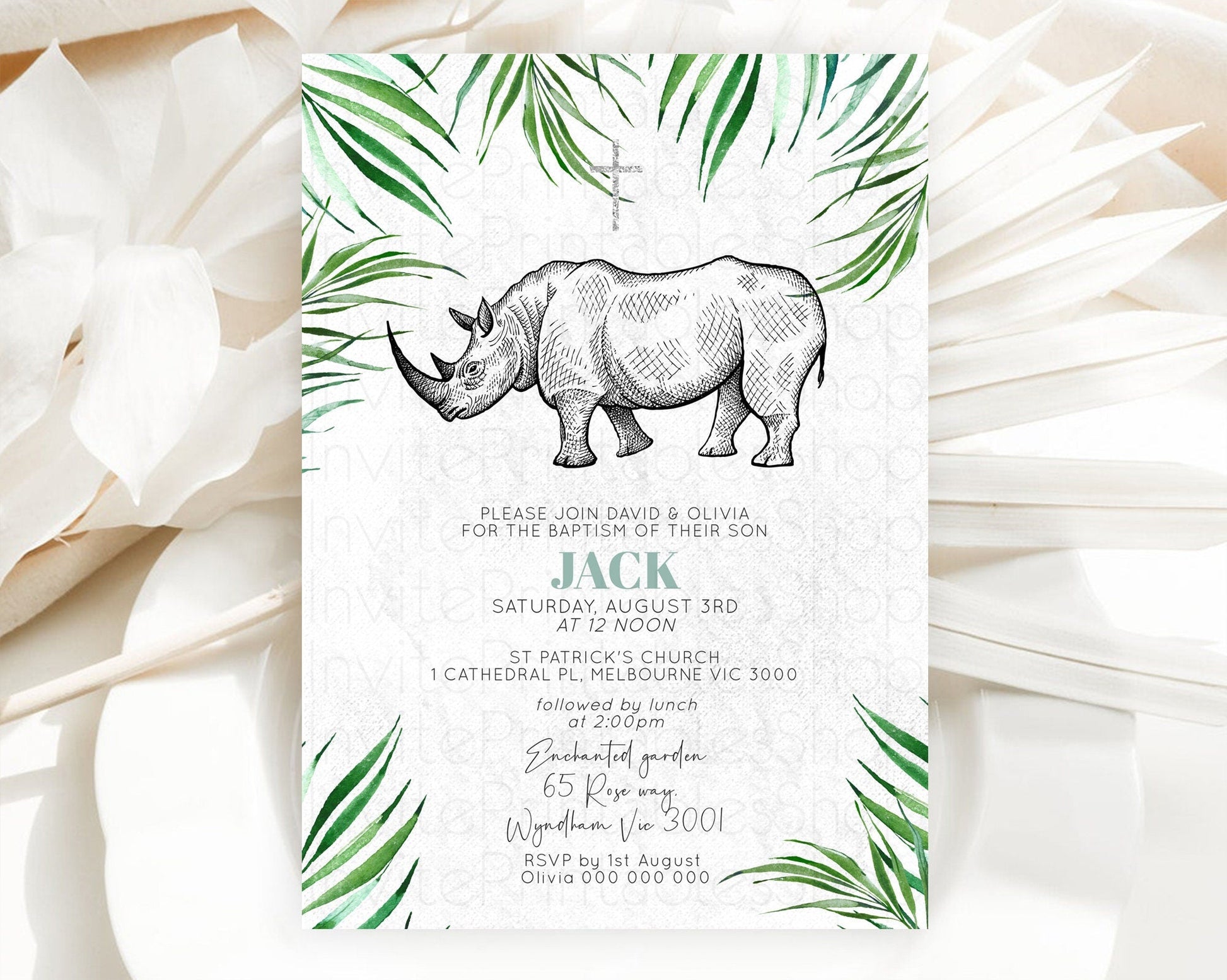 Rhino Baptism Invitation Rhino Baptism 1st Birthday Invitation Rhino Safari Adventure Christening Invitation Palm Leaf Invite Zoo D10848
