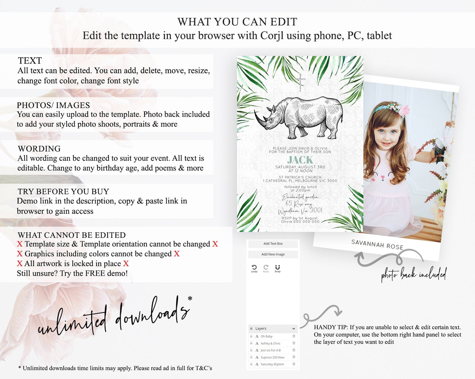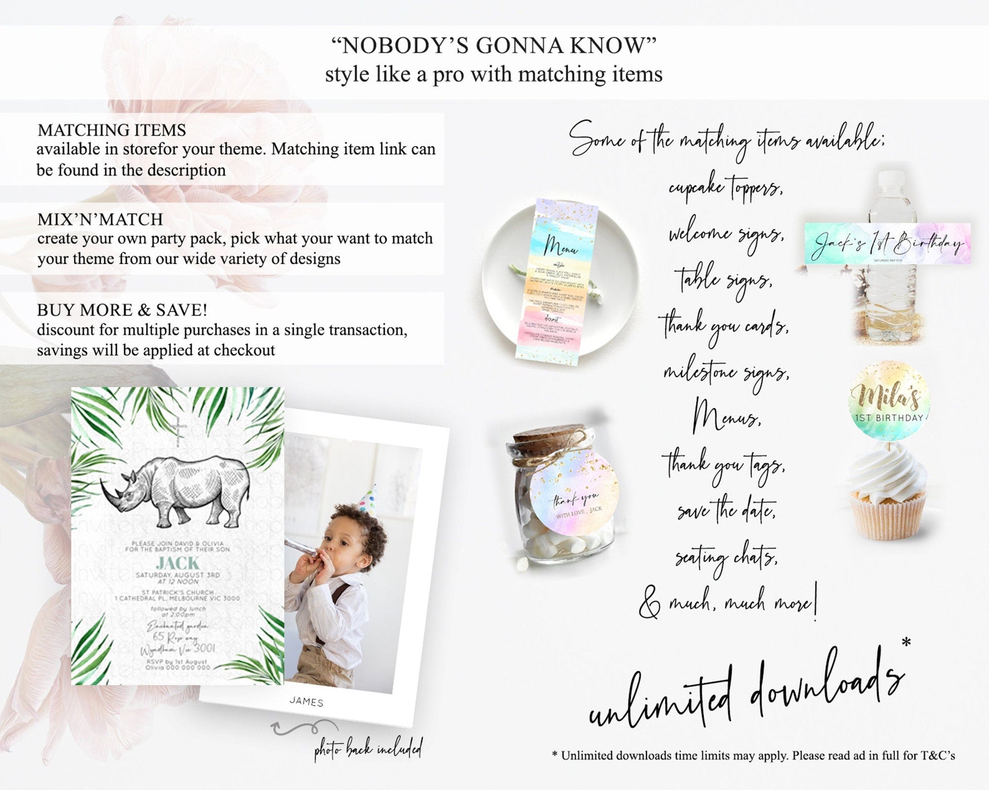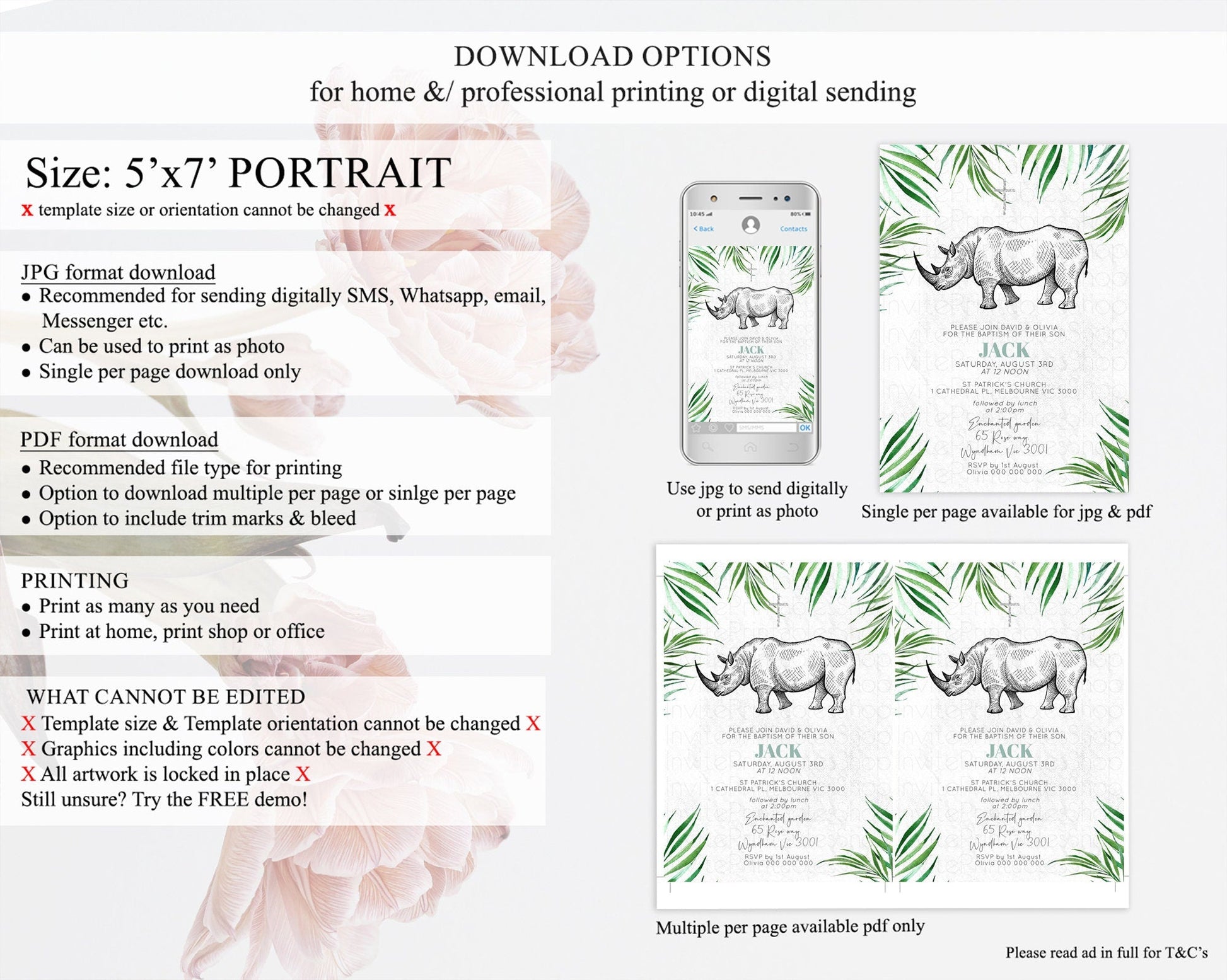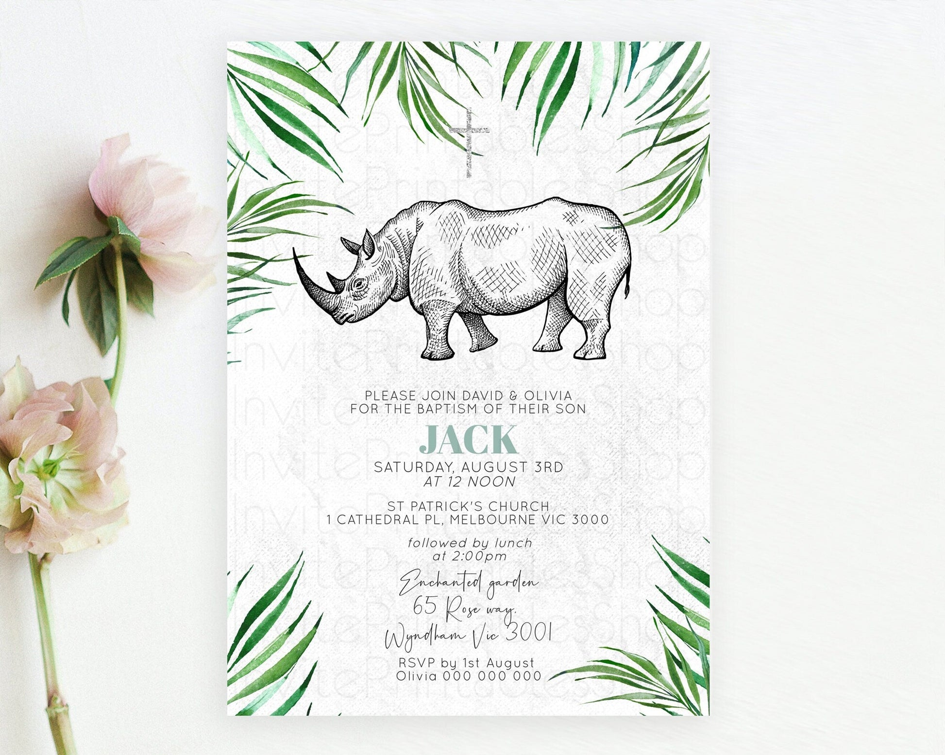 Rhino Baptism Invitation Rhino Baptism 1st Birthday Invitation Rhino Safari Adventure Christening Invitation Palm Leaf Invite Zoo D10848