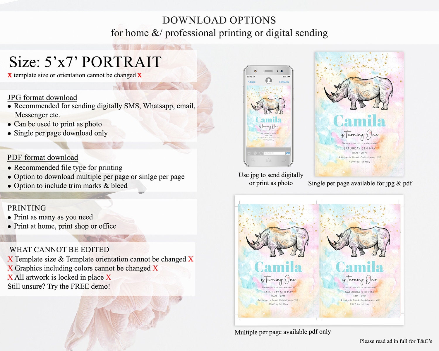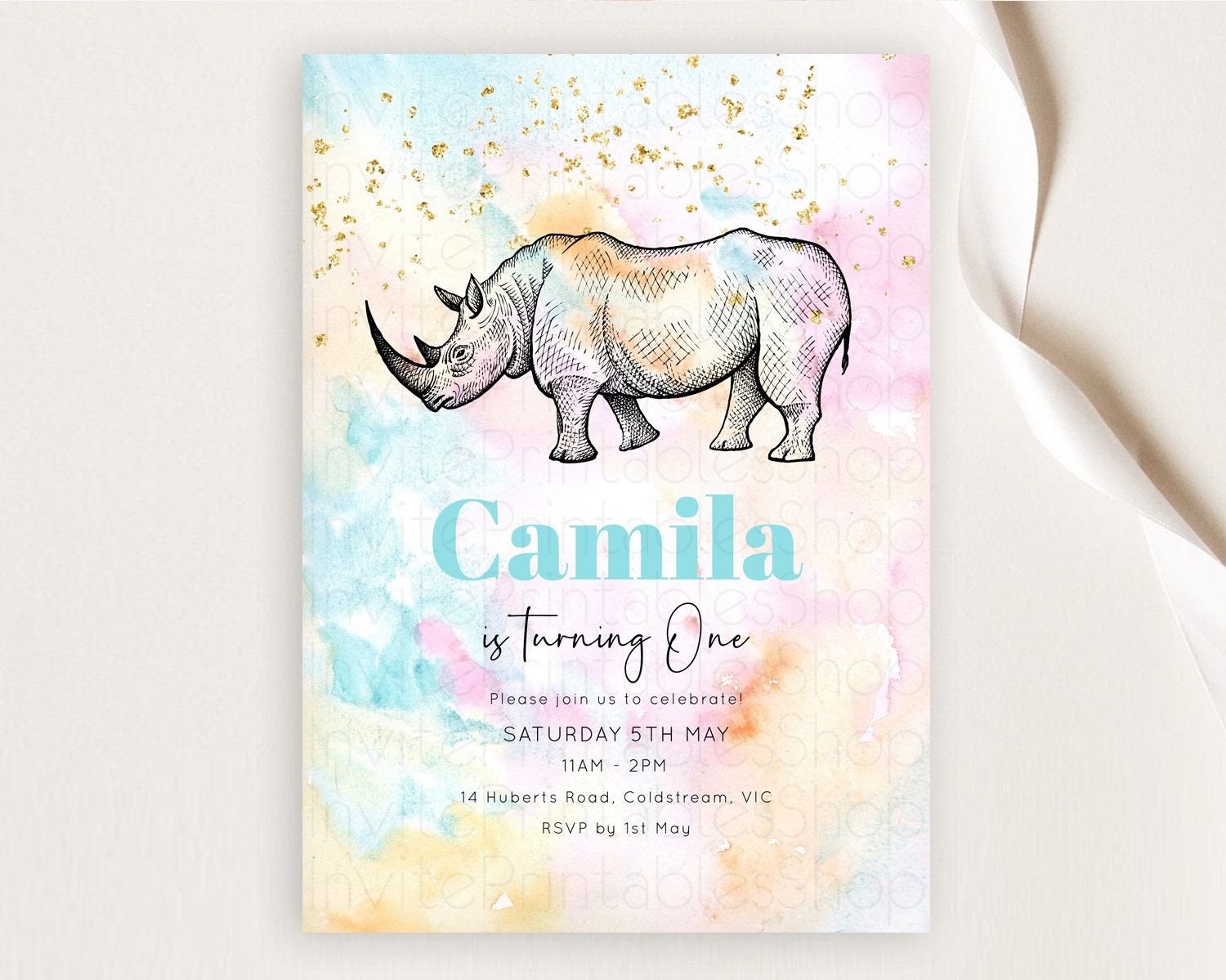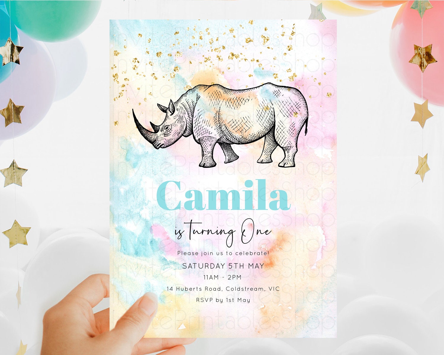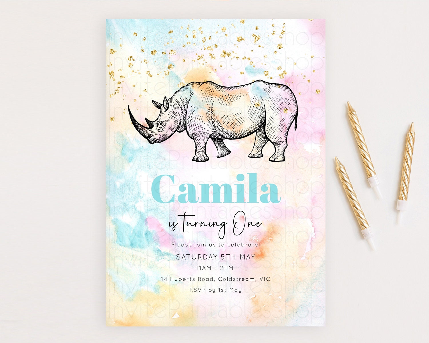 Rhino Birthday Invitation Rhino Invitation Rhino Birthday Pastel Watercolor Rhino Invitation Rainbow Rhino Party First Birthday D10287
