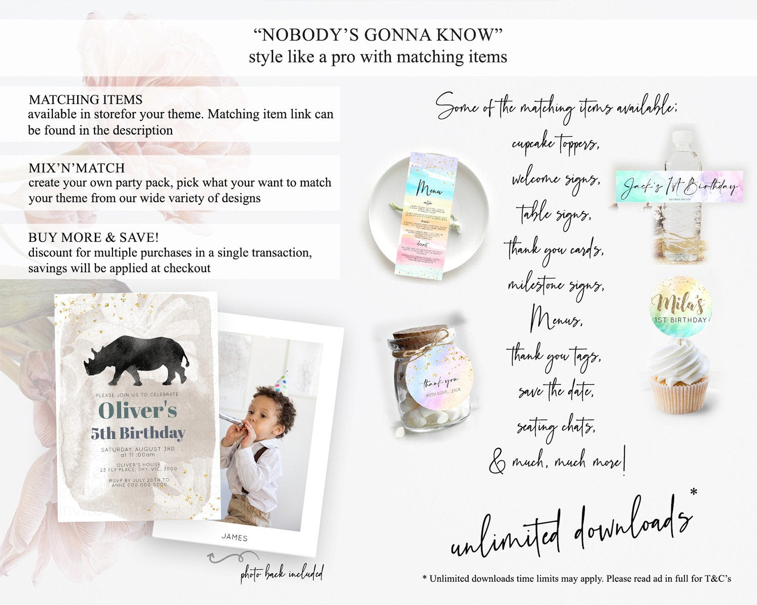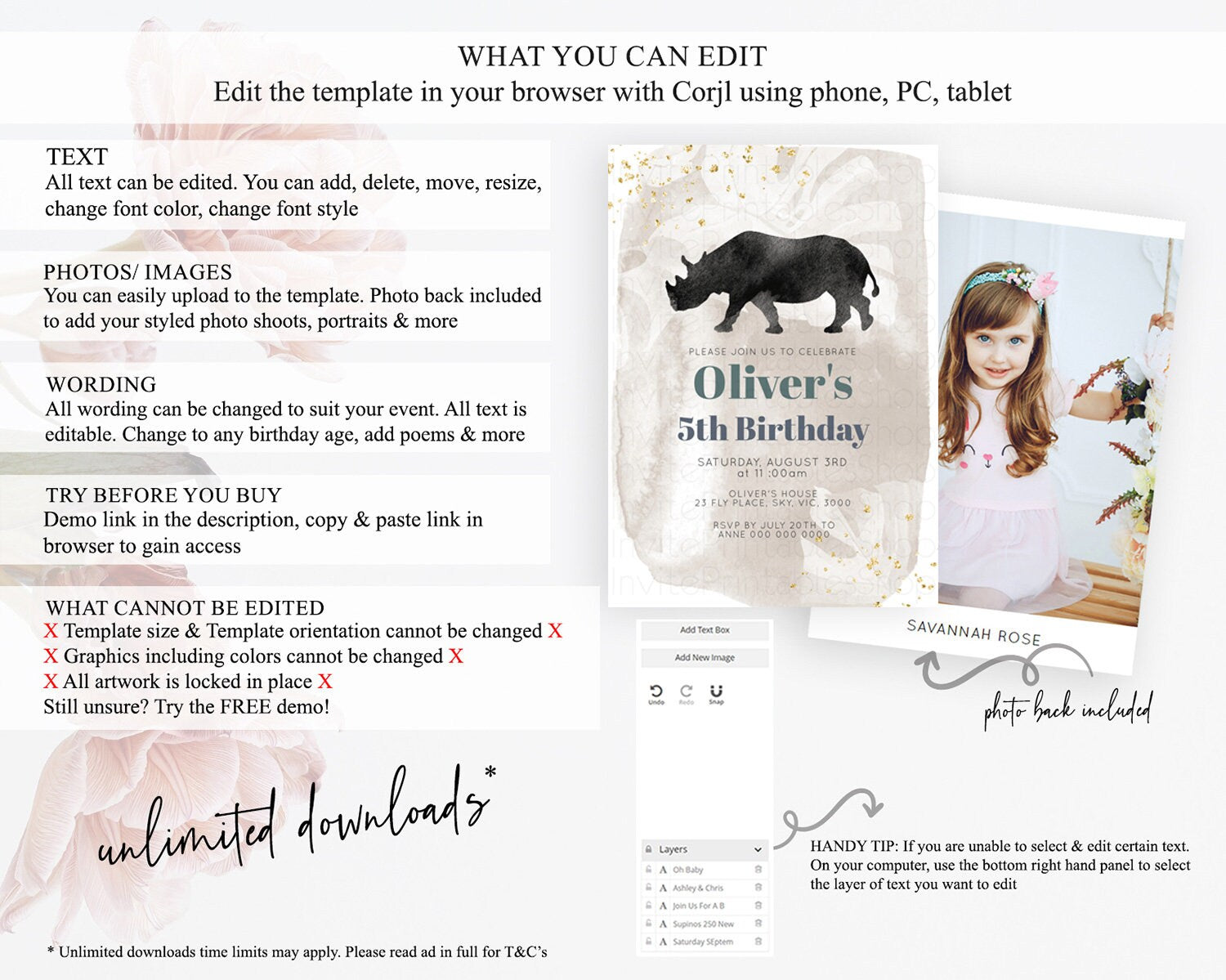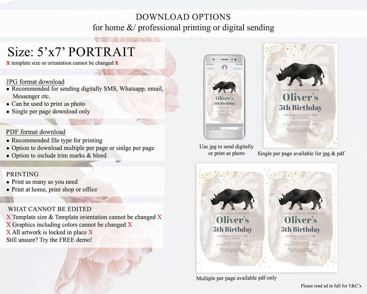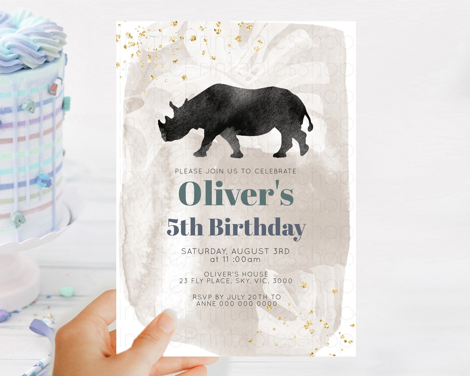 Rhino Birthday Invitation Rhino Invitation Rhino Birthday Rhino Safari Adventure Invite Rhino Palm Leaf Invite Zoo Party D10336