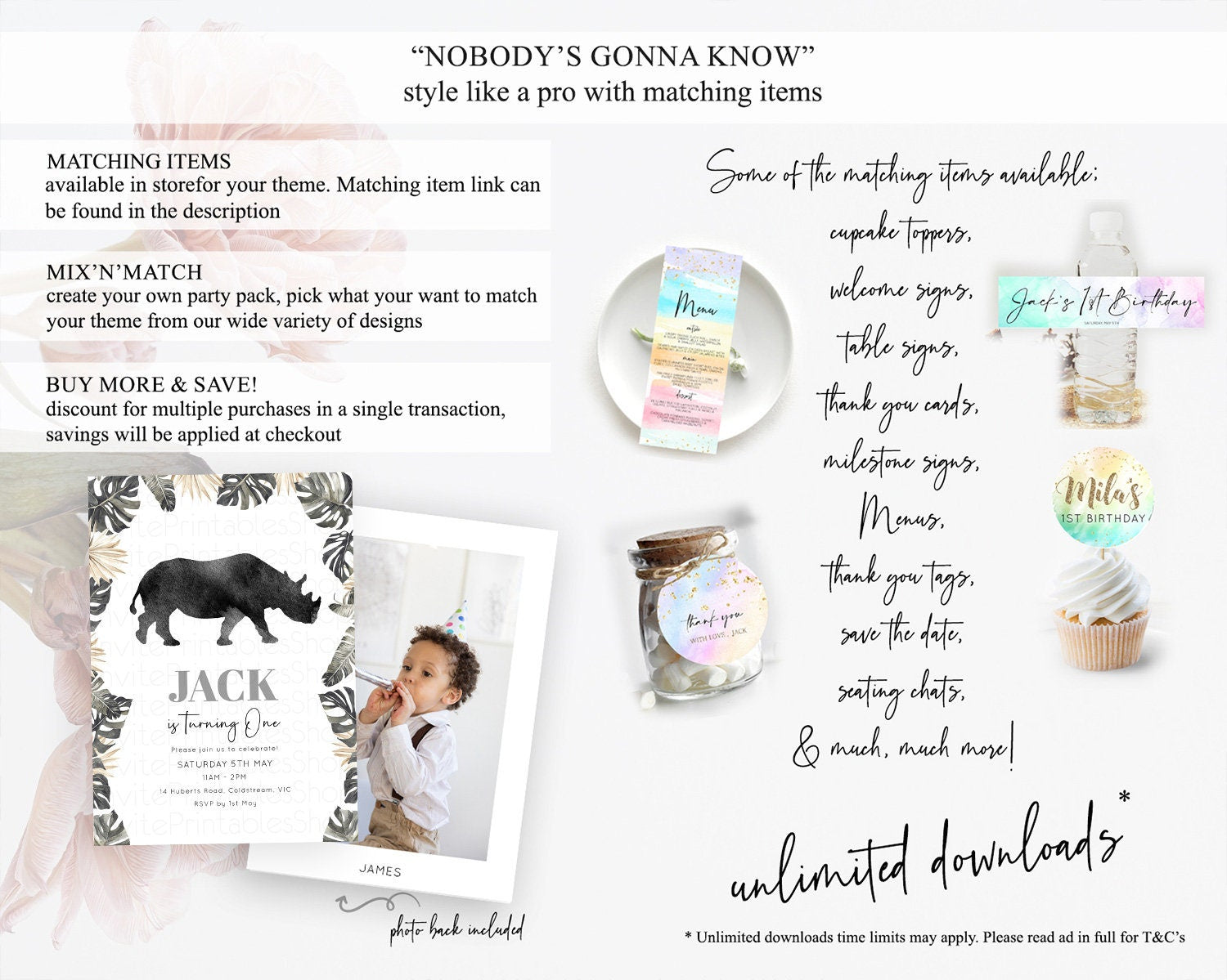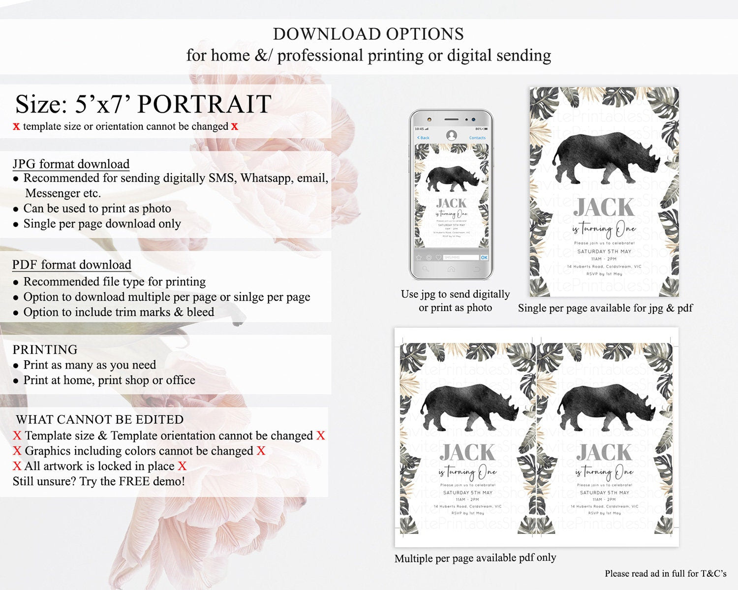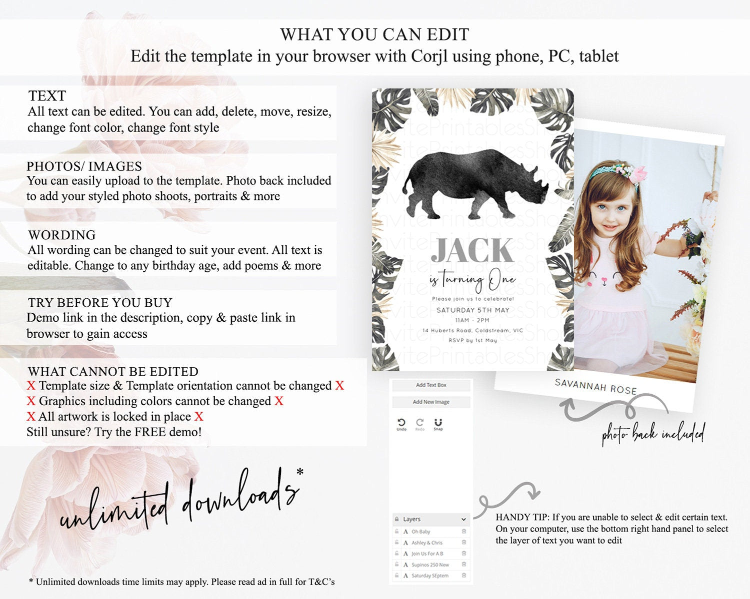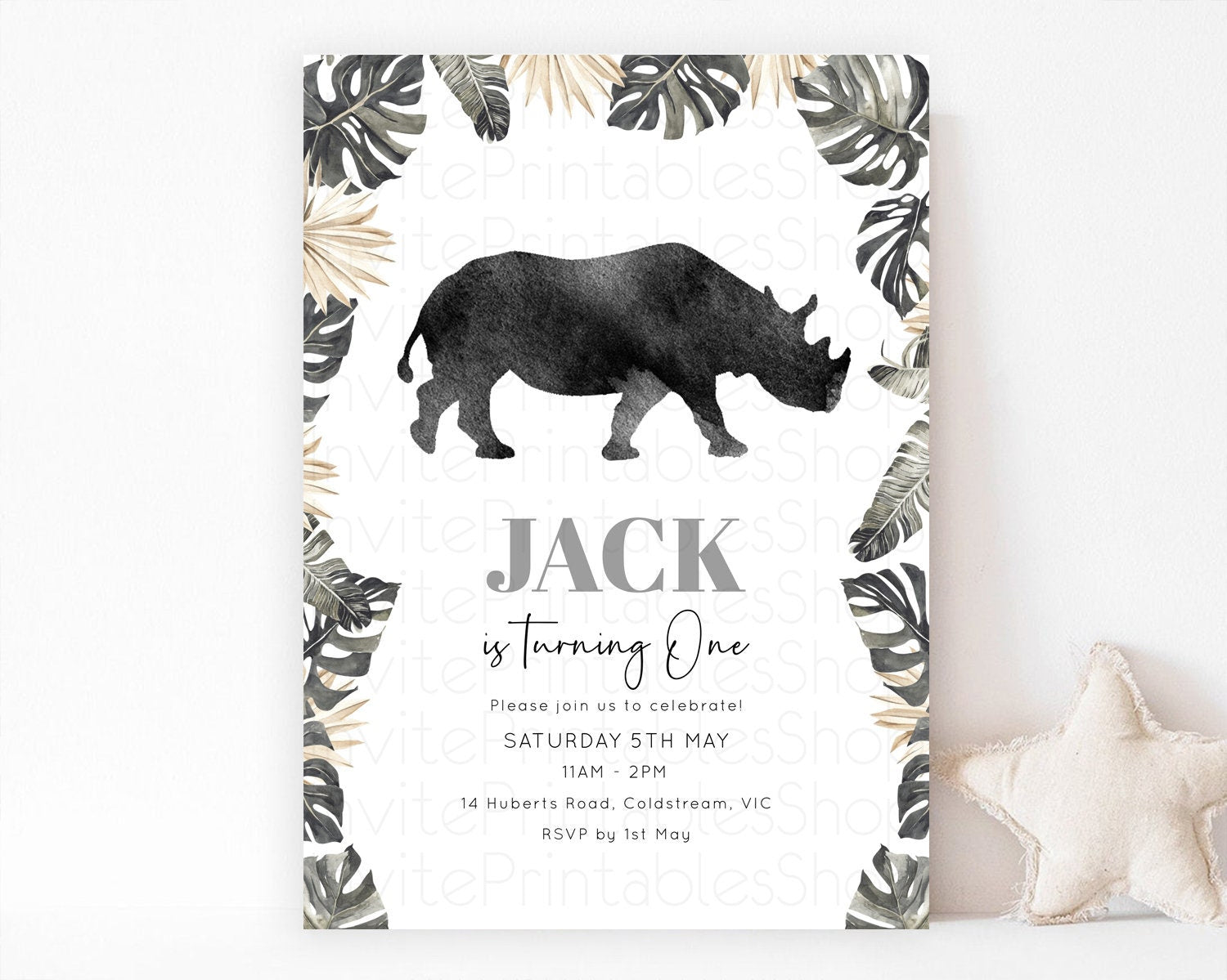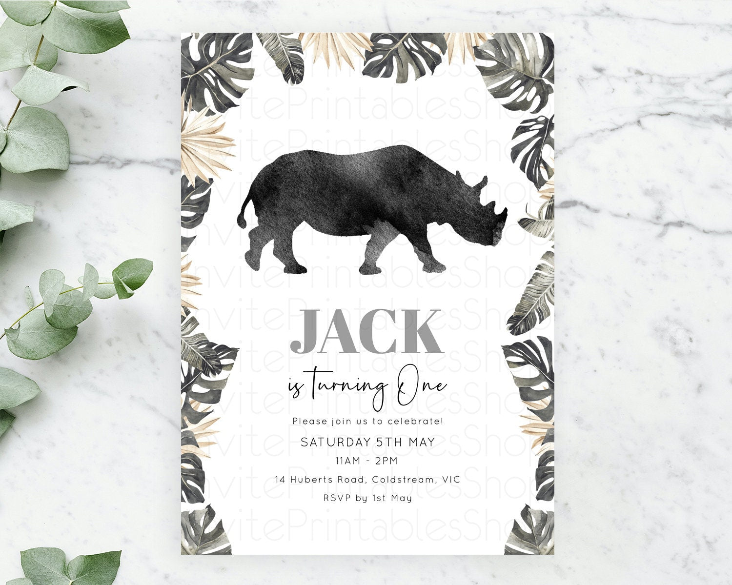 Rhino Birthday Invitation Rhino Invitation Rhino Birthday Rhino Safari Adventure Invite Rhino Palm Leaf Invite Zoo Party D10805