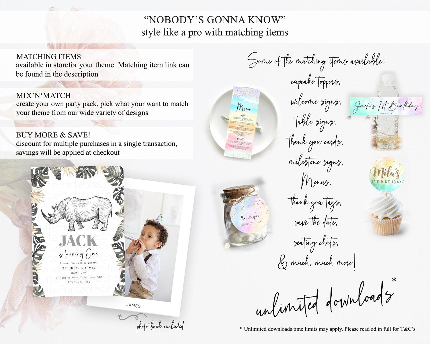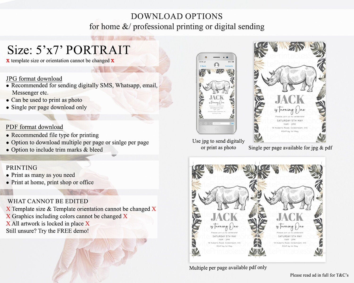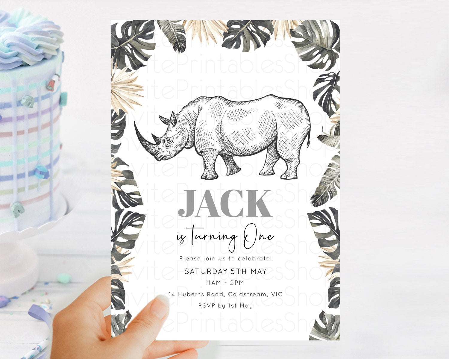 Rhino Birthday Invitation Rhino Invitation Rhino Birthday Rhino Safari Adventure Invite Rhino Palm Leaf Invite Zoo Party D10826