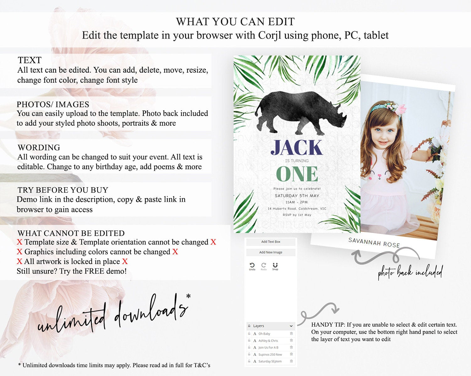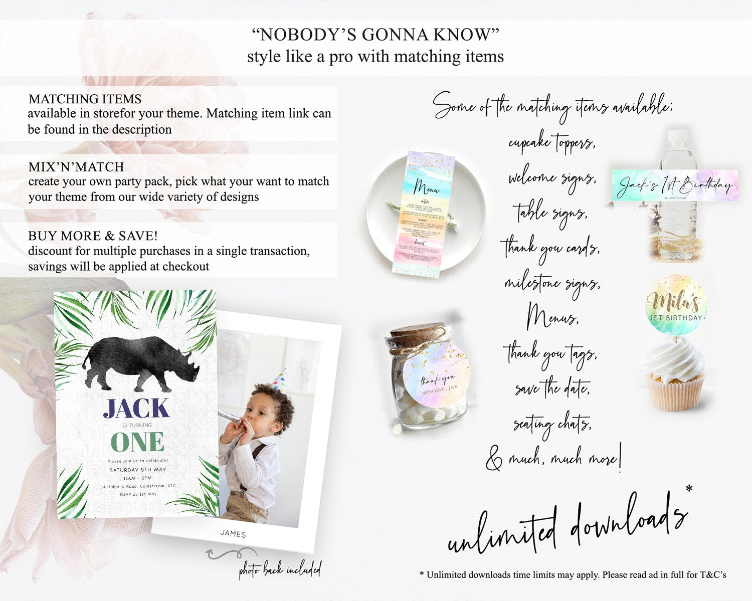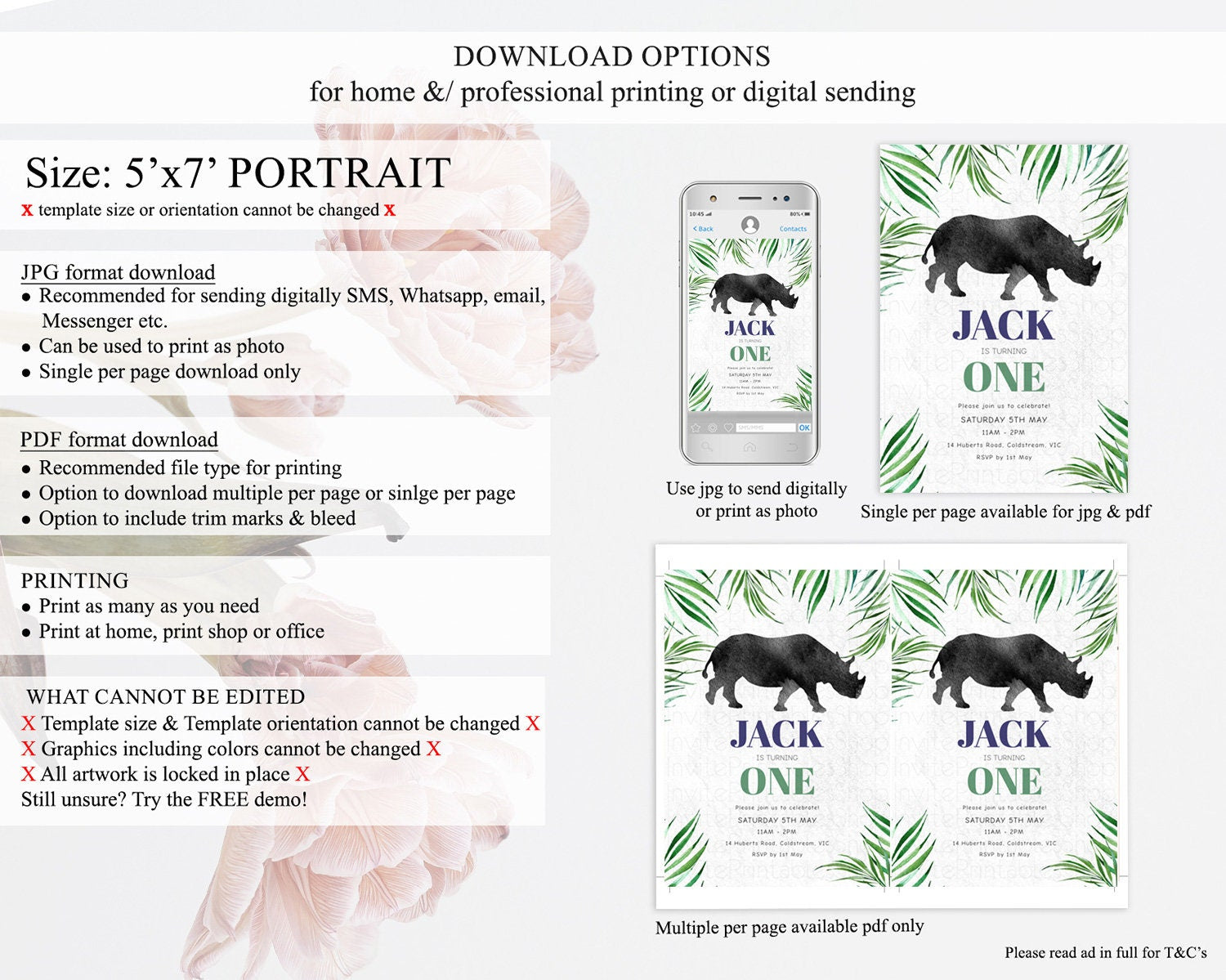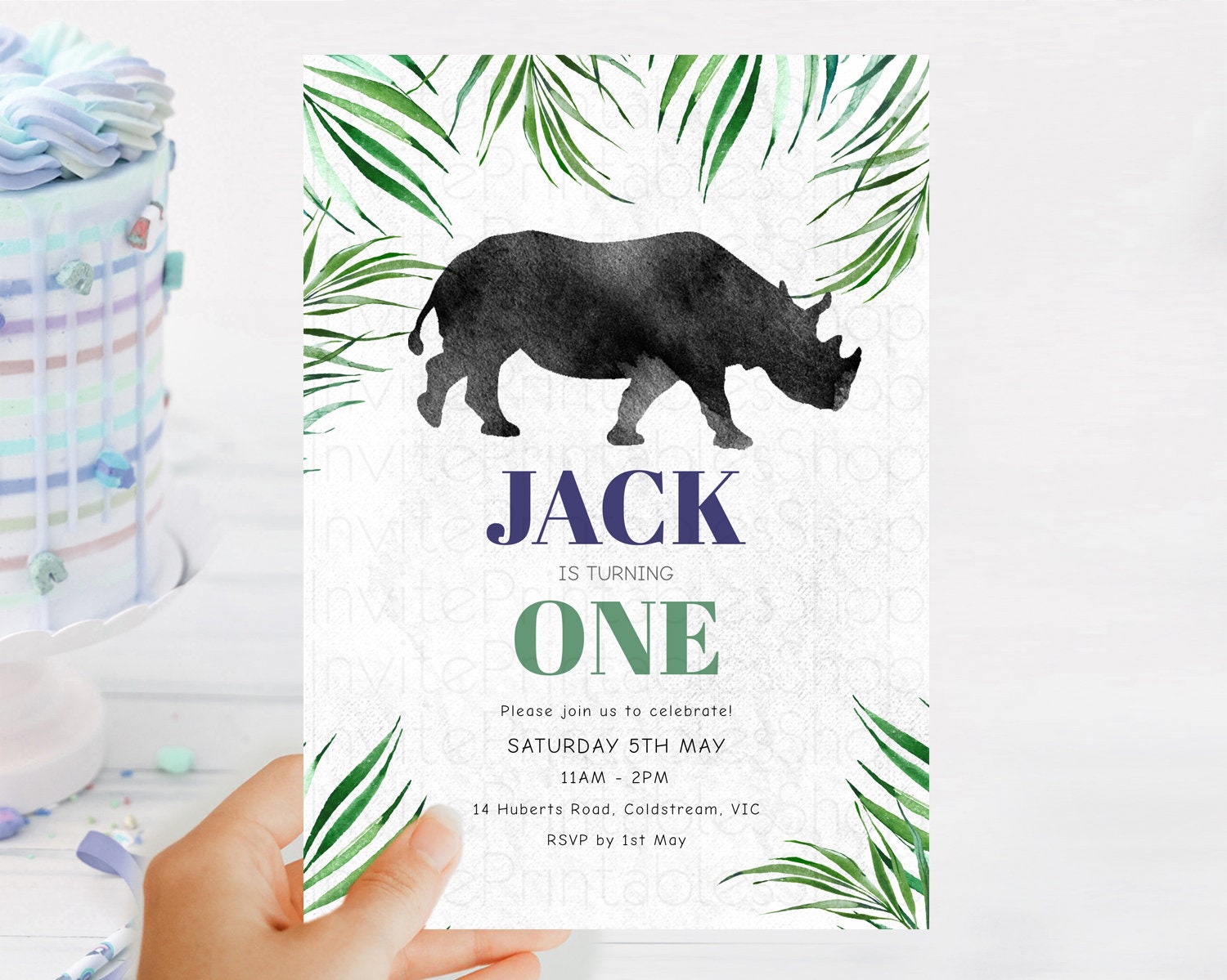 Rhino Birthday Invitation Rhino Invitation Rhino Birthday Rhino Safari Adventure Invite Rhino Palm Leaf Invite Zoo Party D10843