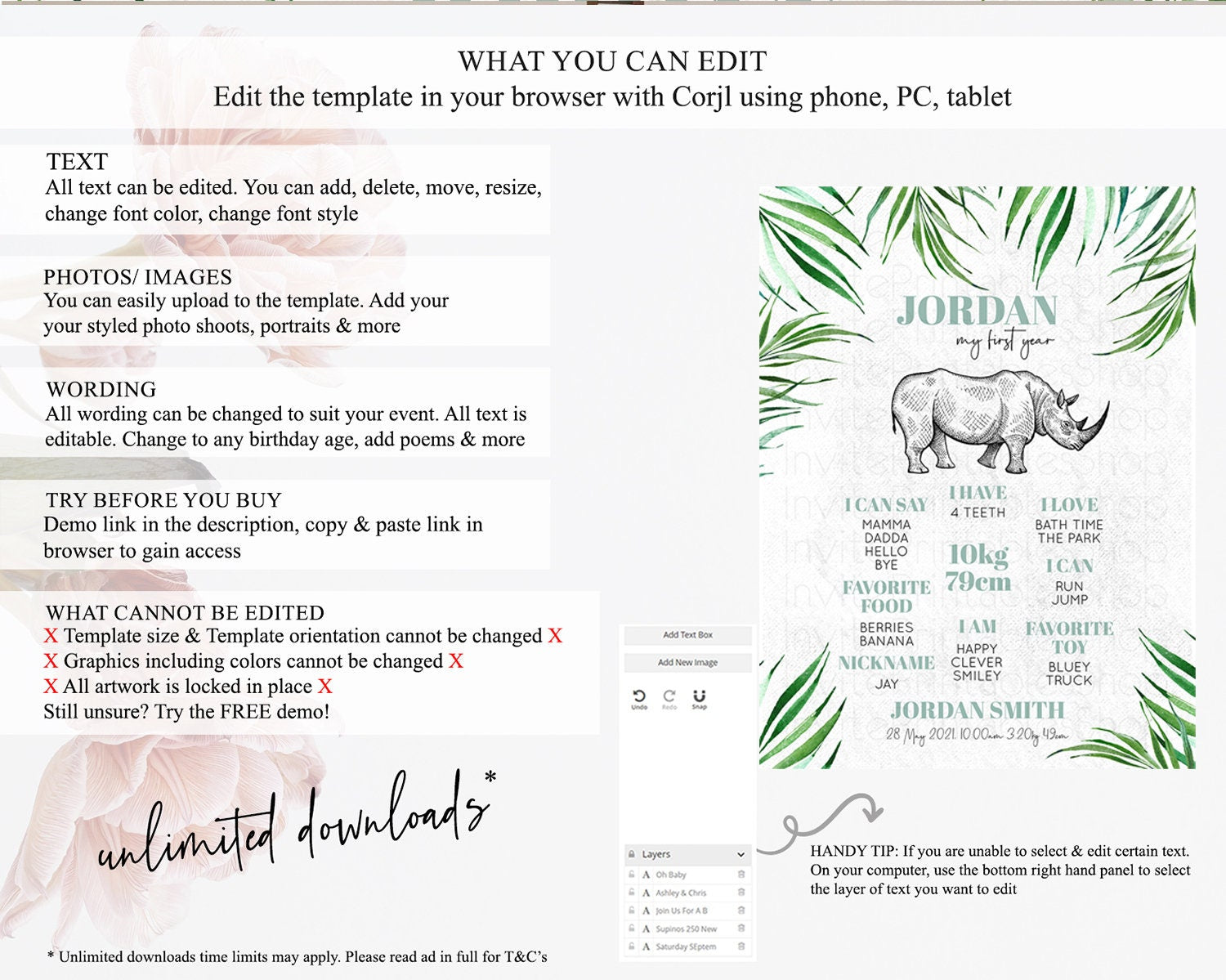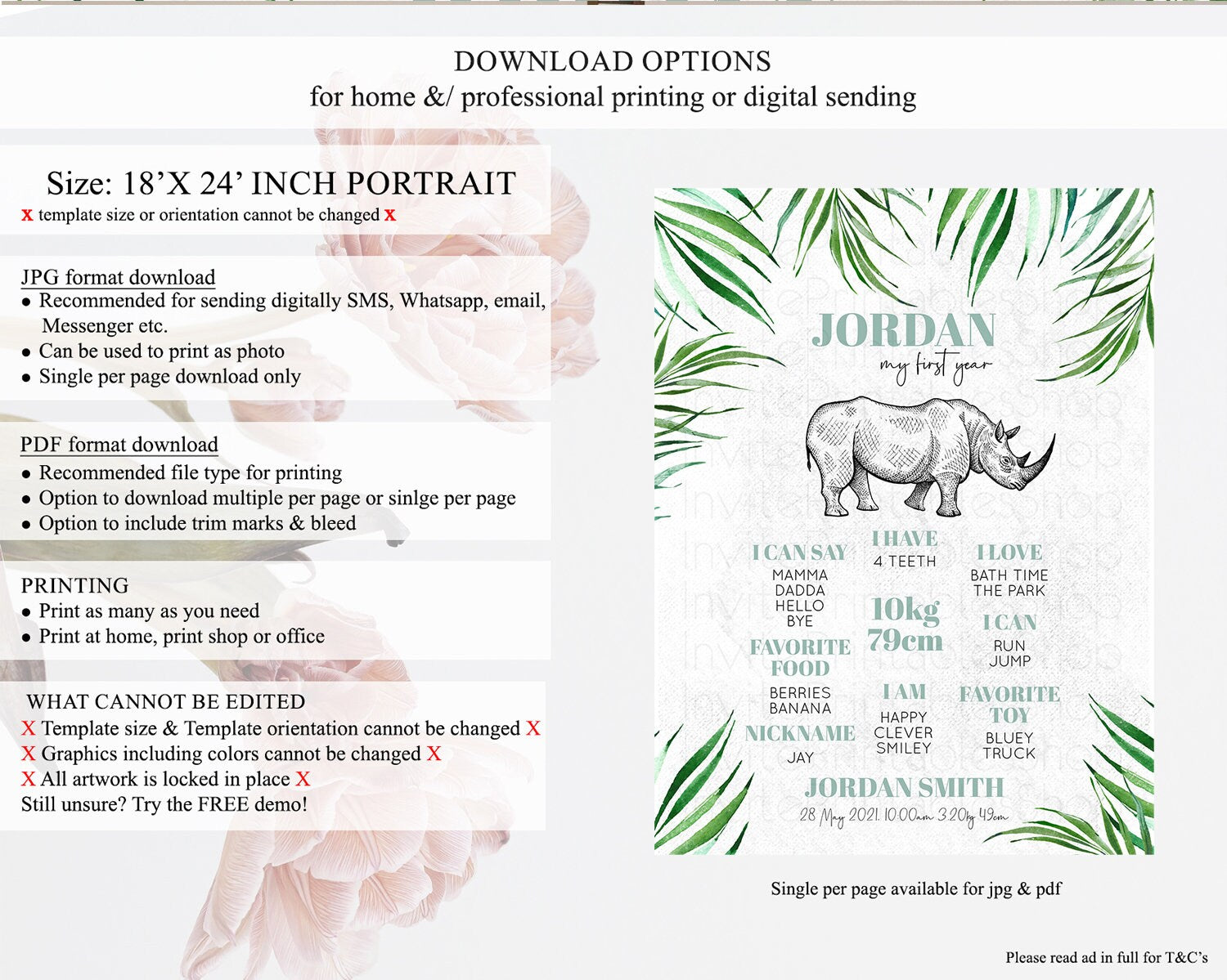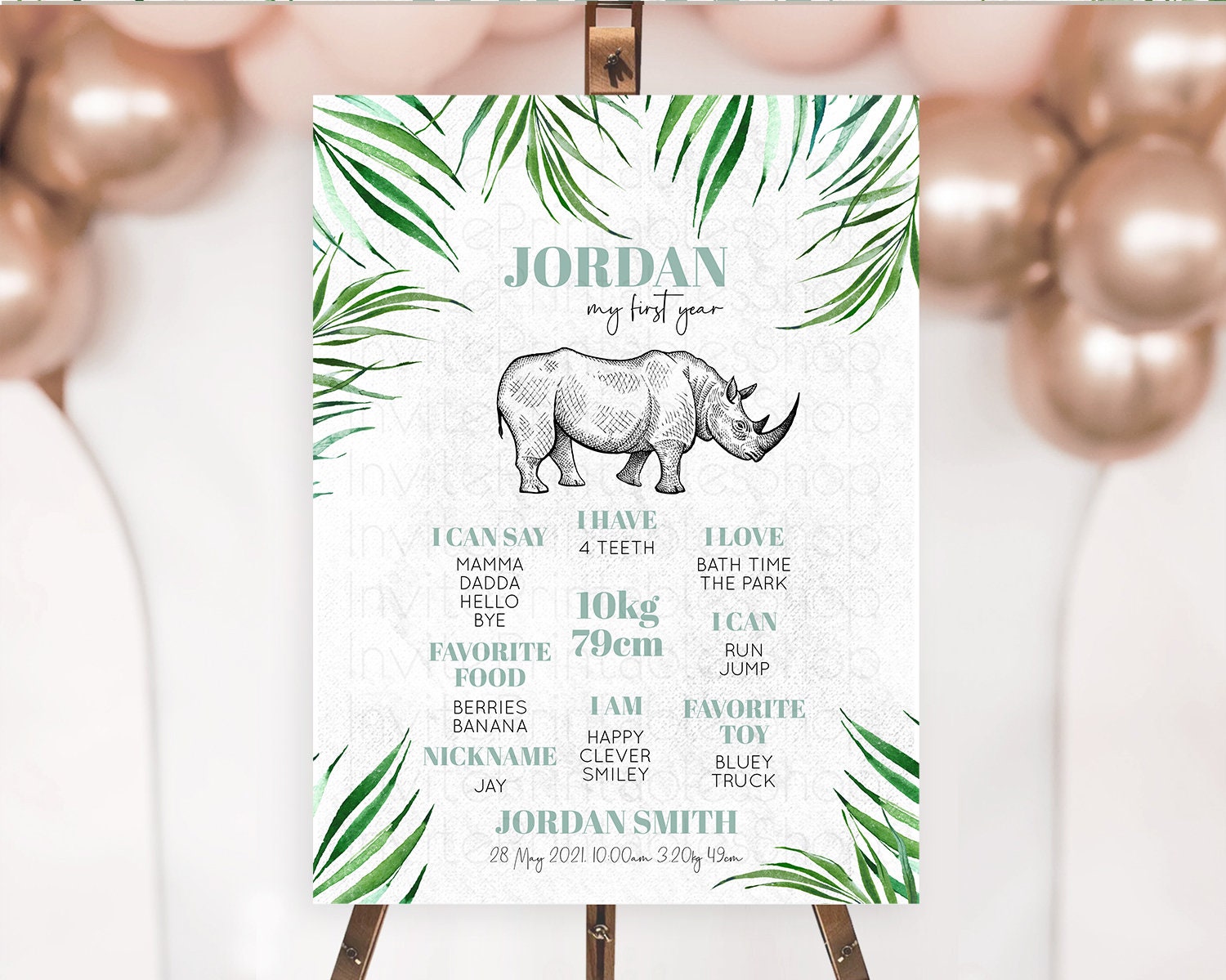 Rhino First Birthday Milestone Board Rhino Milestone Poster Rhino Decor Safari Adventure Rhino First Birthday Welcome Sign D10848