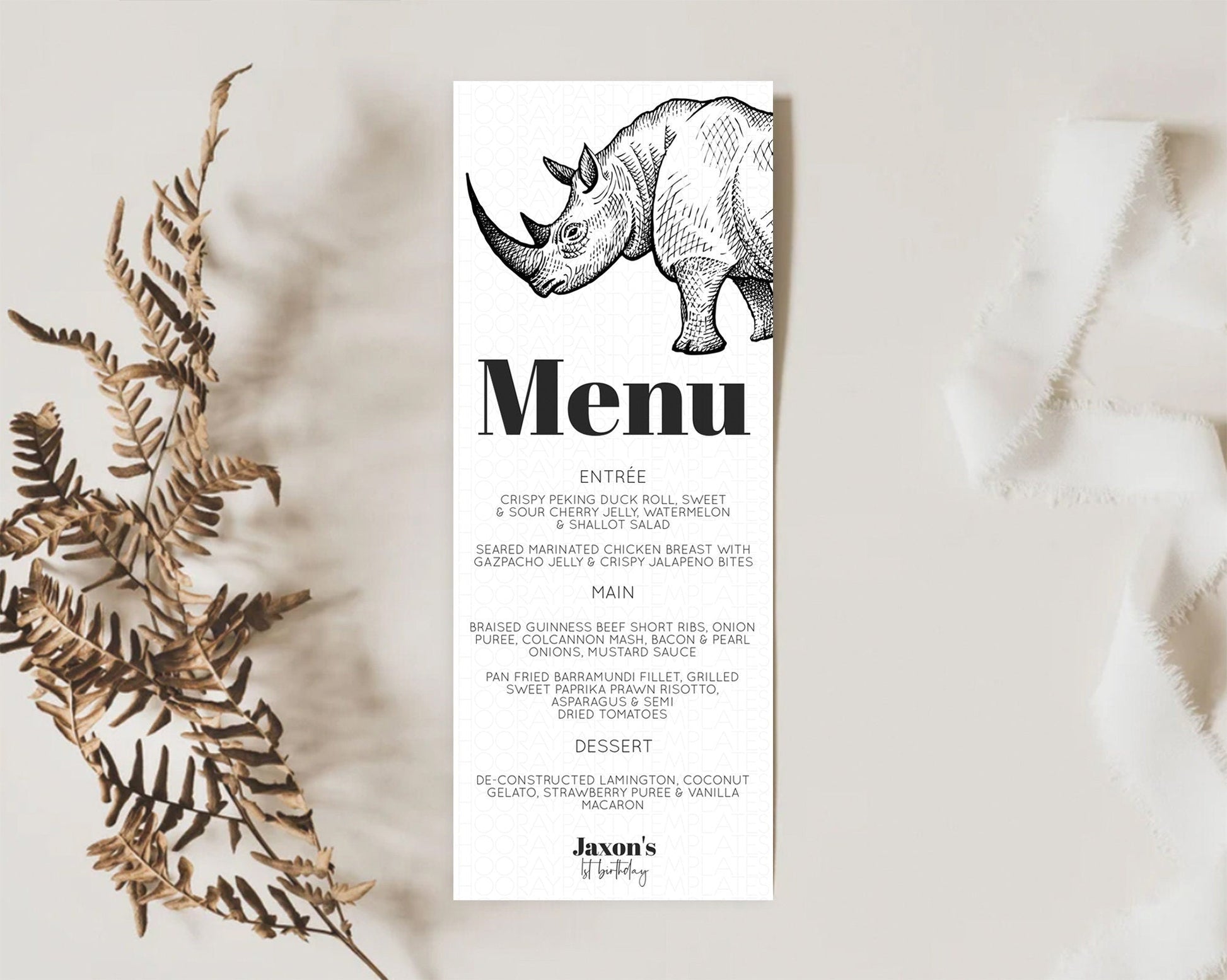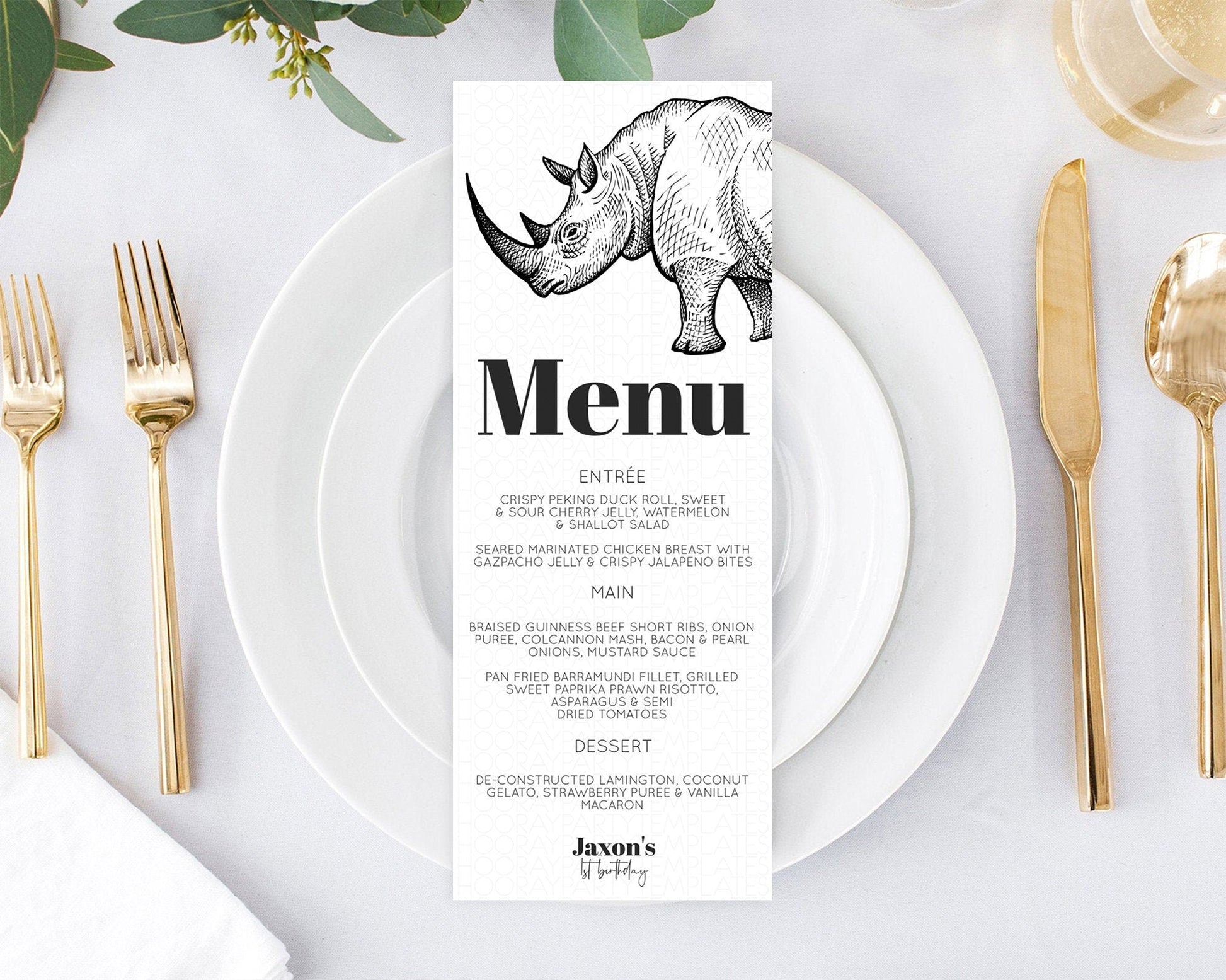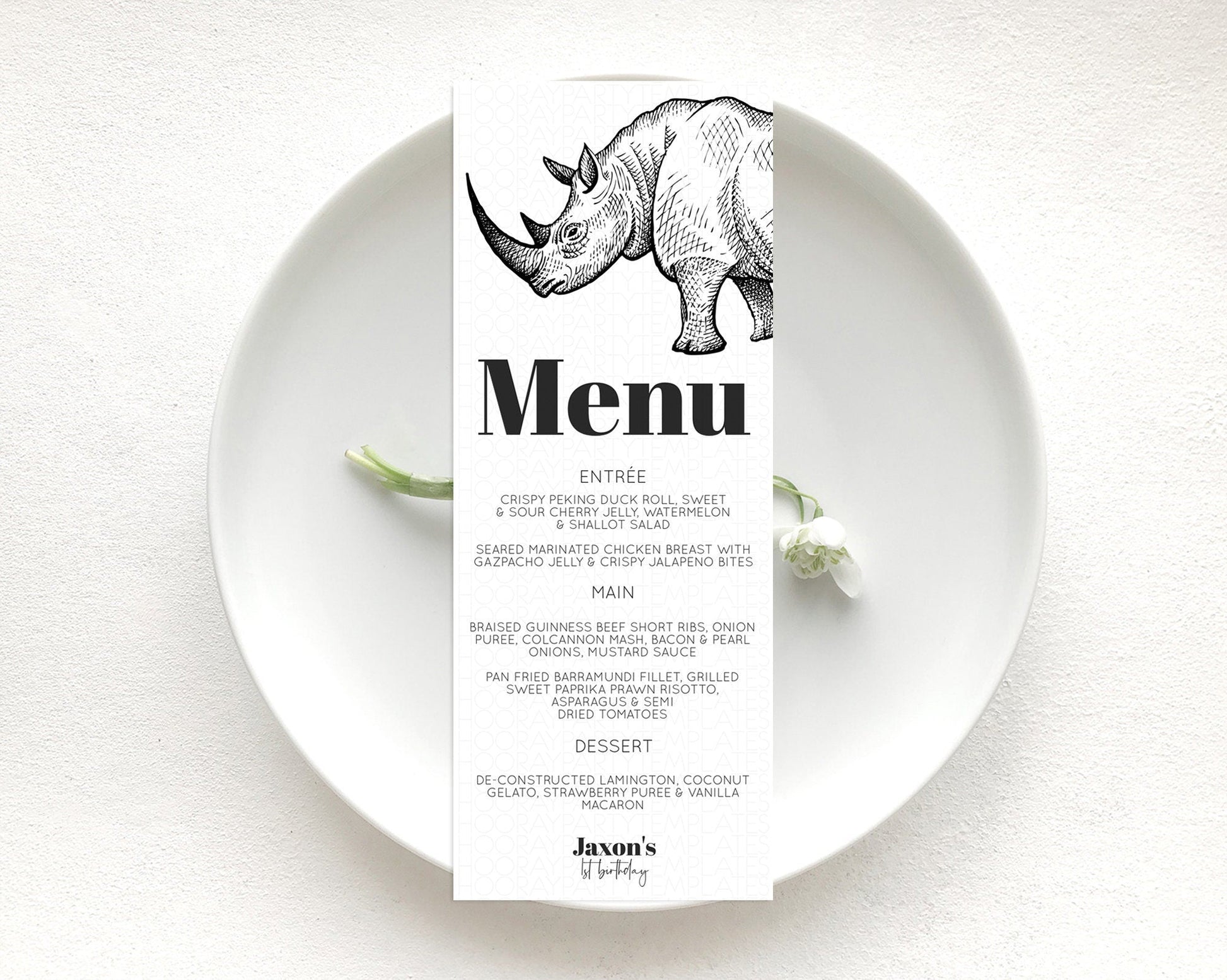 Rhino Menu Rhino Menu Template Rhino Party Table Decor Safari Adventure Decor Rhino Dinner Dessert Menu Rhino Party Food Menu D10253