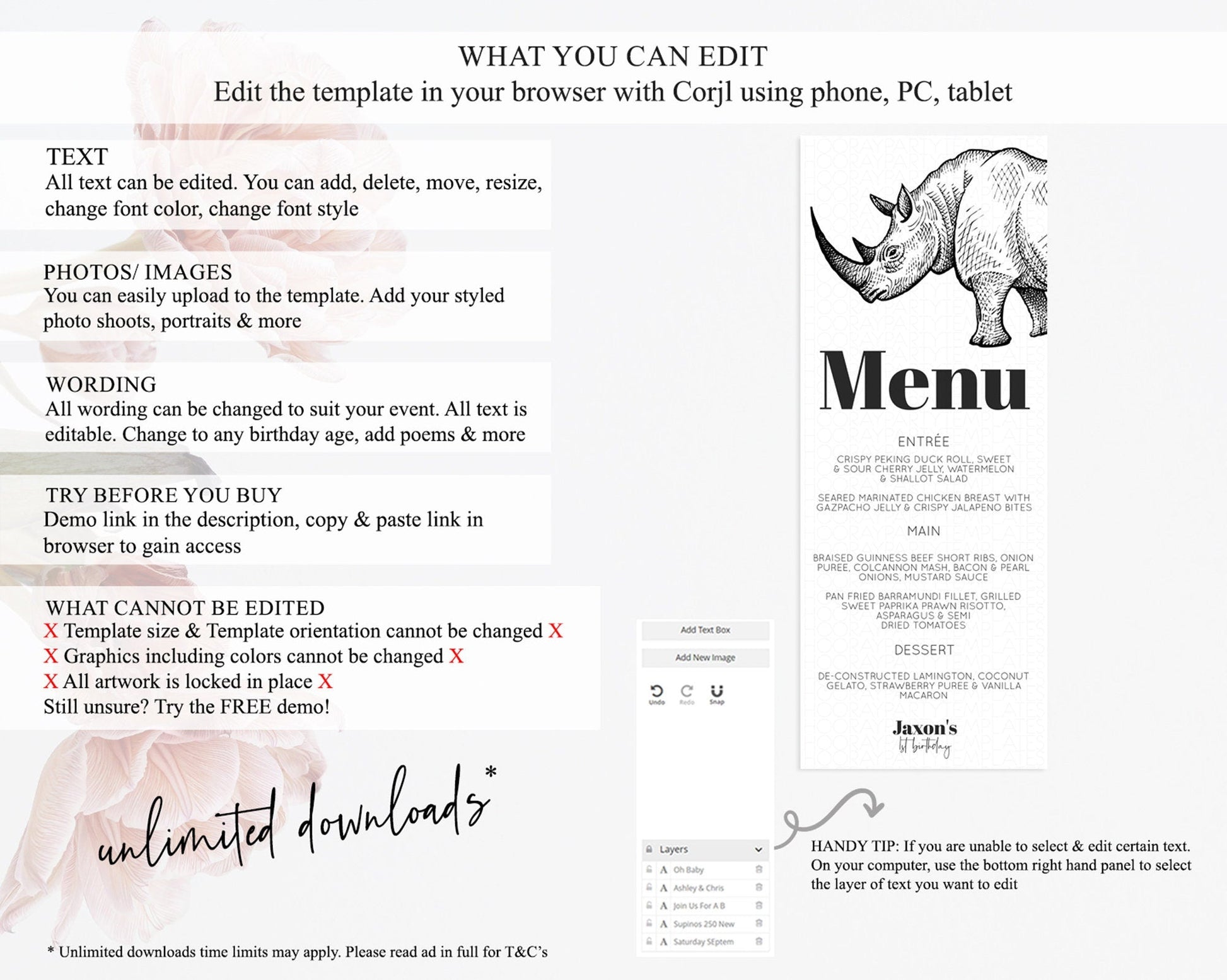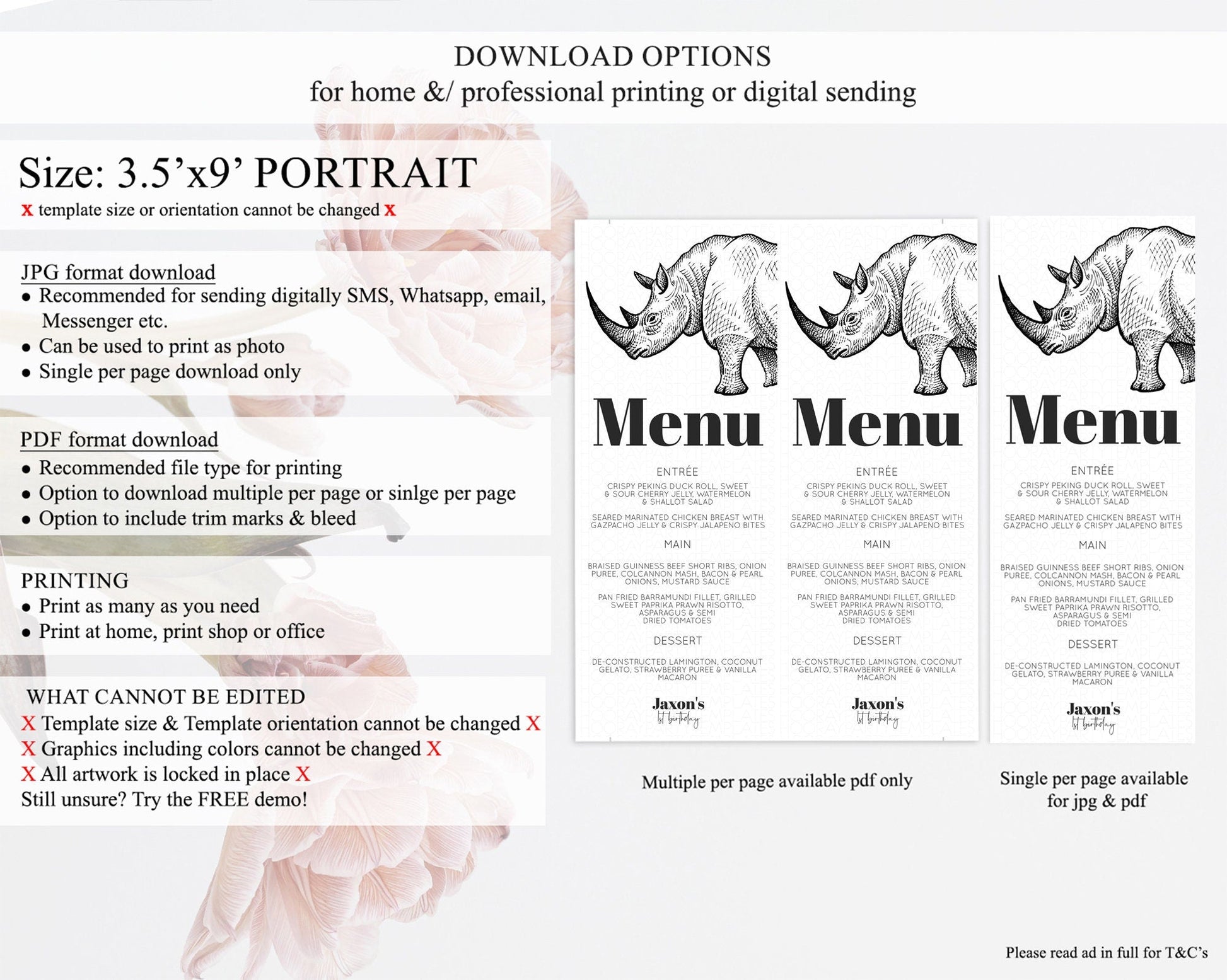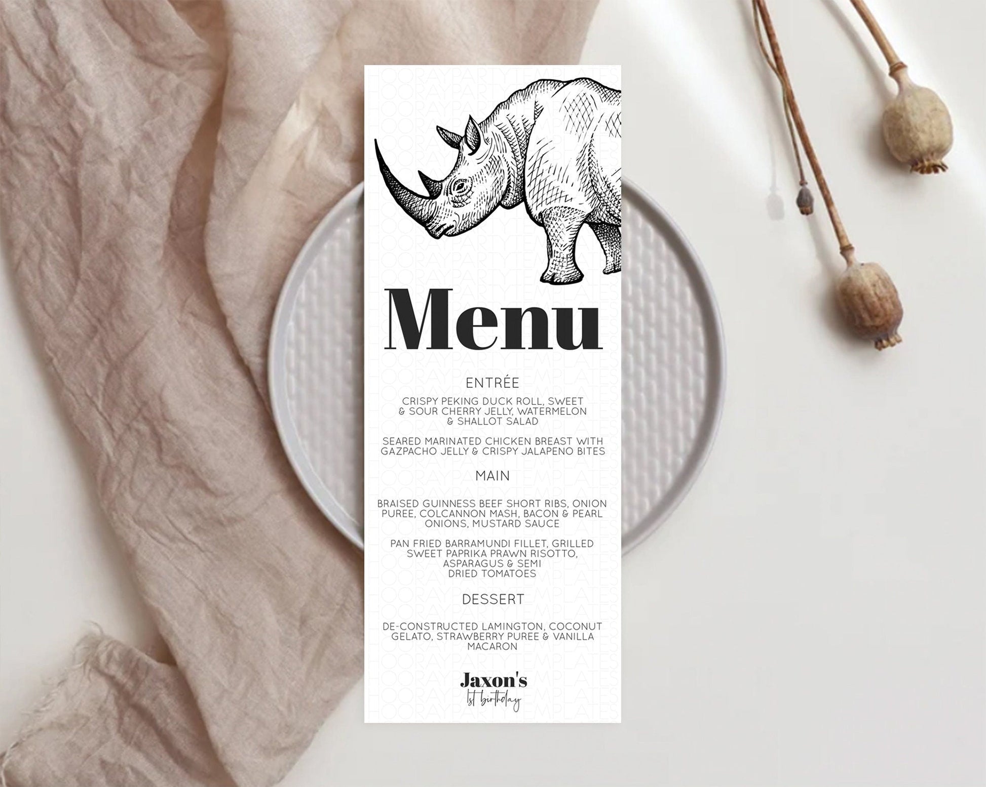 Rhino Menu Rhino Menu Template Rhino Party Table Decor Safari Adventure Decor Rhino Dinner Dessert Menu Rhino Party Food Menu D10253