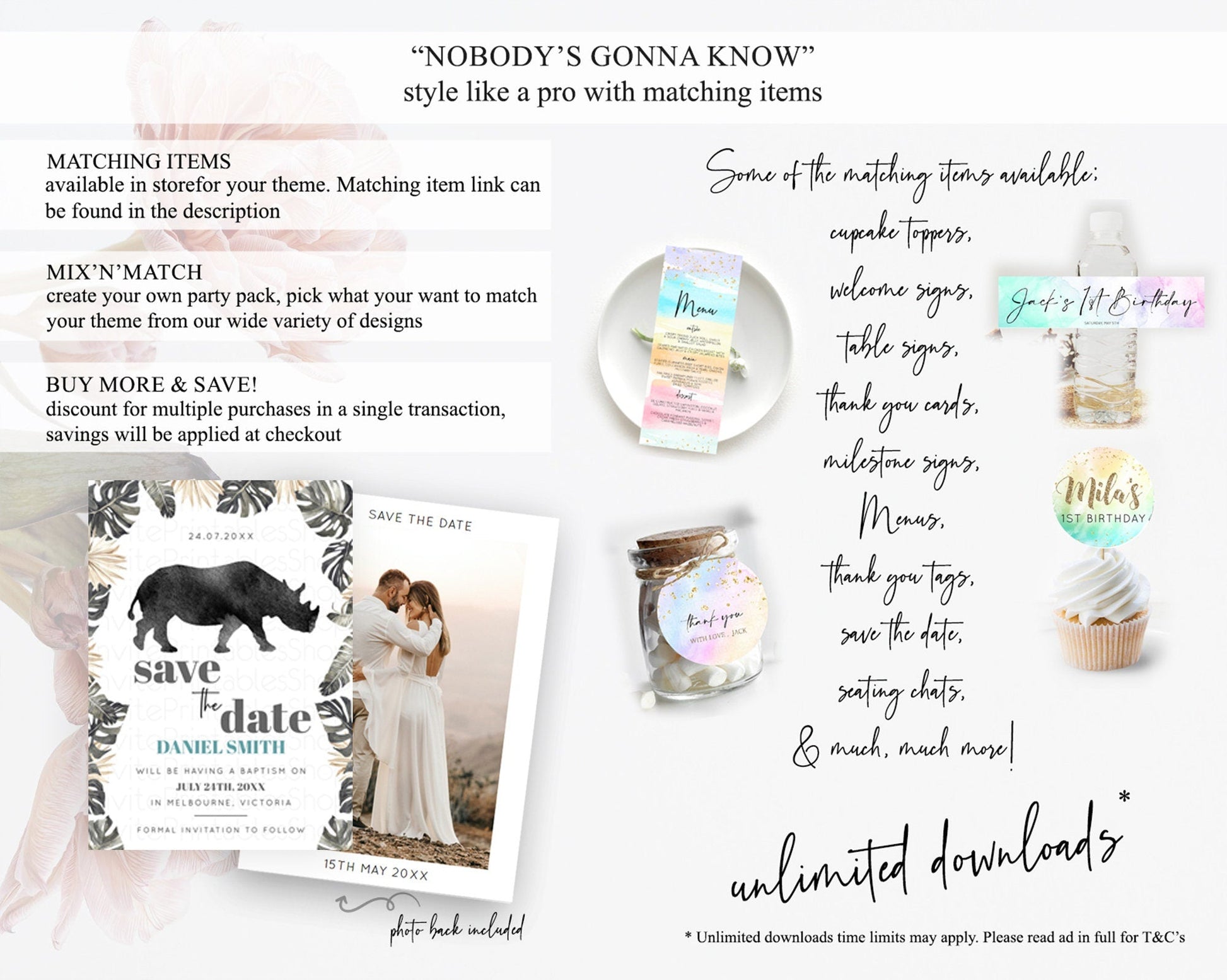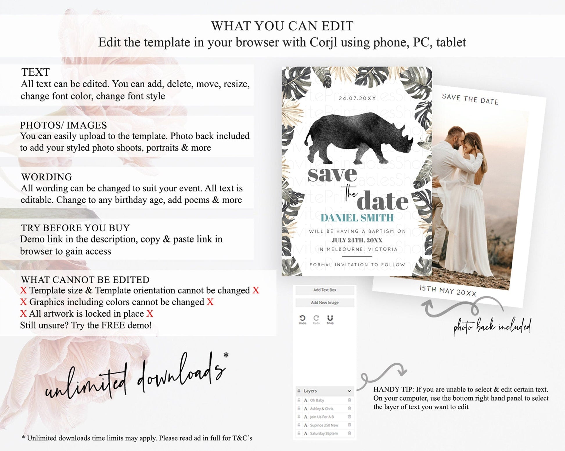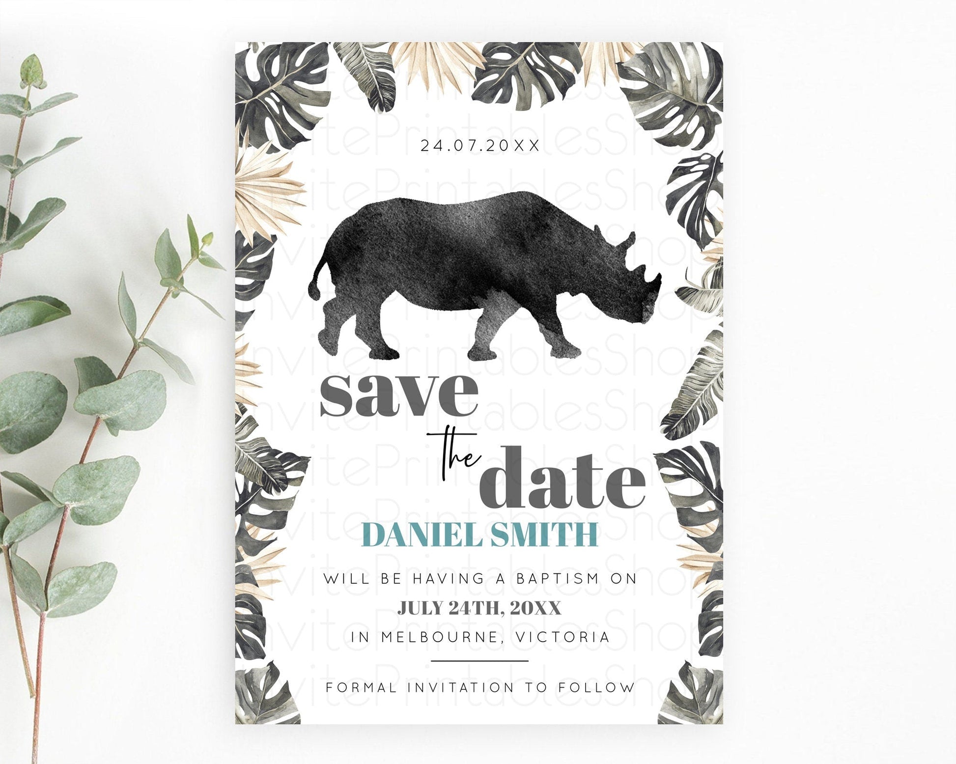 Rhino Save The Date Template Rhino Party Save The Date Safari Adventure Rhino Minimal Theme For 1st Birthday Baptism Baby Shower D10805