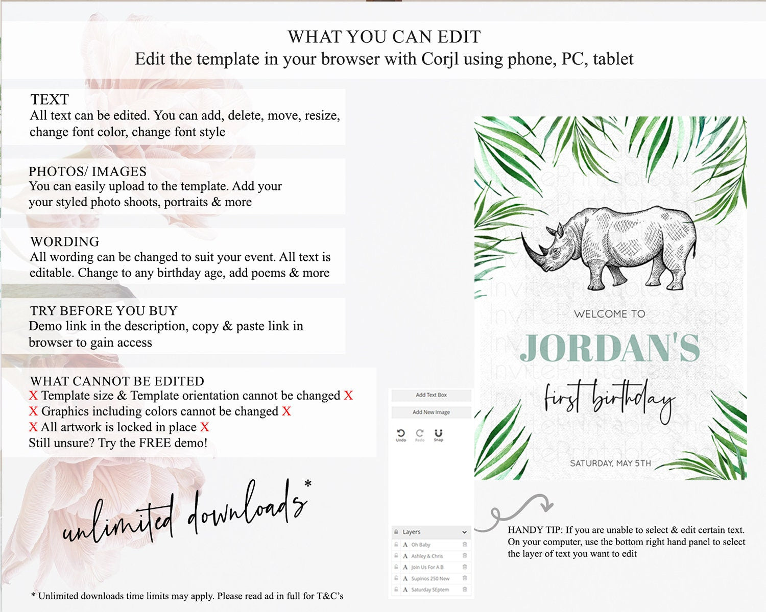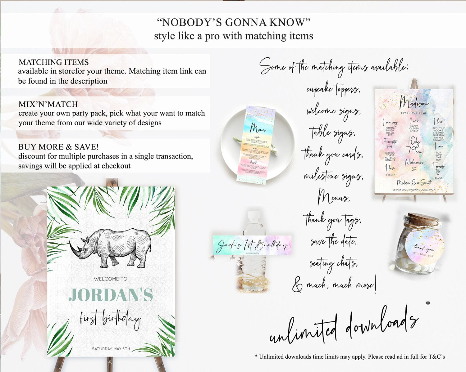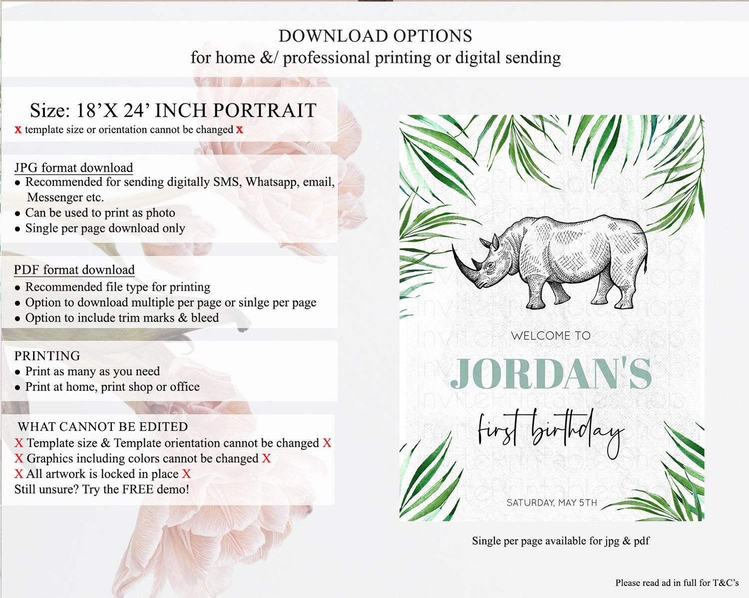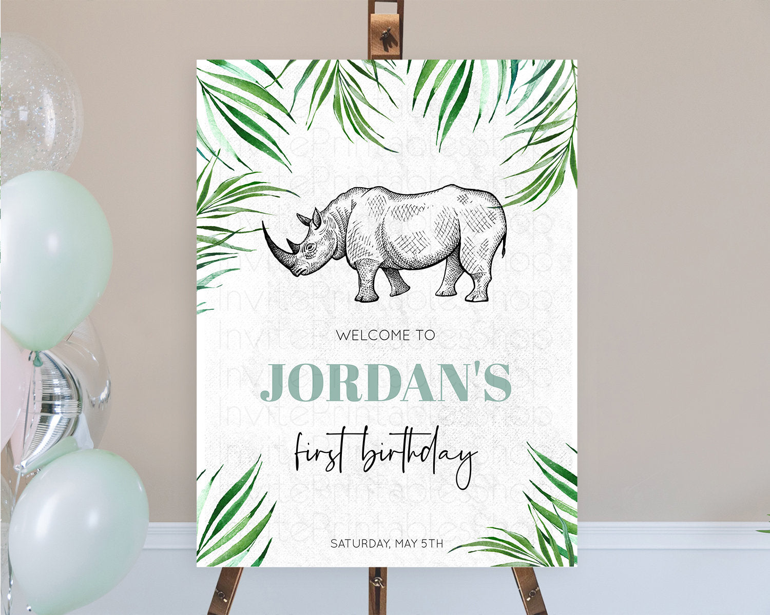 Rhino Welcome Sign Rhino Welcome Board Rhino Welcome Poster Dried Palm Fern Safari Party Decor Rhino First Birthday Welcome Sign D10848