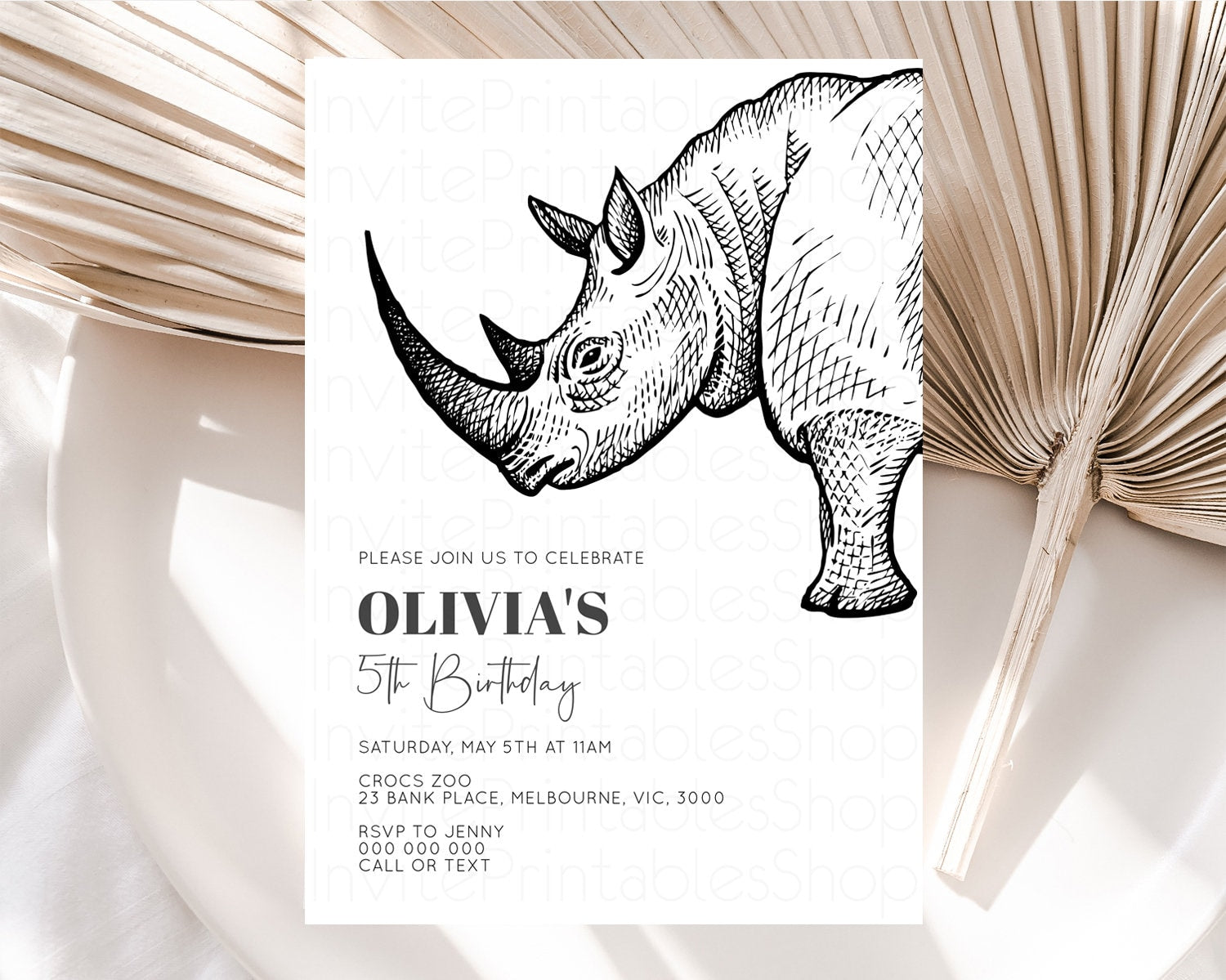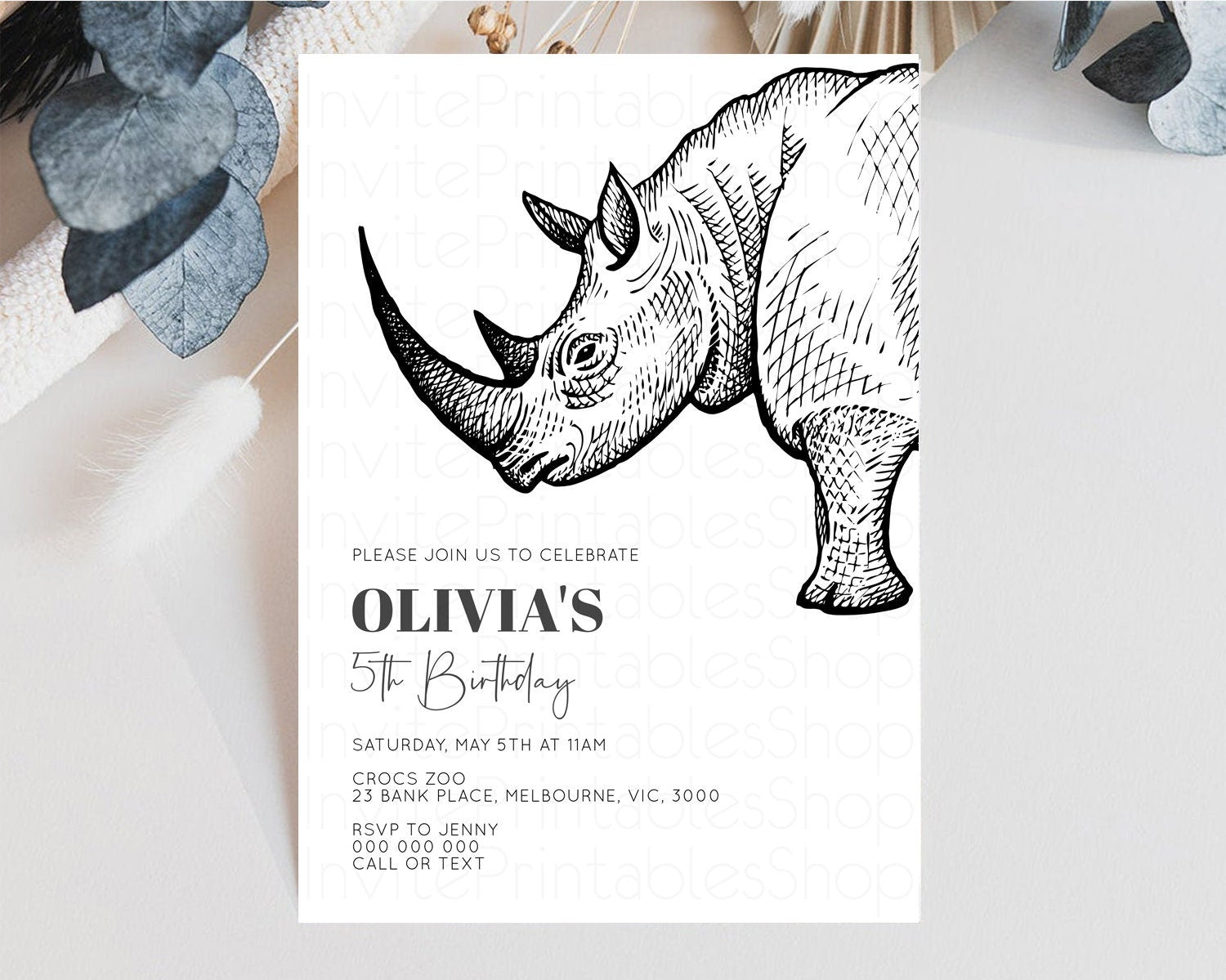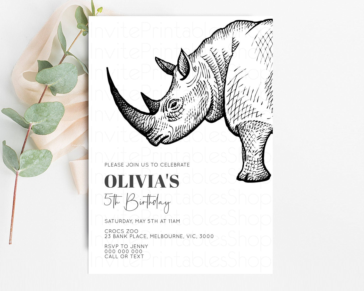 Rhinoceros Birthday Invitation Rhinoceros Invite Jungle Safari invite Watercolor Tropical Palm Adventure Zoo Party Wild Rhino Party t269