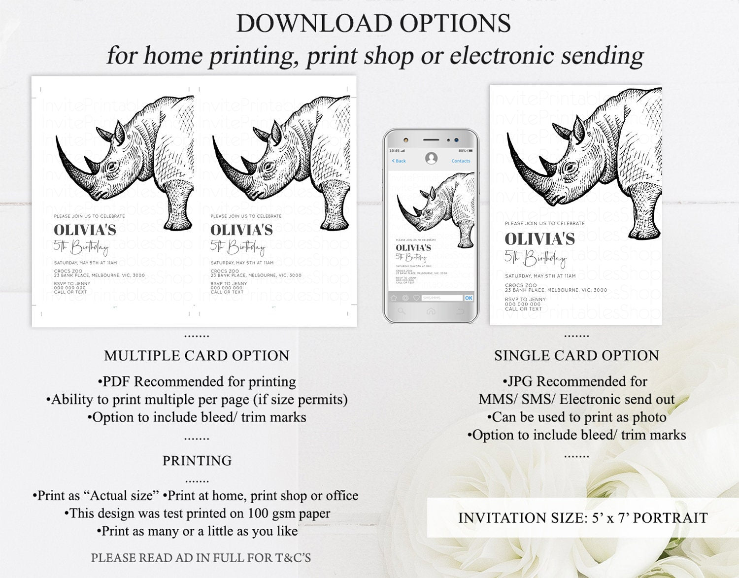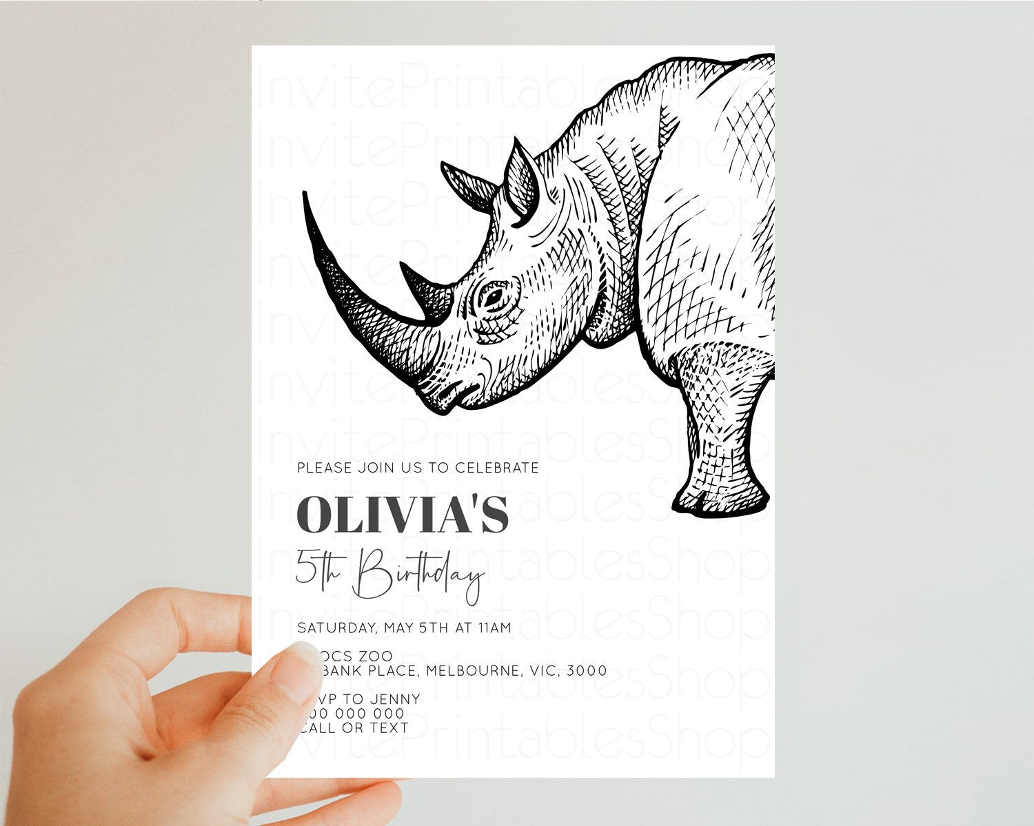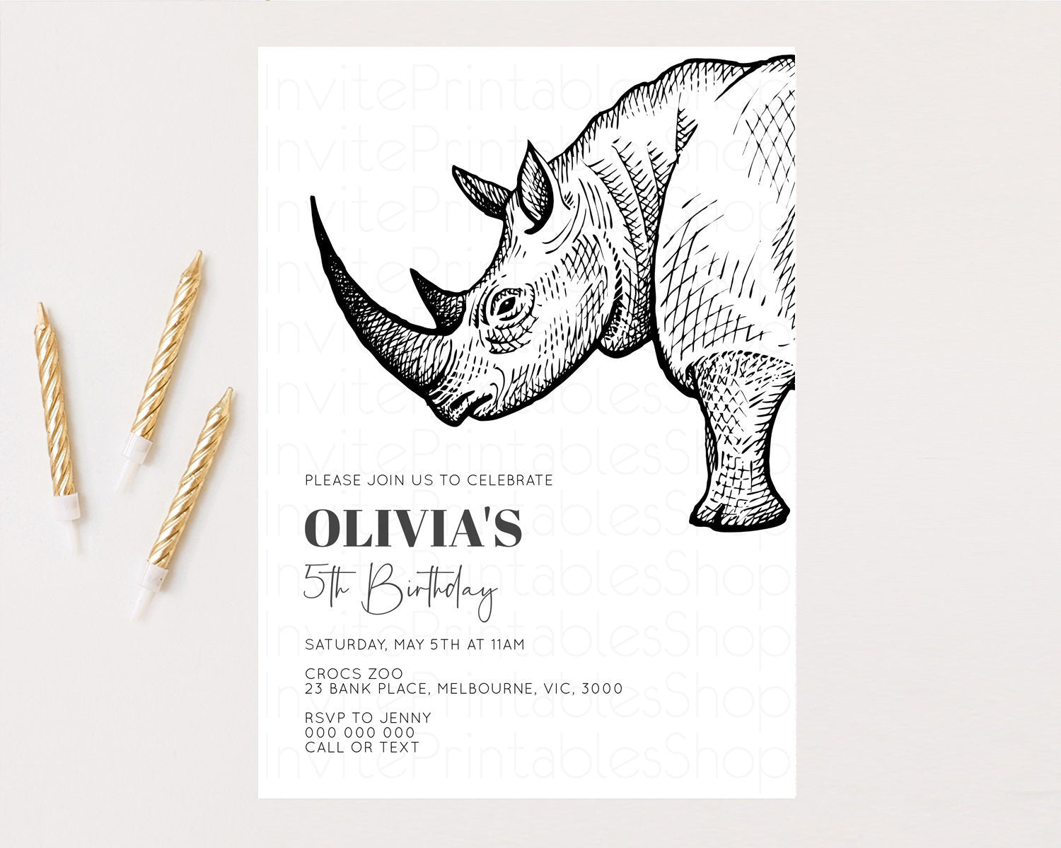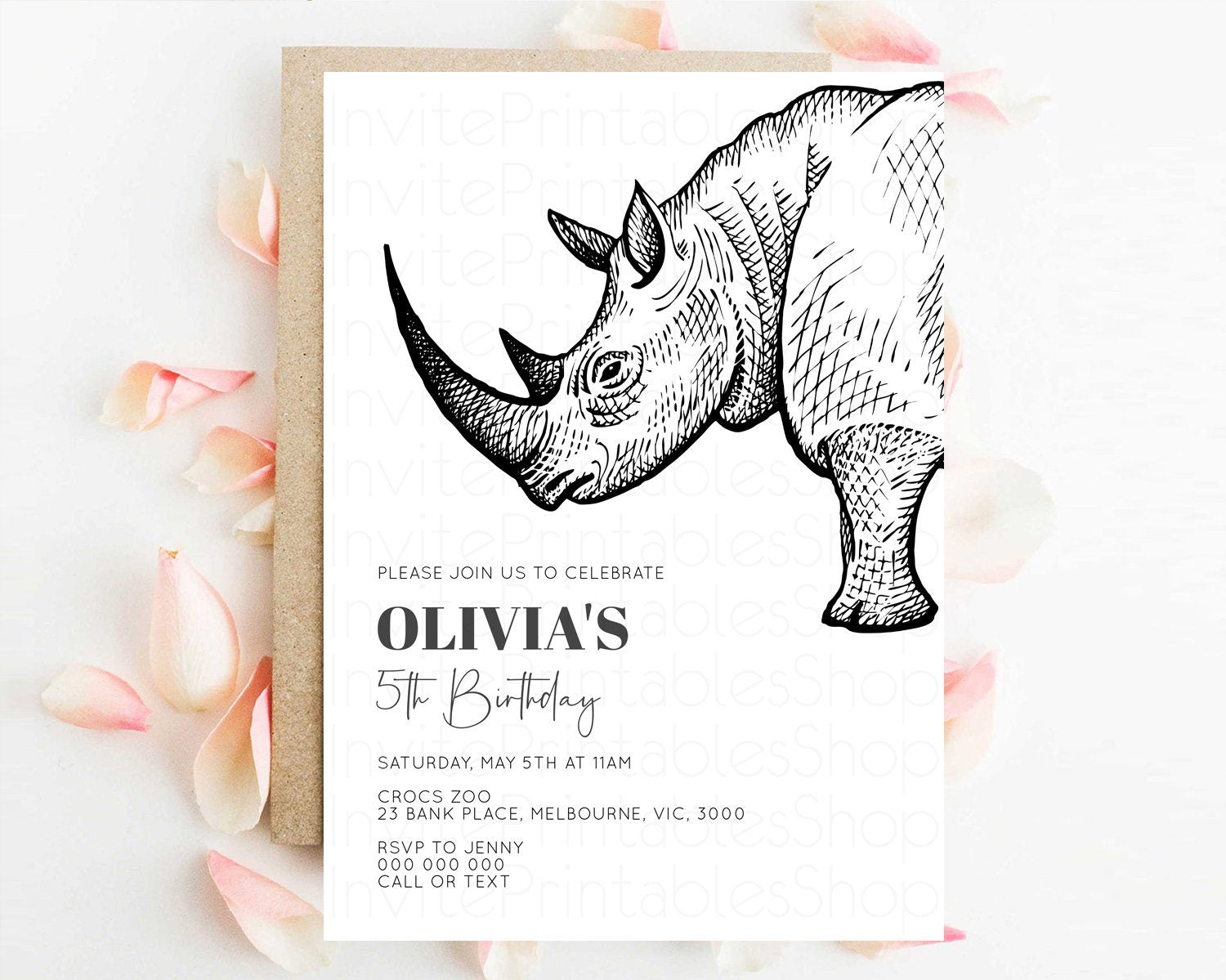 Rhinoceros Birthday Invitation Rhinoceros Invite Jungle Safari invite Watercolor Tropical Palm Adventure Zoo Party Wild Rhino Party t269