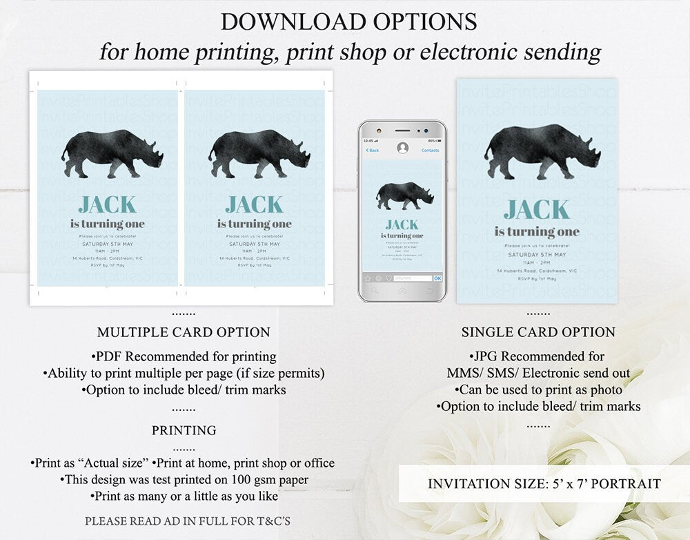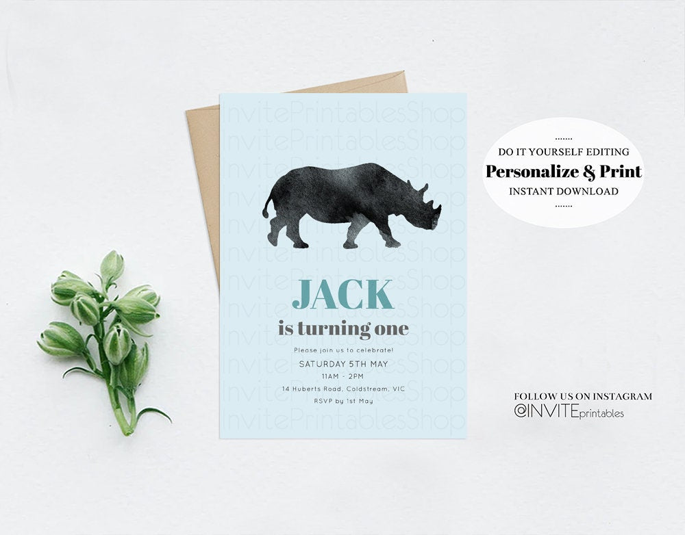 Rhinoceros Birthday Invitation Watercolor Rhino Tropical Palm Jungle Safari Adventure Zoo Party Wild Party Animal Custom Editable Invite