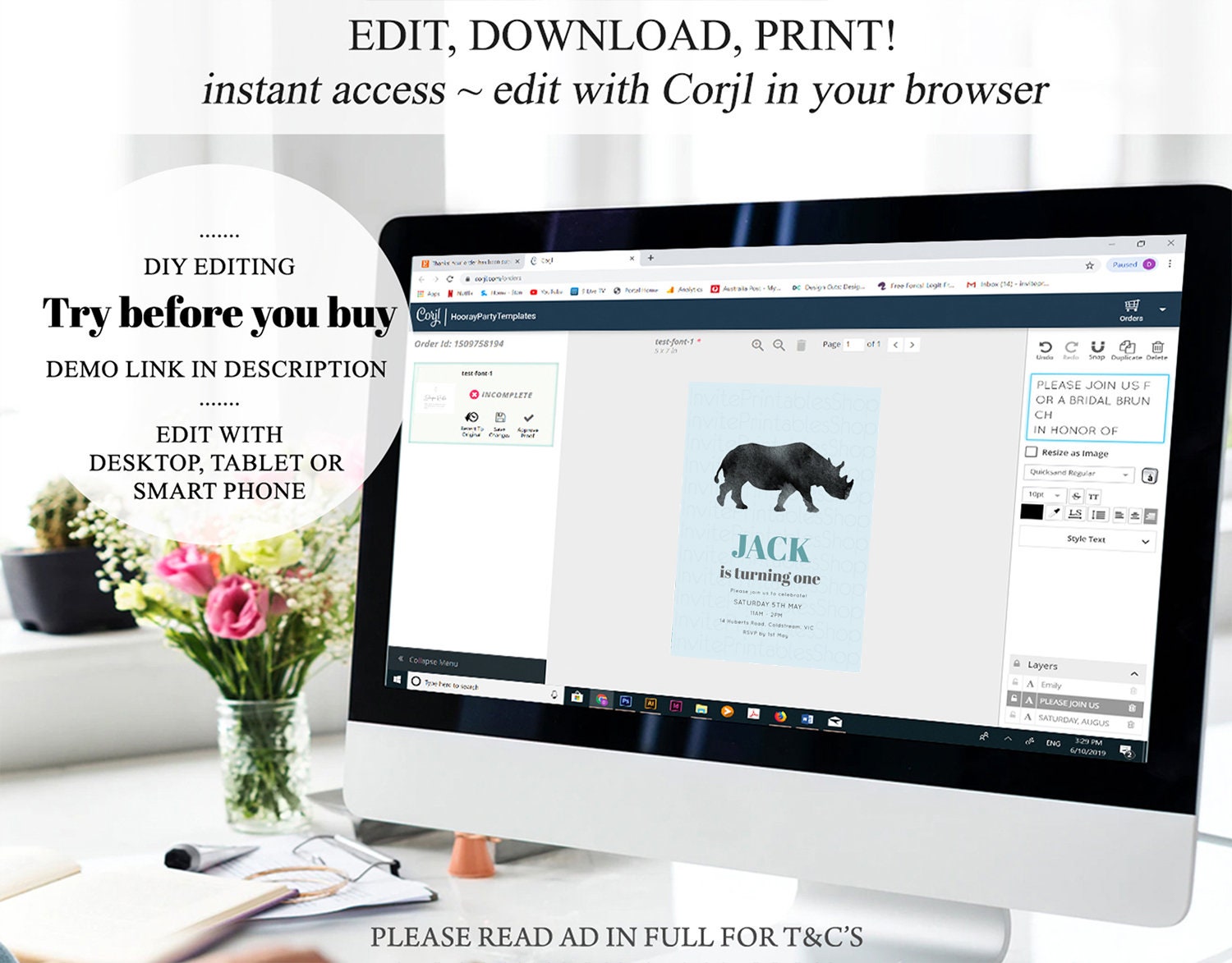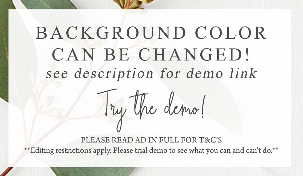 •Try before you buy! • DEMO LINK- https://www.corjl.com/d/30HMC4 PLEASE READ AD IN FULL!! •Digital file. No physical item will be shipped •Do it yourself Editing. Edit online with Corjl or Edit with your mobile ITEM DETAILS Invitation size: 5’x7’ File type: PDF, JPEG Resolution: 300DPI PDF FILE OPTIONS: •Recommended for printing •Ability to print multiple per page (if size permits) •Option to include bleed/ trim marks JPG FILE OPTIONS: •Recommended for MMS/ SMS/ Electronic send out •Can be used to print as photo •Option to include bleed/ trim marks EDITING • Do it yourself editing • Mobile editing is available • Google chrome is the recommend browser for Corjl. Please download here for FREE: https://www.google.com/chrome/ • Using other browsers may not show all of Corjl's editing features • Editing on a desktop/ laptop computer is recommended to access all of Corjl features • Mobile editing is available, please use a desktop/ laptop computer to access all of Corjl features DOWNLOADS & EXPIRY •Maximum 3 downloads on the same edit •Link expires 30 days after purchase DOWNLOAD NOTICE •Once you have reached your download limits &/ “approve proof” in Corjl. You will not be able to request further downloads on your design. Further download requests are not permitted WHAT IS EDITABLE •Text - colours, fonts, size, move, delete & rotation. •Please see demo link for what you can and can’t do WHAT YOU CAN’T EDIT •Template size •Template orientation •Graphics CAN NOT BE deleted, moved, or changed in colour •Please see demo link for what you can and can’t do HOW TO 1. Choose design template & checkout on Etsy. 2. Email will be sent from Corjl. Follow link to access template 3. Edit, save & print INSTRUCTIONS •Instructions on how to edit your design have been written by Corjl and will be available with your purchase. PRINTING •Colours can vary depending on the monitor, printer & cardstock •Can be printed at home •Home printing will require you to select the high quality print settings, select appropriate paper thickness & click "Actual size" prior to you printing •This design was test printed on 100 gsm paper •Can be printed at local print shop. Please check printing requirements & any printing restrictions prior to purchase PERSONAL USE ONLY. This item cannot be shared, re-sold, or used commercially for profit. REFUND POLICY •We are unable to provide a refund/ exchange on commenced & completed work, instant downloads or self-editing link templates. Please use the demo link to work out if this product is right for you. Copyright © 2018 by InvitePrintablesShop PTY LTD All rights reserved. This file or any portion thereof may not be reproduced or resold without the express written permission of the publisher (including edits to the design). Our files are provided as high-resolution PDFs – the end result is dependent upon the printer and paper used. If using a professional printing company, InvitePrintablesShop are not responsible for their specific printing requirements, paper or colour quality. Any changes required to the template are not included with your purchase – the files come as described in the listing only and cannot be changed. Thank you for visiting Invite Printables Shop:)