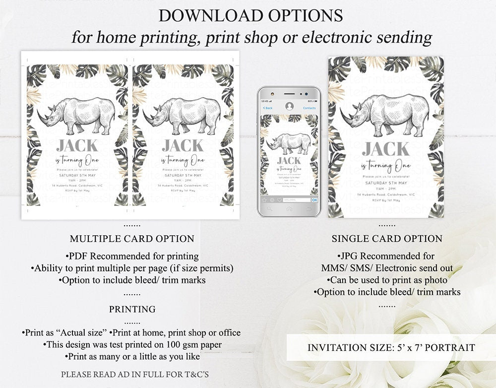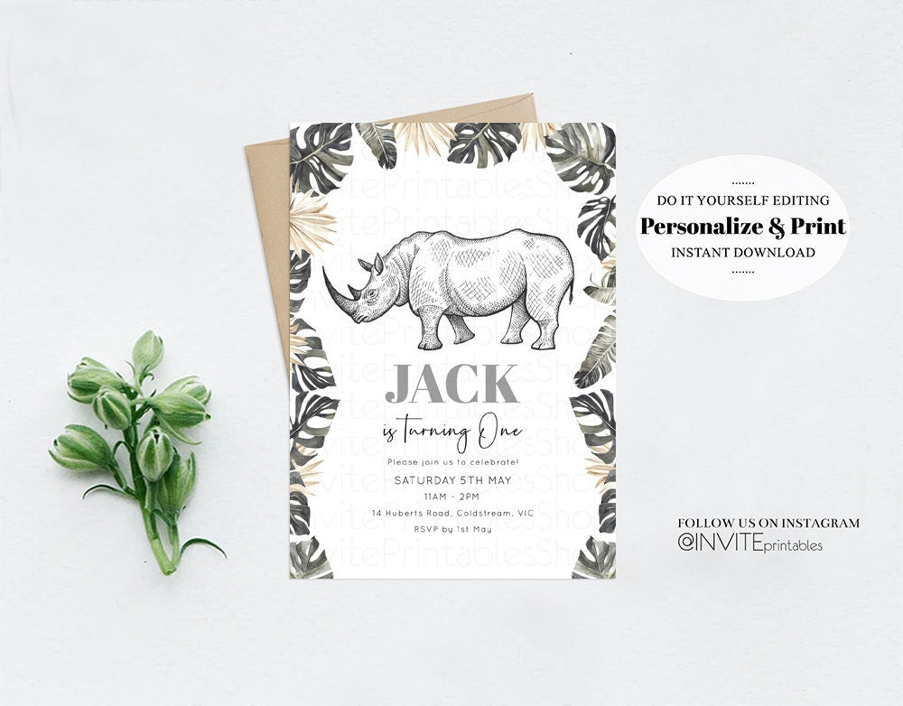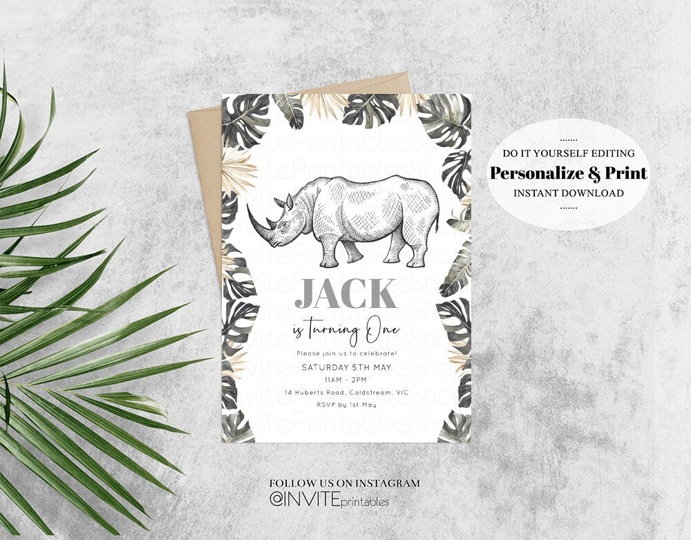 Rhinoceros Birthday Invitation Watercolor Rhino Tropical Palm Jungle Safari Adventure Zoo Party Wild Party Animal Editable Invite p269