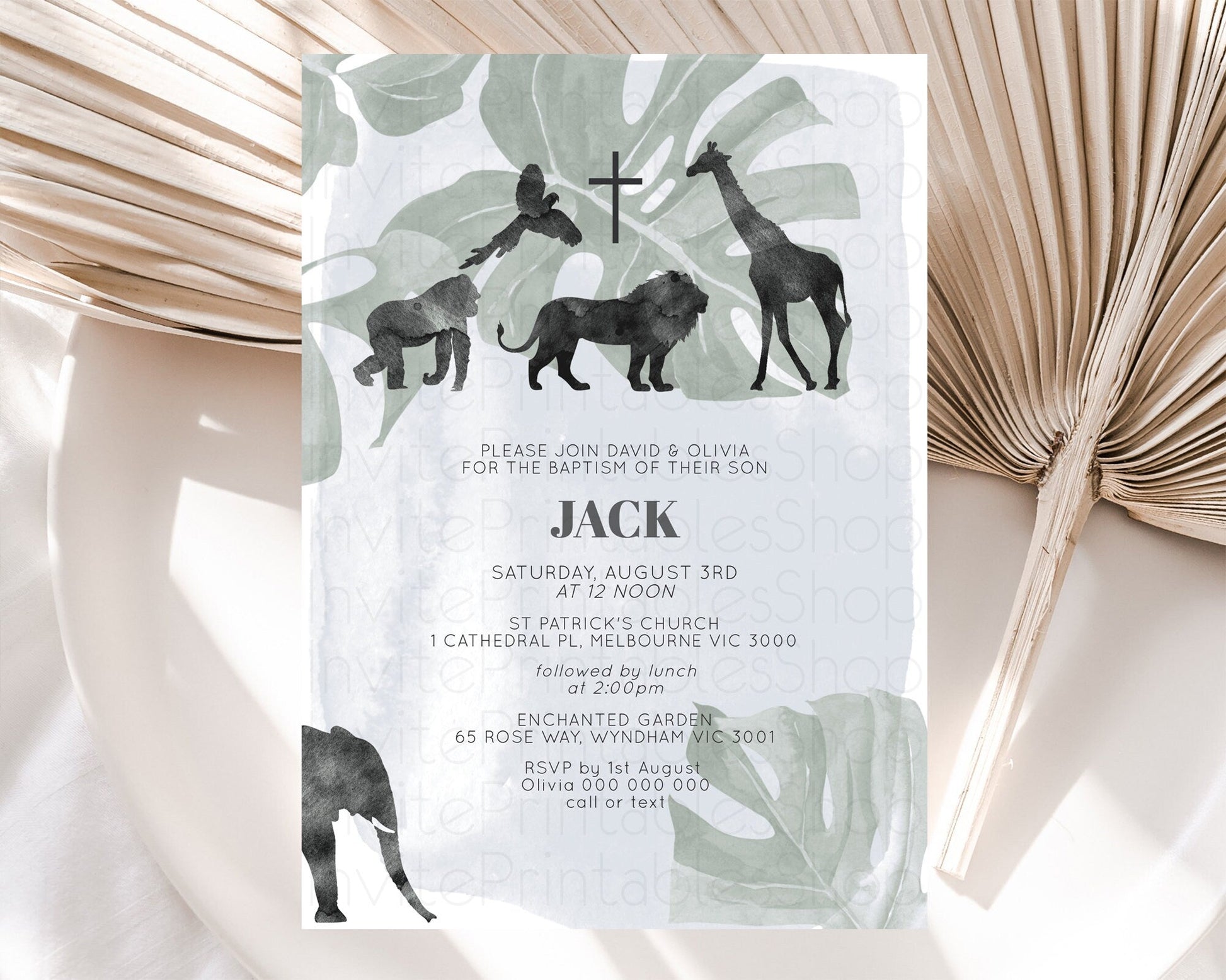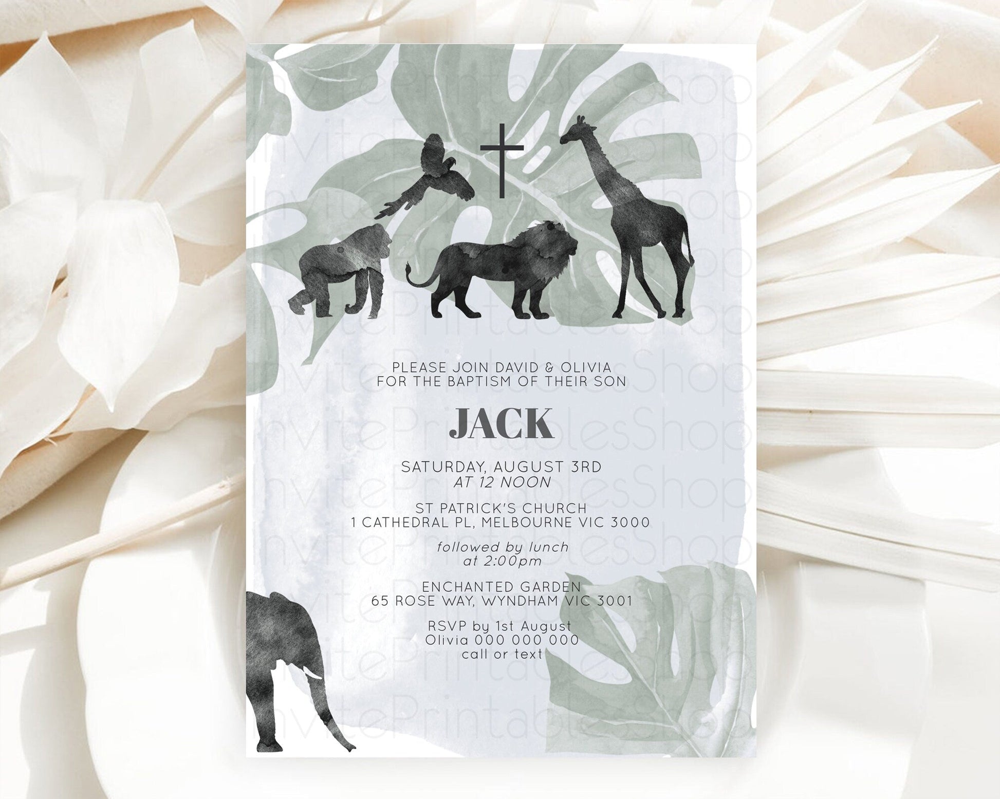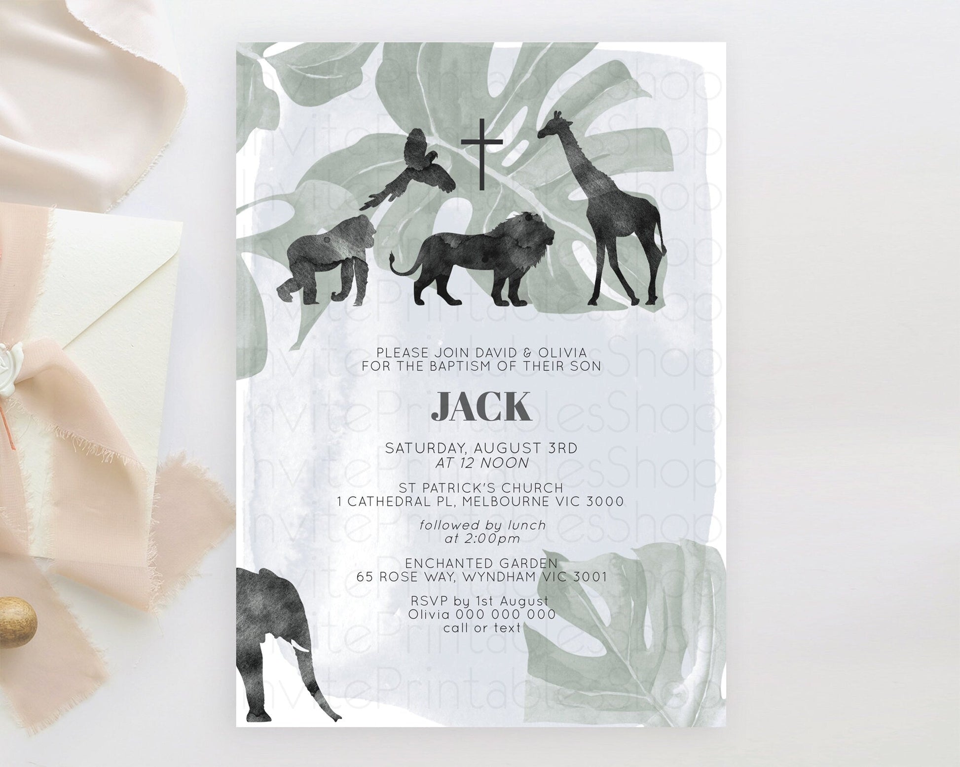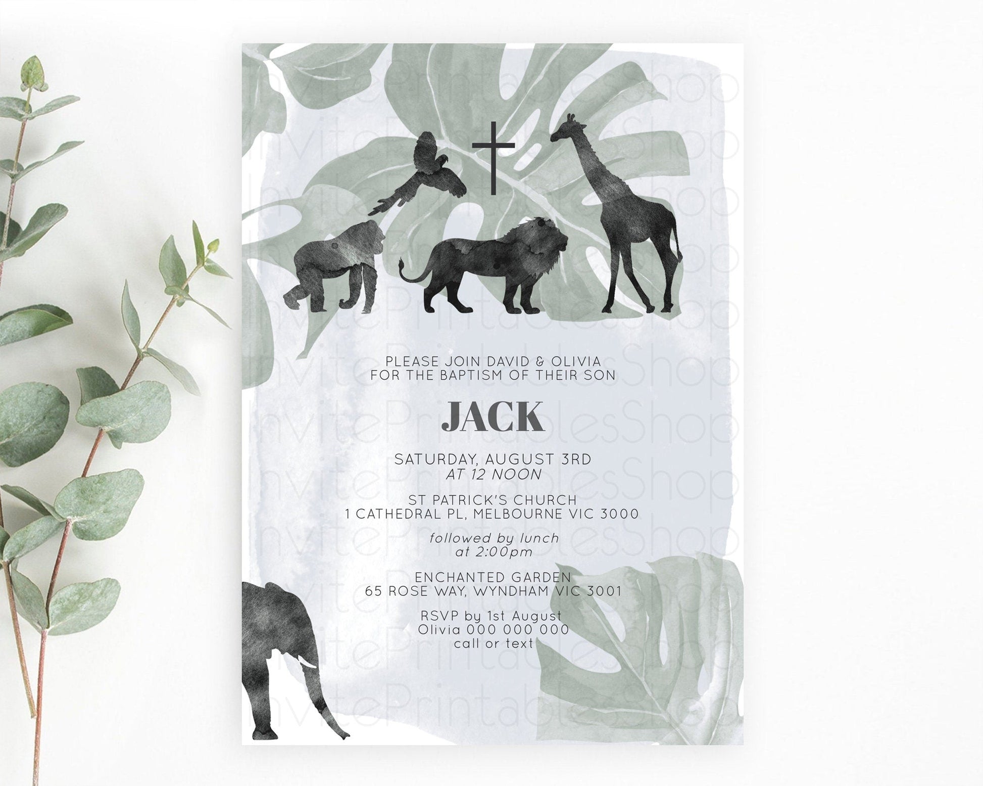 Safari Baptism Invitation Safari Adventure Baptism Birthday Invitation Lion Gorilla Elephant Rhino Tropical Palm Jungle Adventure D10203