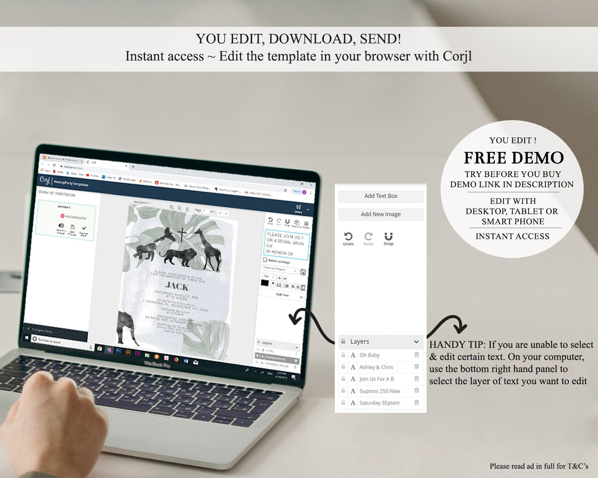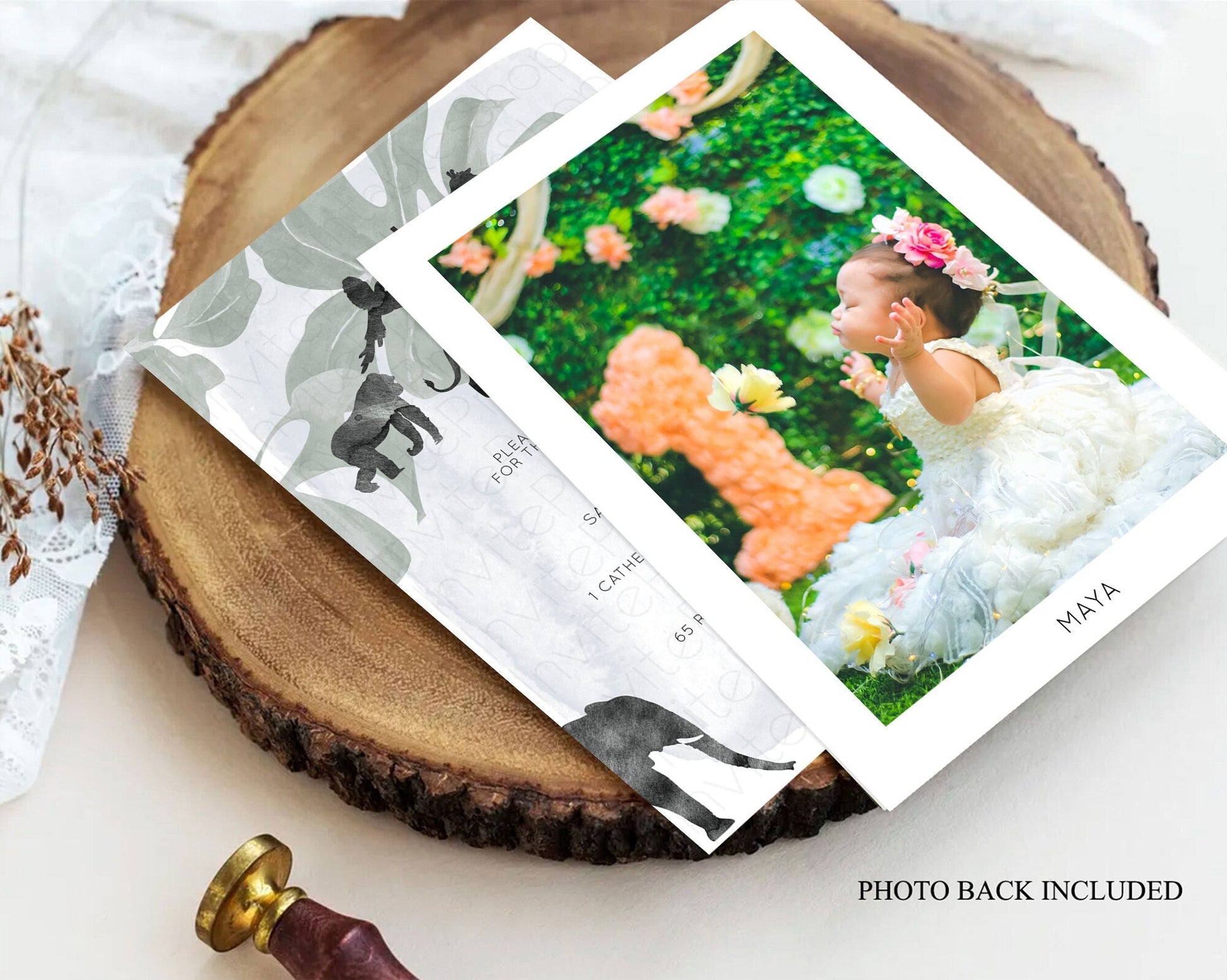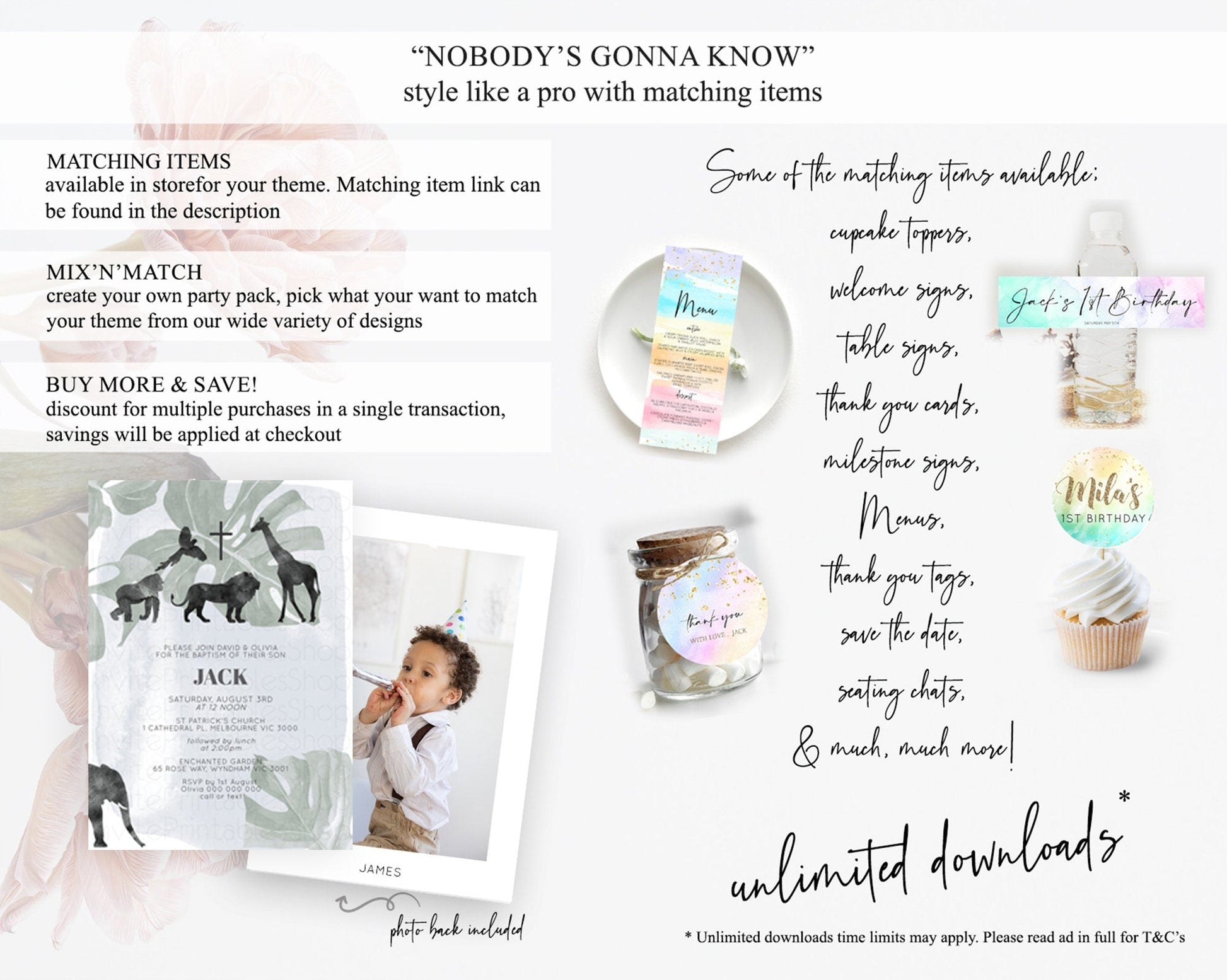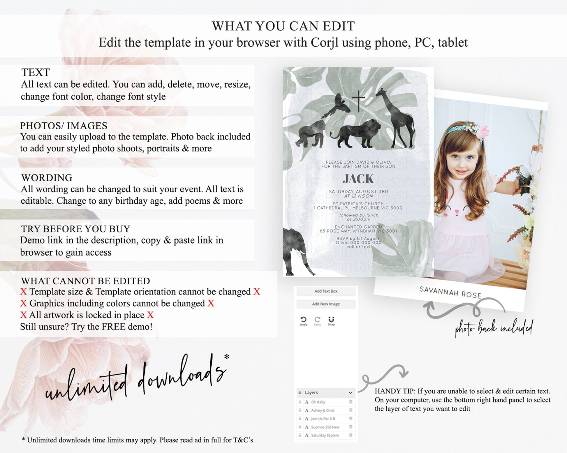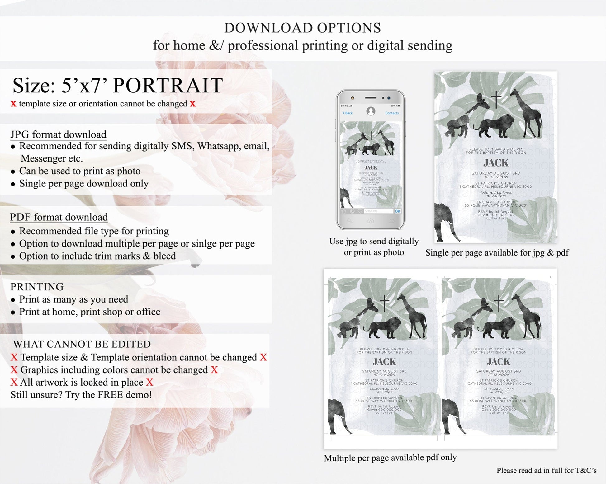 Safari Baptism Invitation Safari Adventure Baptism Birthday Invitation Lion Gorilla Elephant Rhino Tropical Palm Jungle Adventure D10203