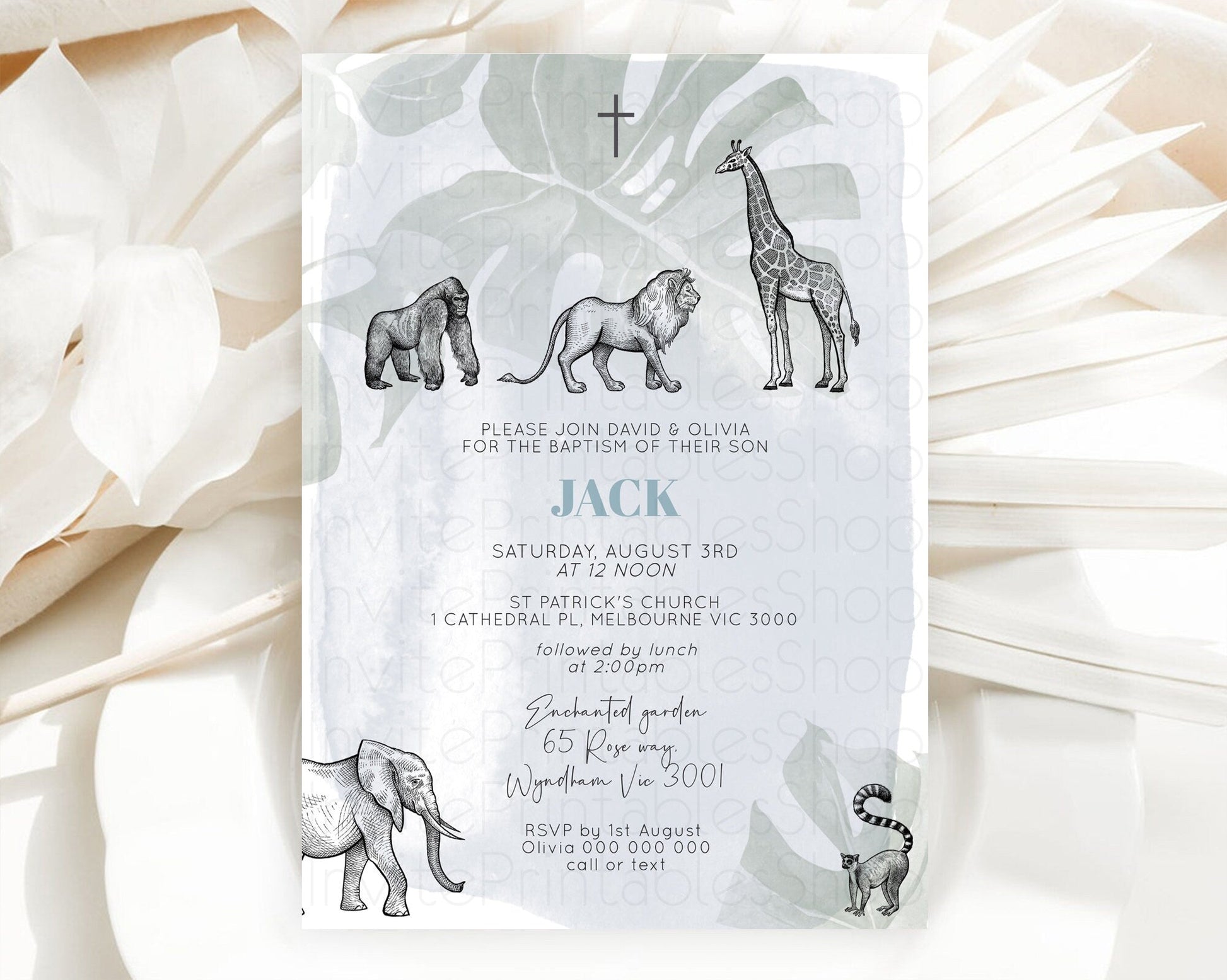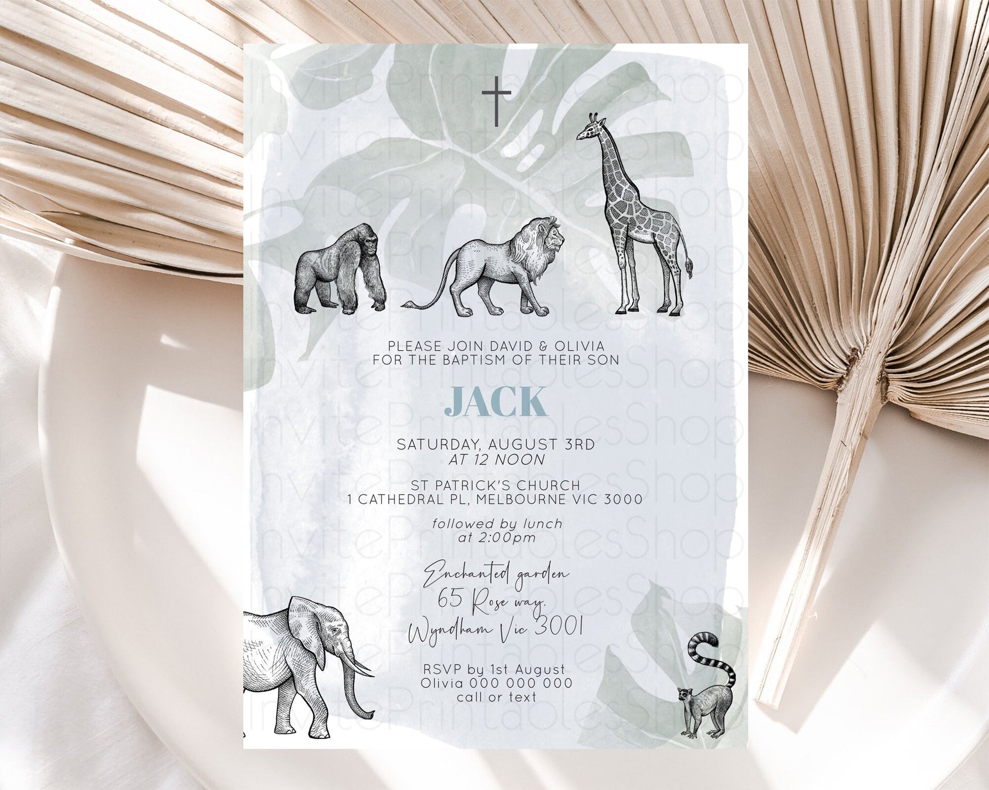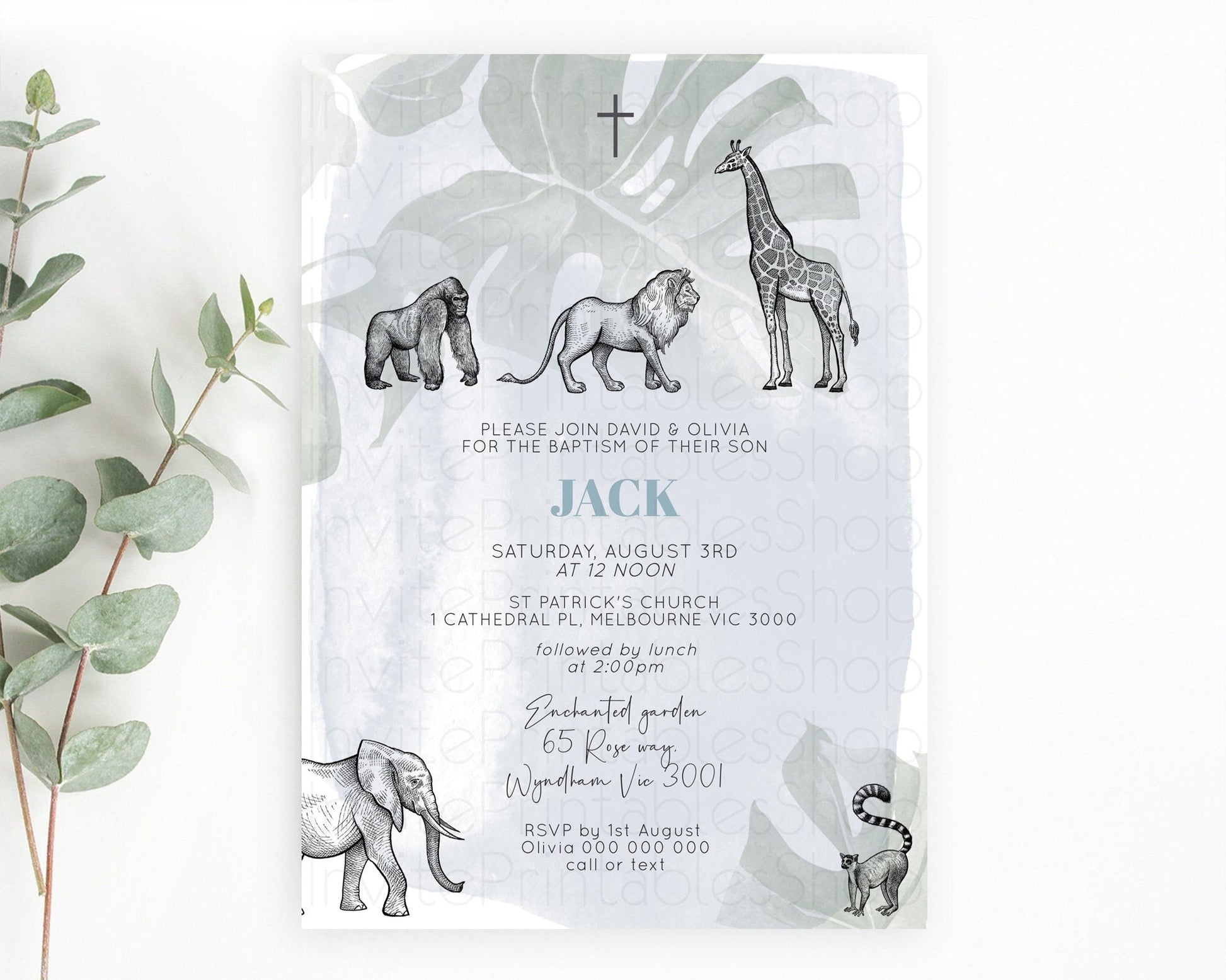 Safari Baptism Invitation Safari Adventure Baptism Birthday Invitation Lion Gorilla Elephant Rhino Tropical Palm Jungle Adventure D10821