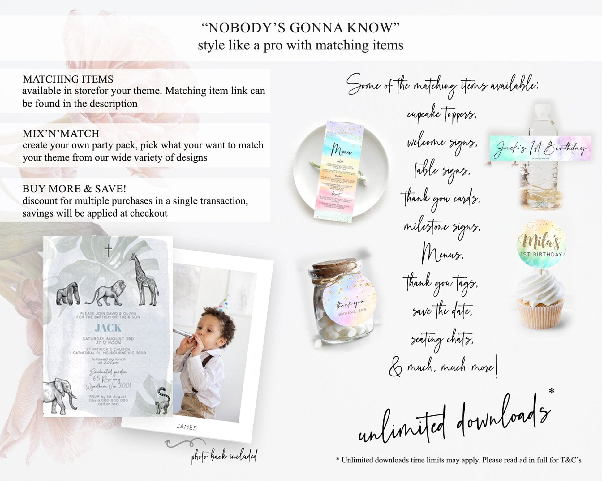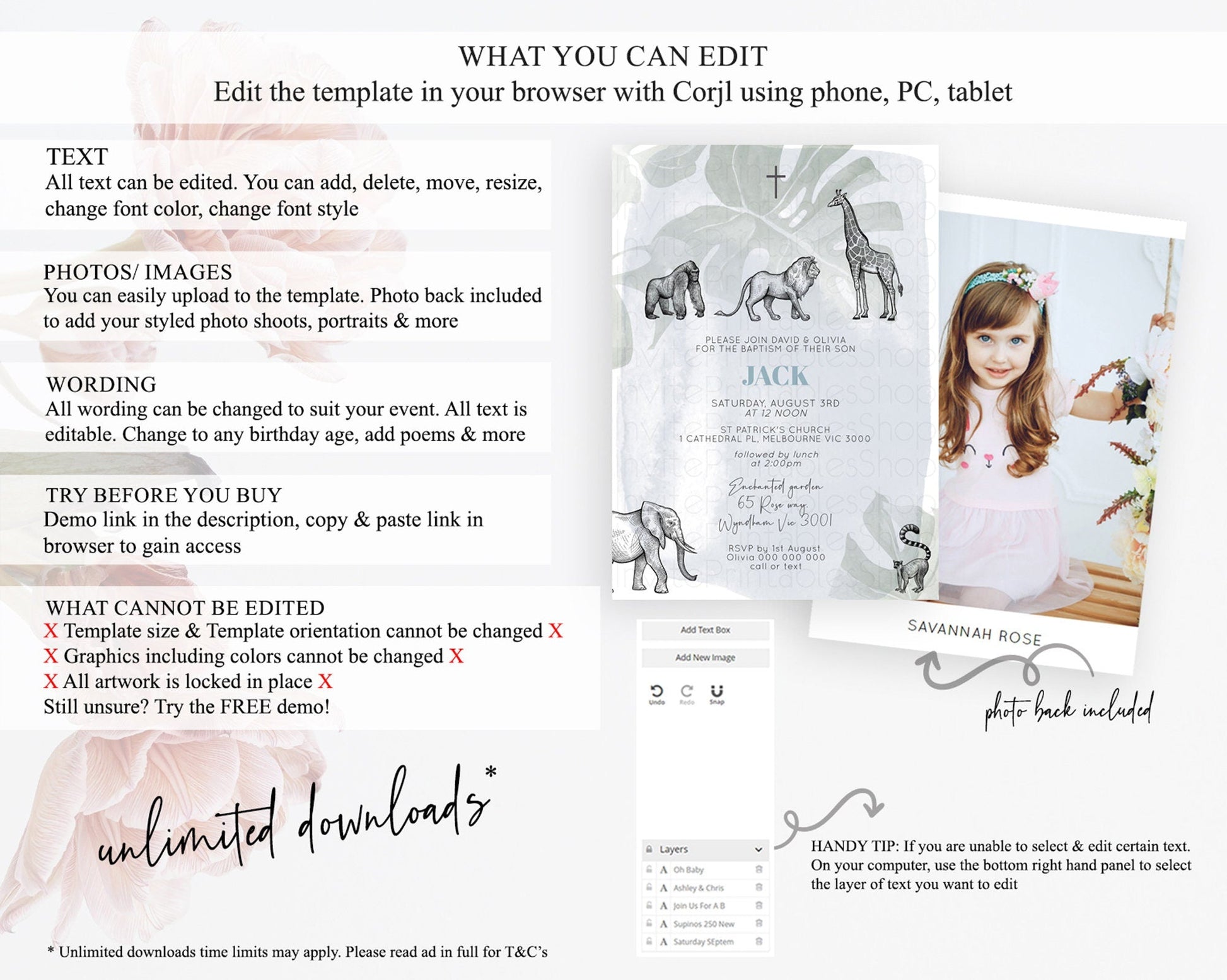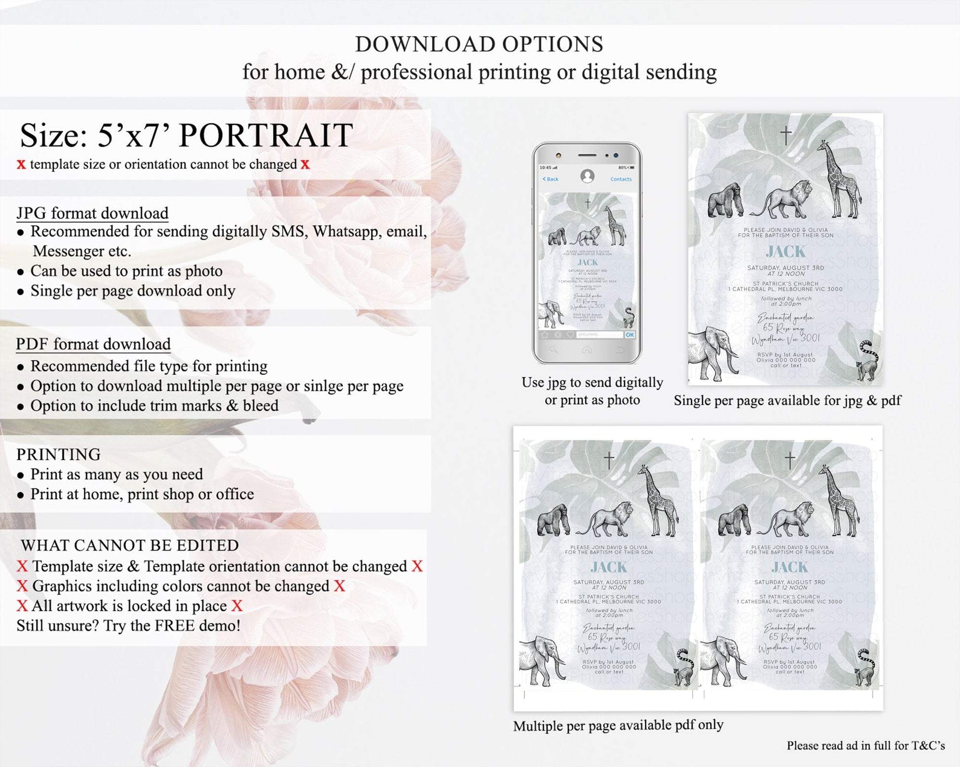 Safari Baptism Invitation Safari Adventure Baptism Birthday Invitation Lion Gorilla Elephant Rhino Tropical Palm Jungle Adventure D10821