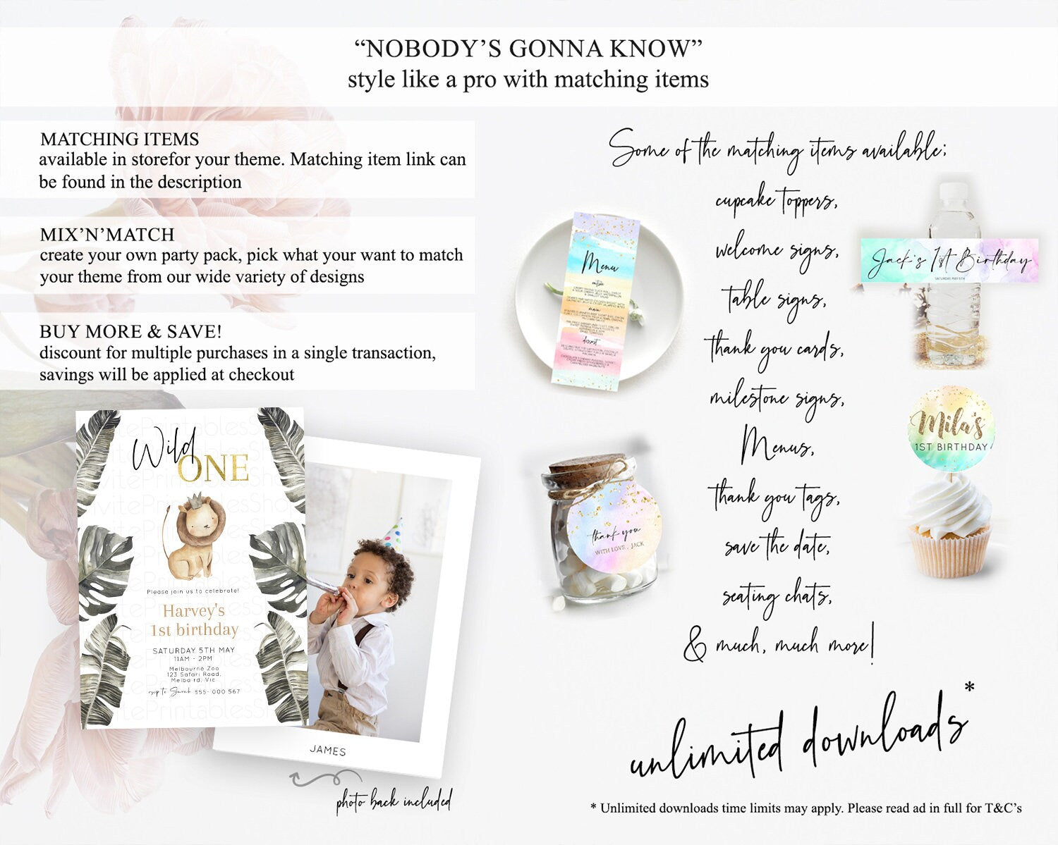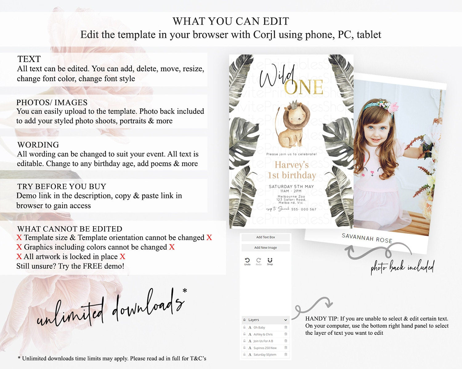 Safari Birthday Invitation Lion Gorilla Elephant Rhino Tropical Palm Jungle Safari Adventure Zoo Party Animal 2nd 1st First Birthday D10599