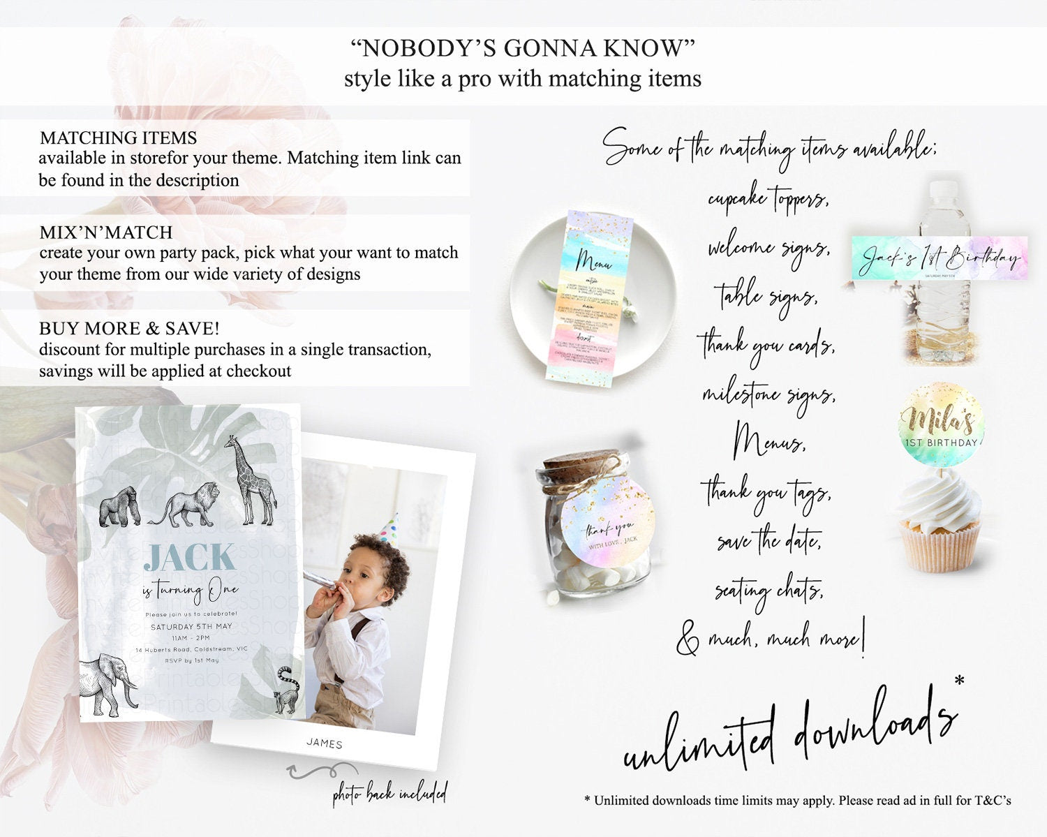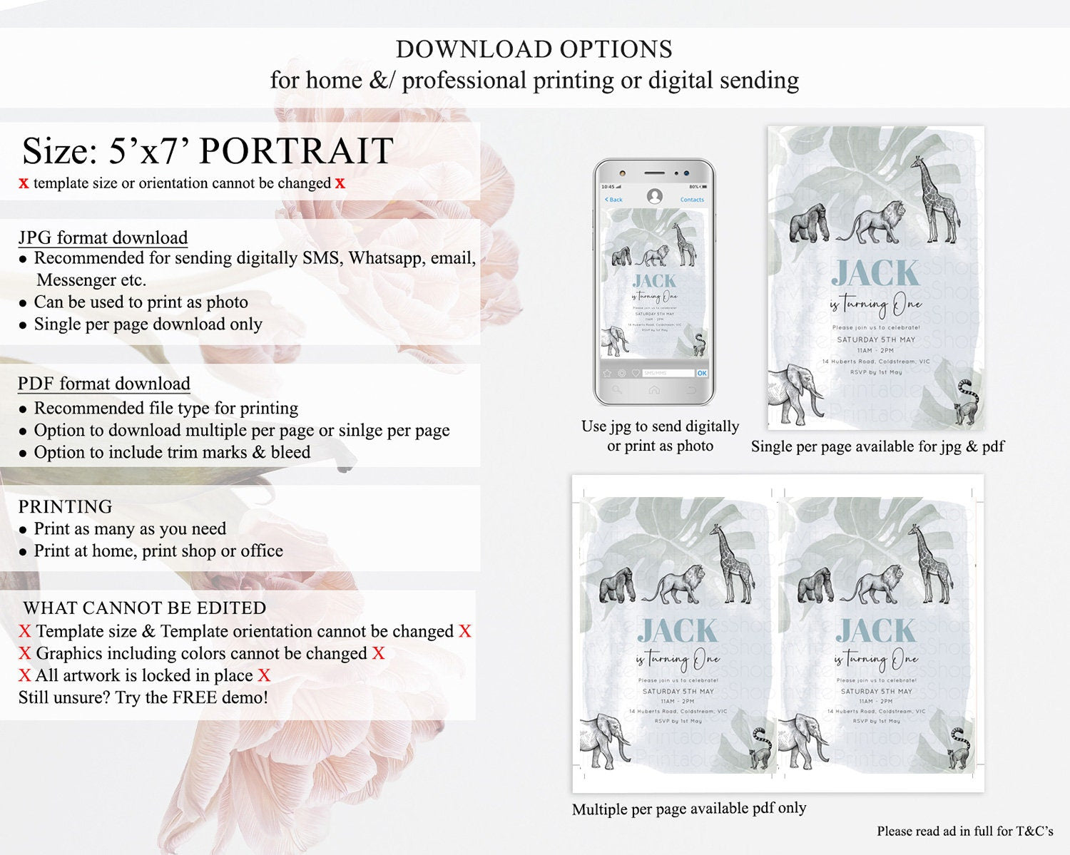 Safari Birthday Invitation Lion Gorilla Elephant Rhino Tropical Palm Jungle Safari Adventure Zoo Party Animal 2nd 1st First Birthday D10821
