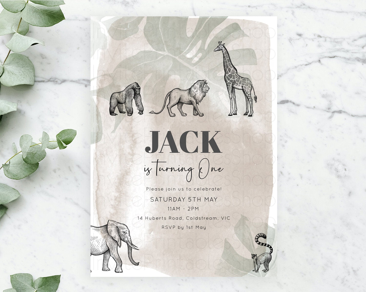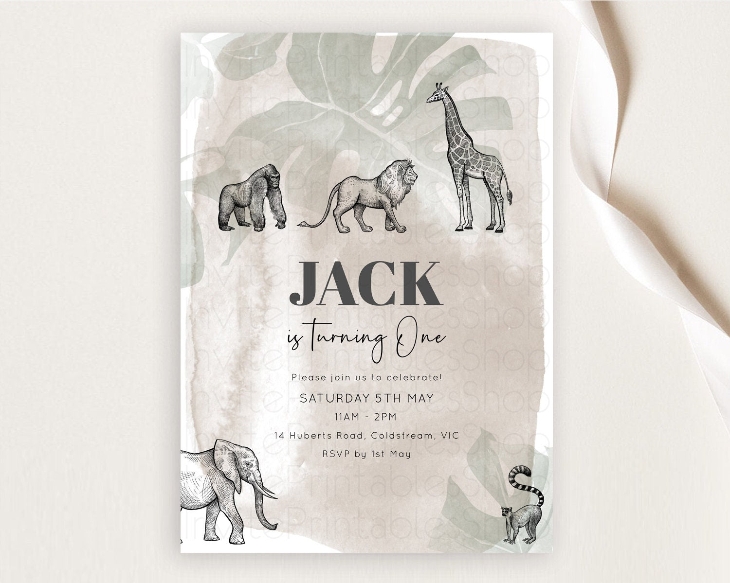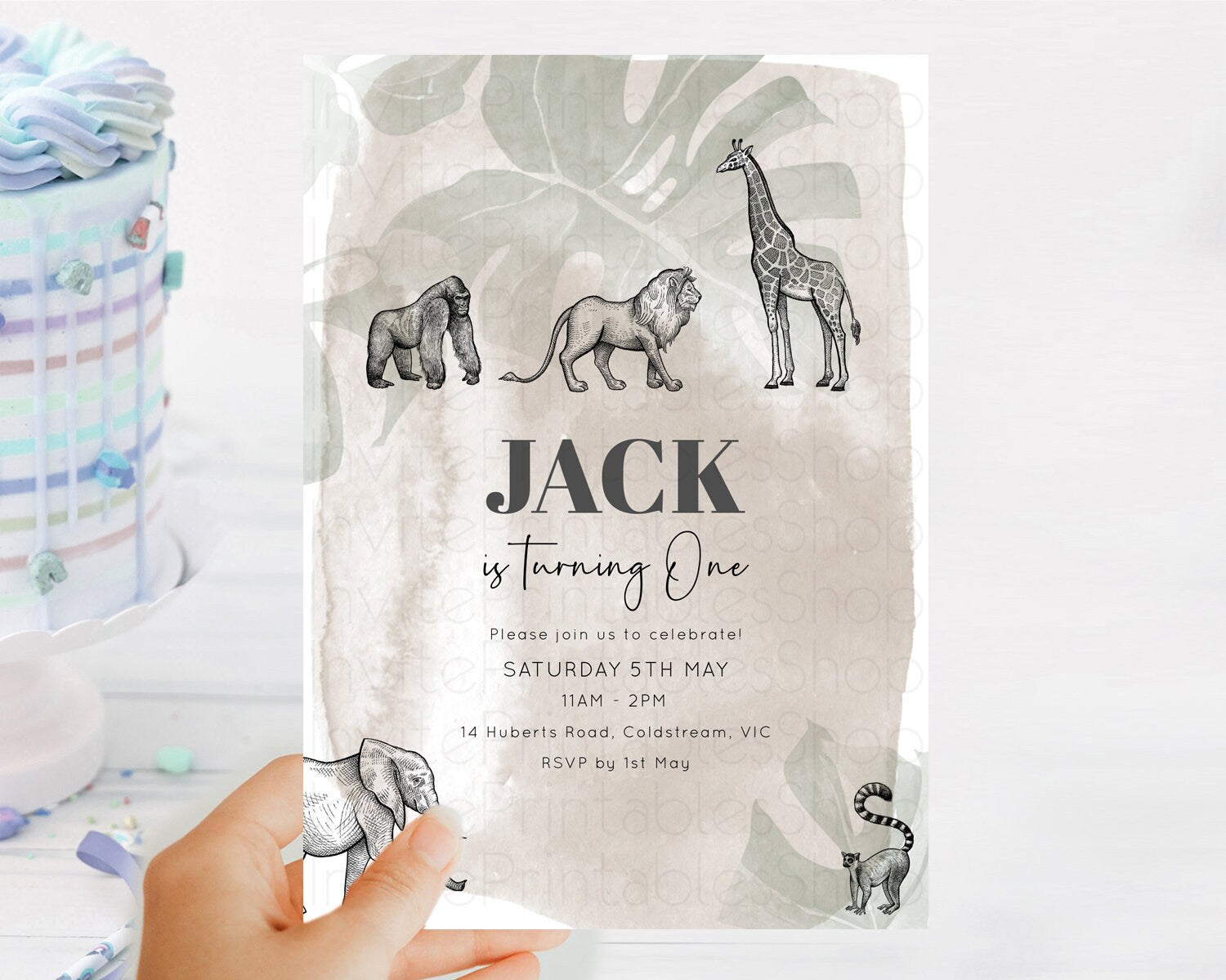 Safari Birthday Invitation Lion Gorilla Elephant Rhino Tropical Palm Jungle Safari Adventure Zoo Party Animal 2nd 1st First Birthday D10822