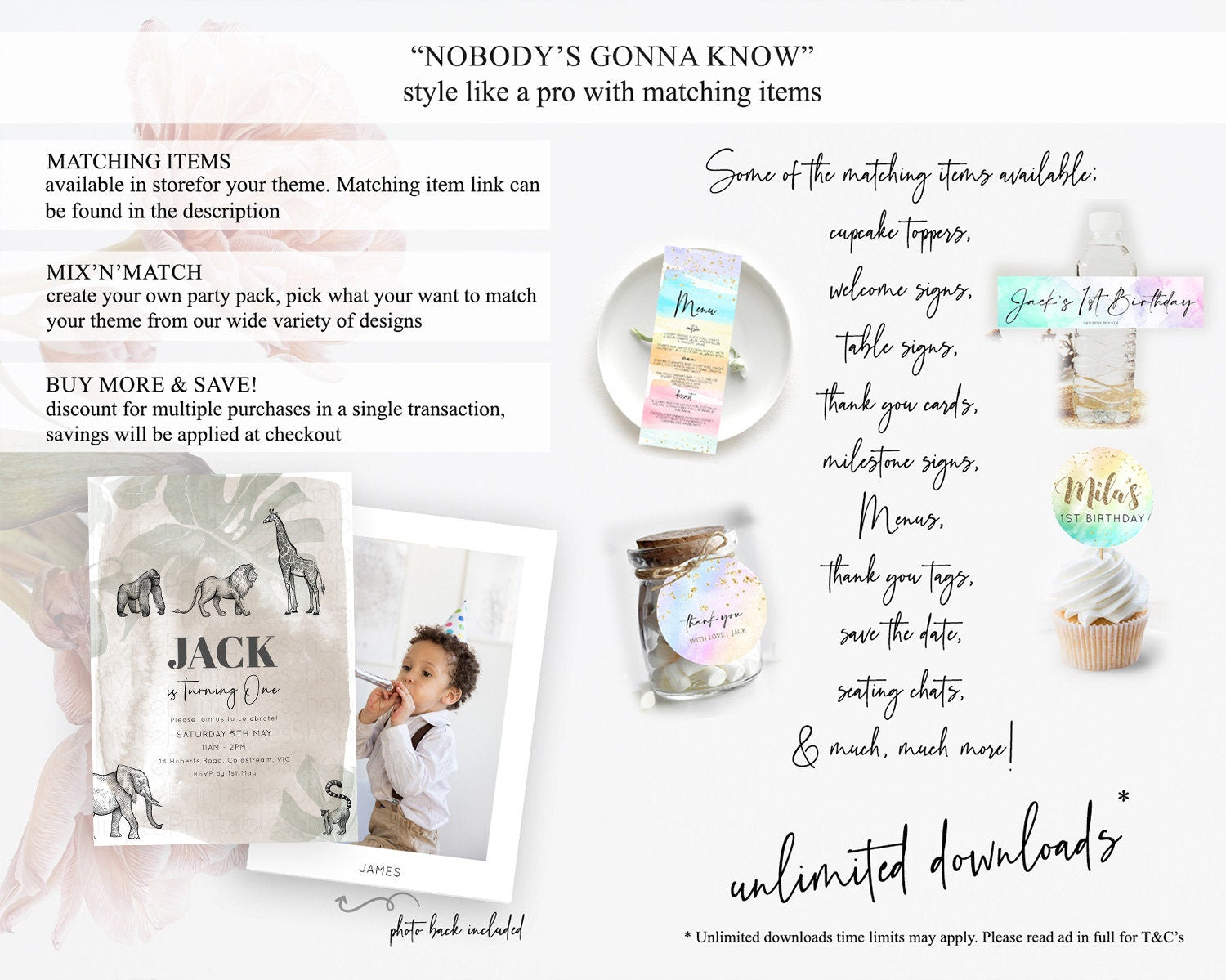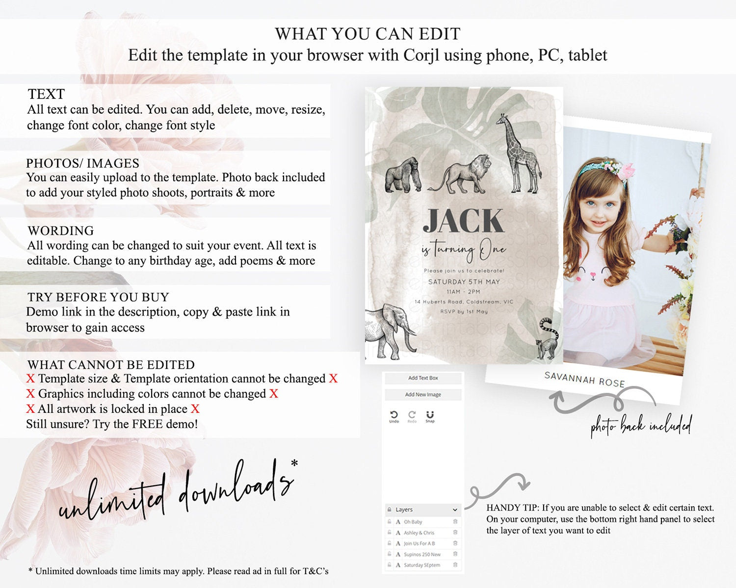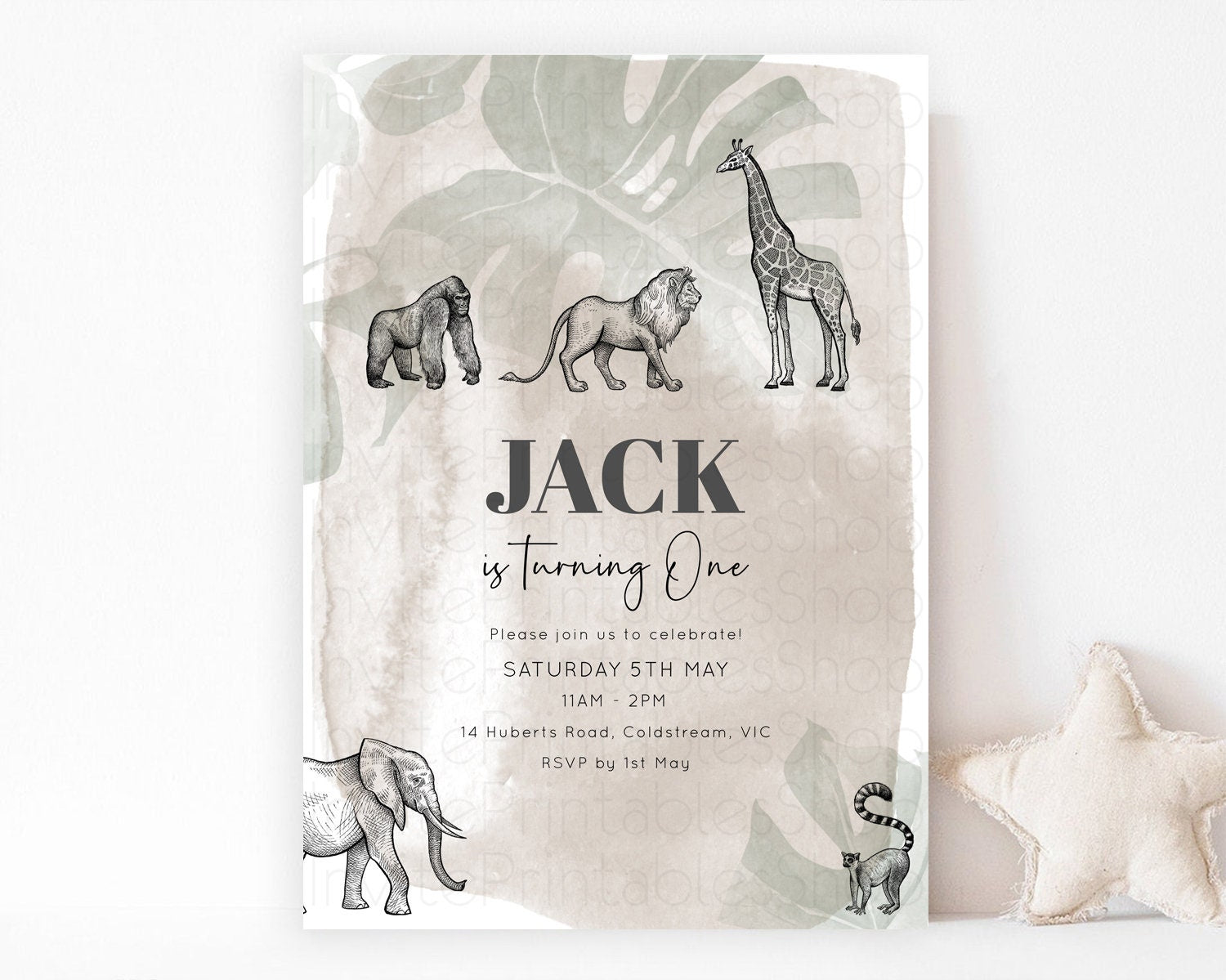 Safari Birthday Invitation Lion Gorilla Elephant Rhino Tropical Palm Jungle Safari Adventure Zoo Party Animal 2nd 1st First Birthday D10822