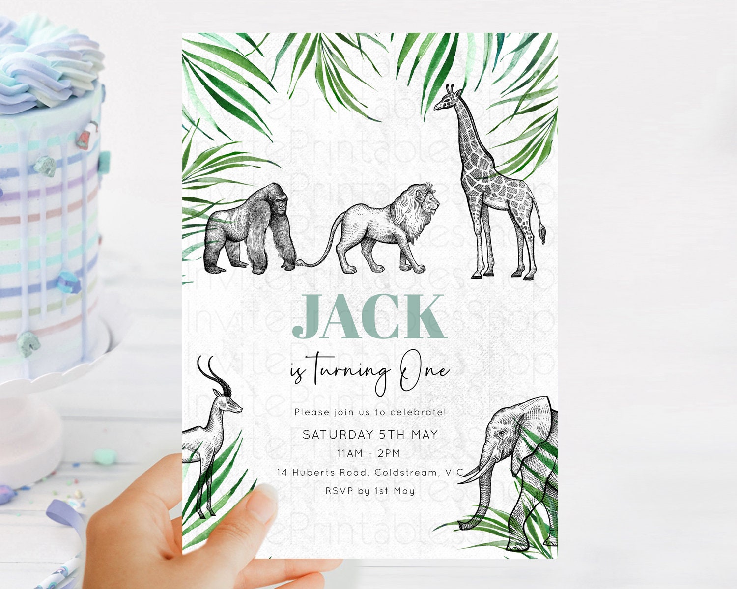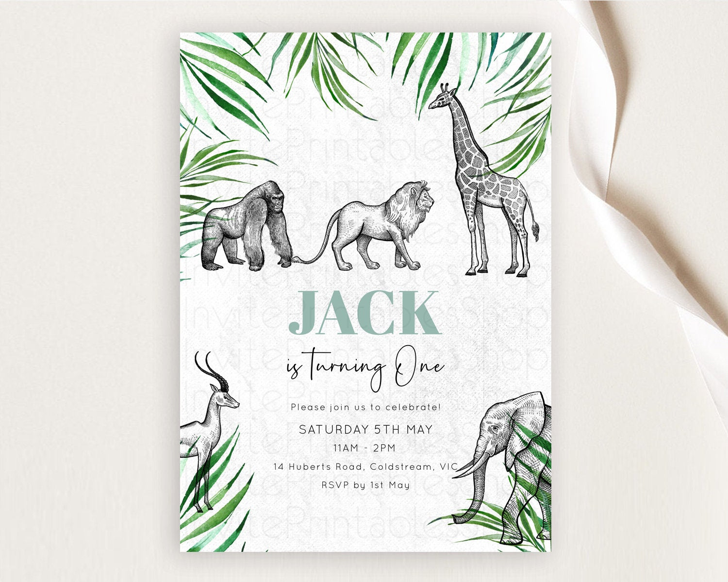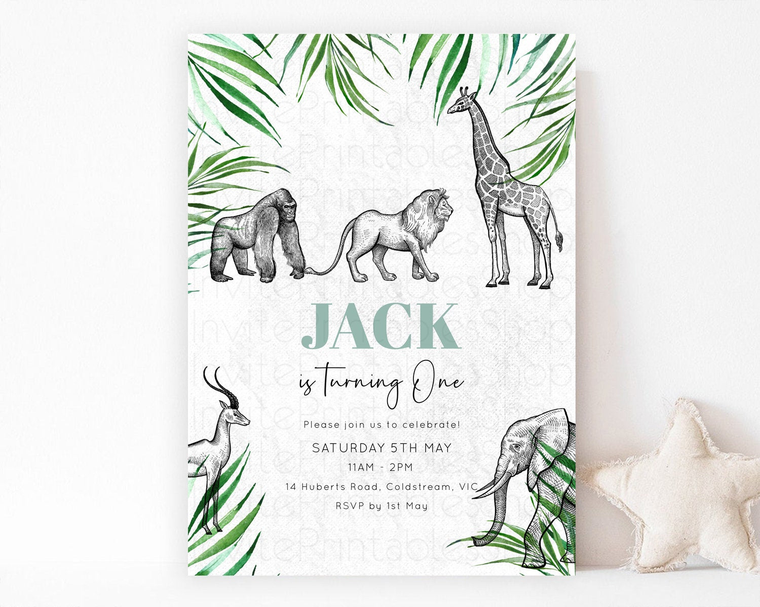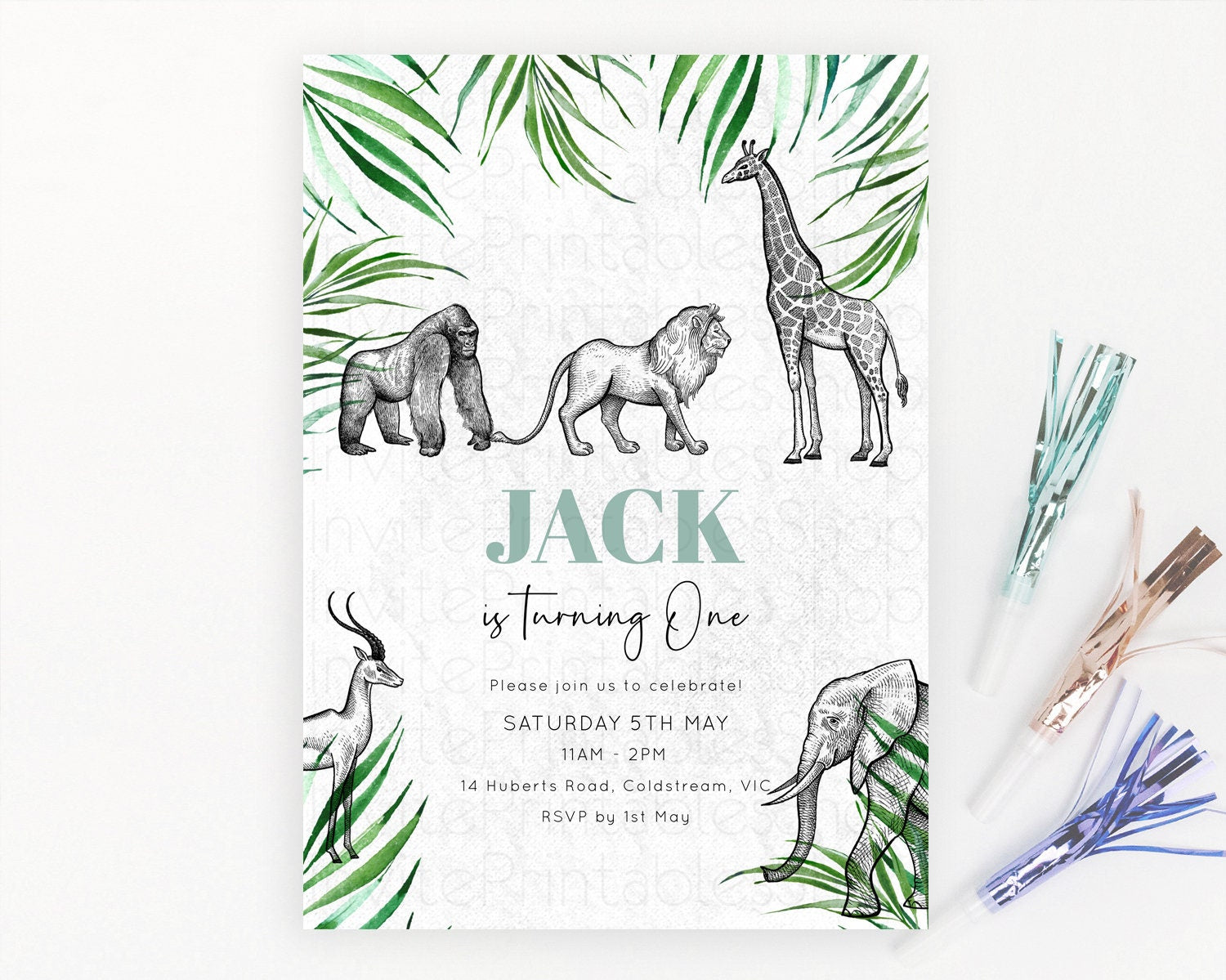 Safari Birthday Invitation Lion Gorilla Elephant Rhino Tropical Palm Jungle Safari Adventure Zoo Party Animal 2nd 1st First Birthday D10853