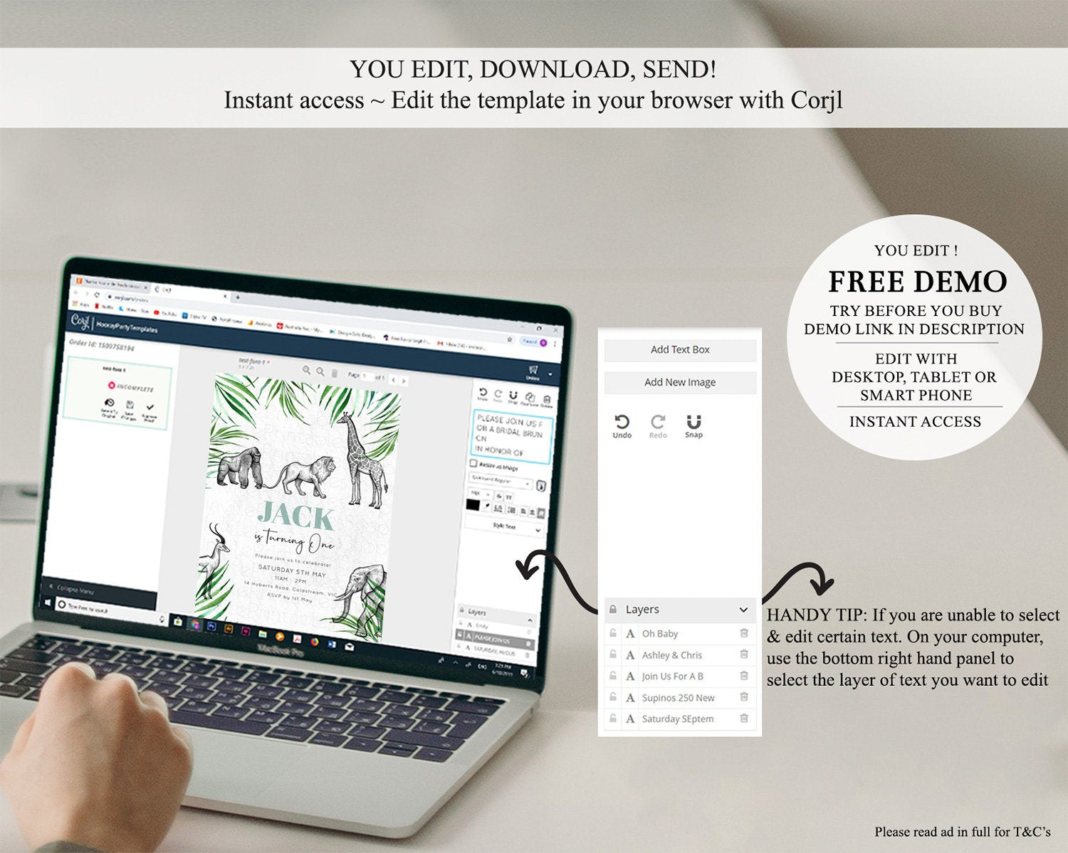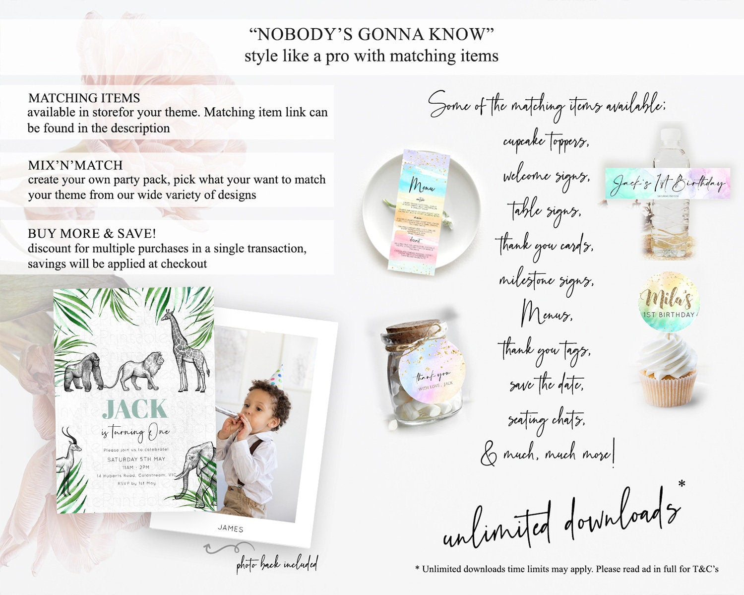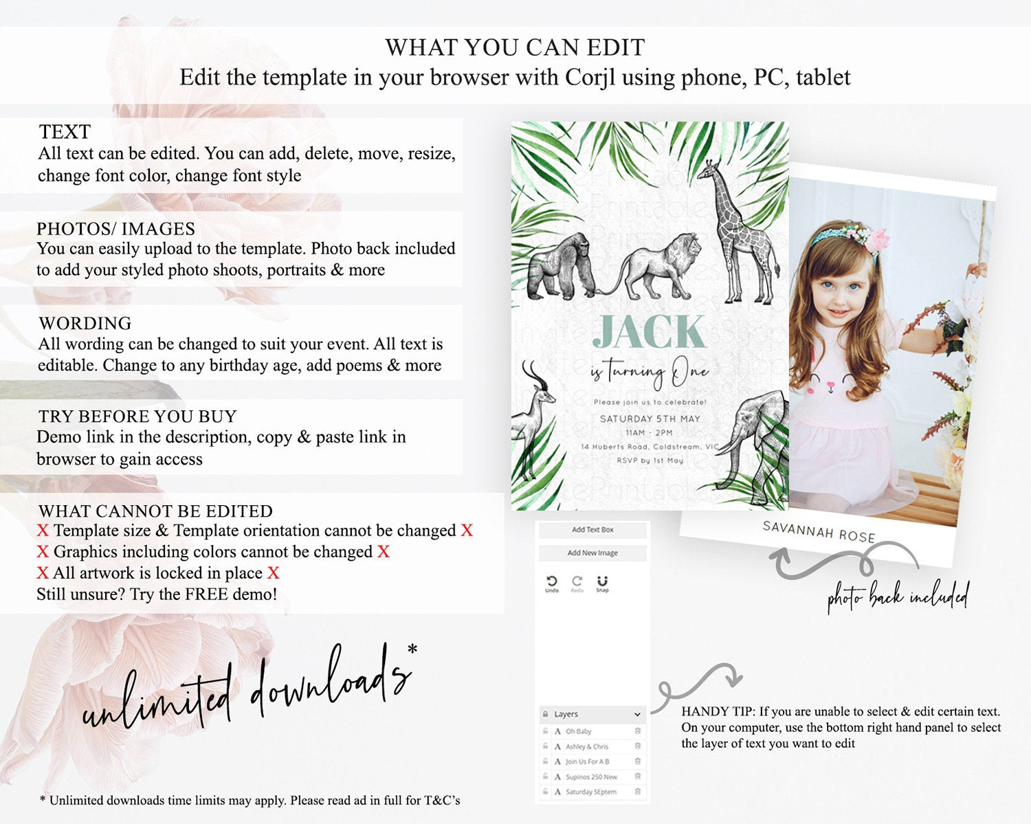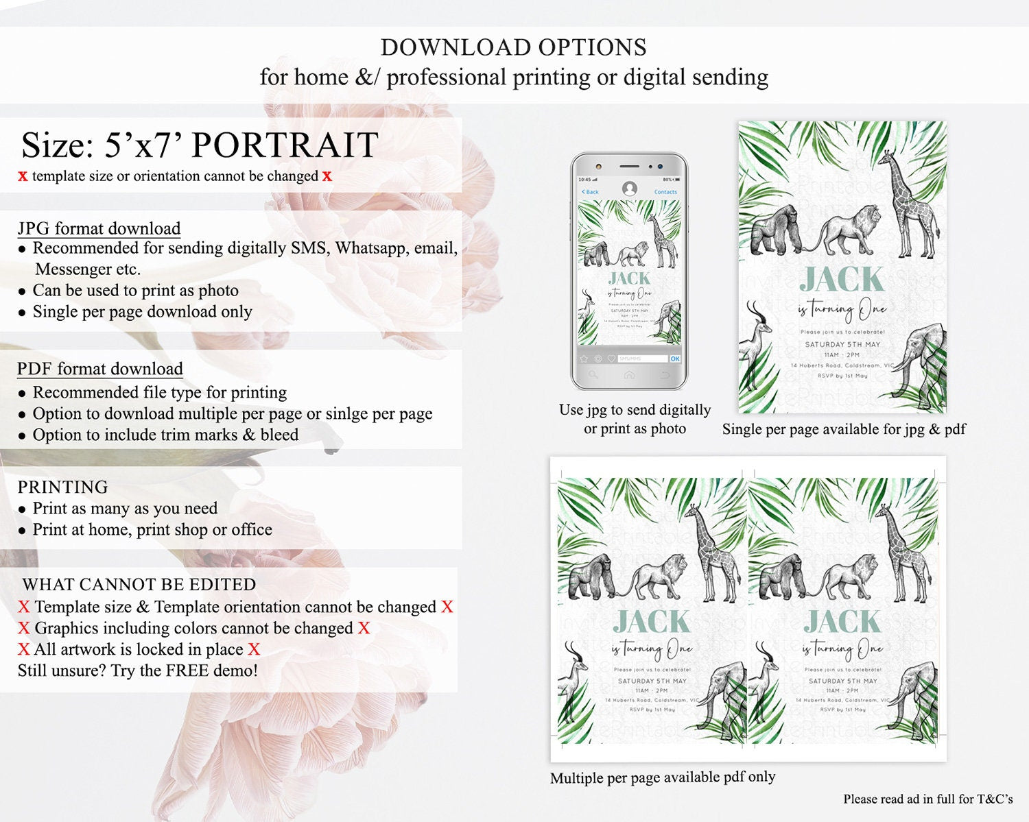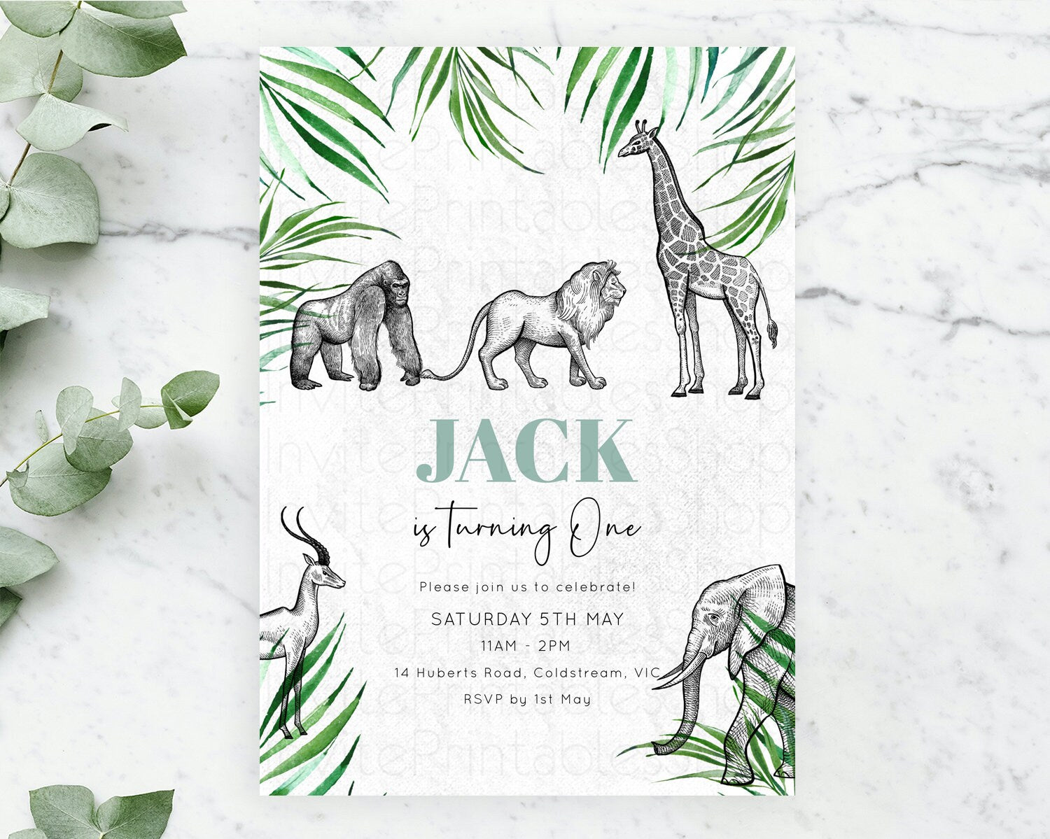 Safari Birthday Invitation Lion Gorilla Elephant Rhino Tropical Palm Jungle Safari Adventure Zoo Party Animal 2nd 1st First Birthday D10853